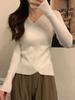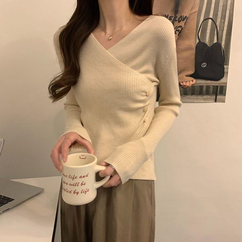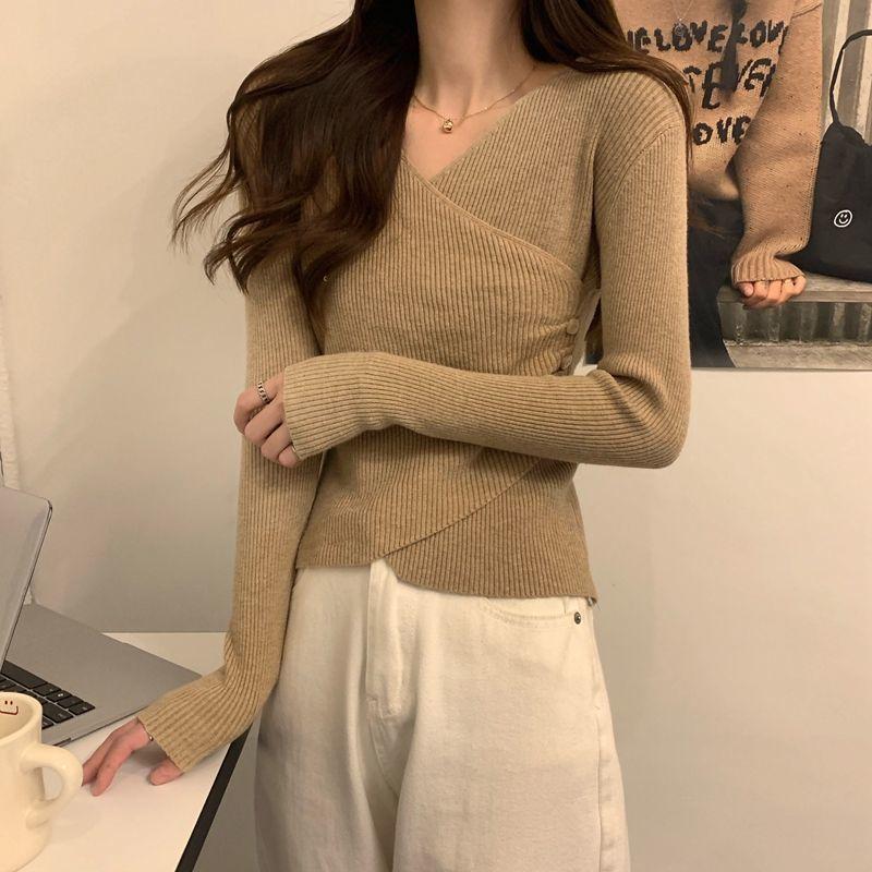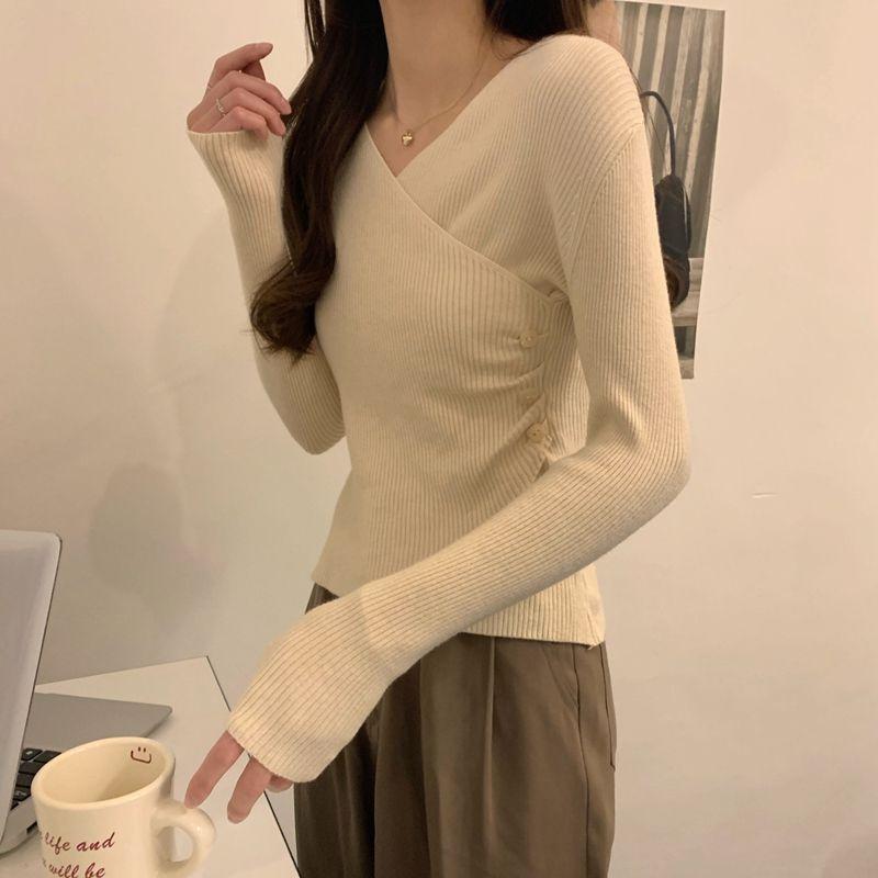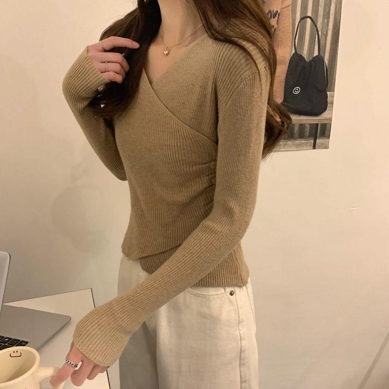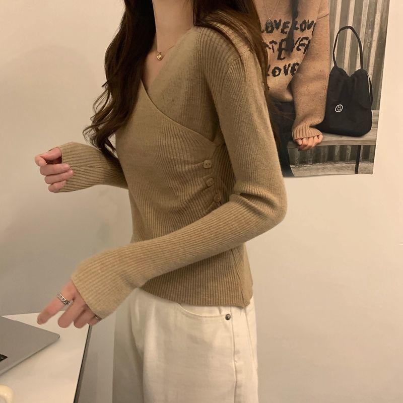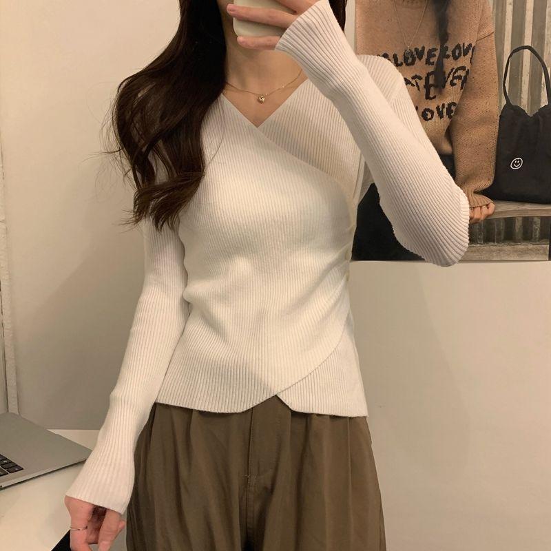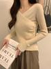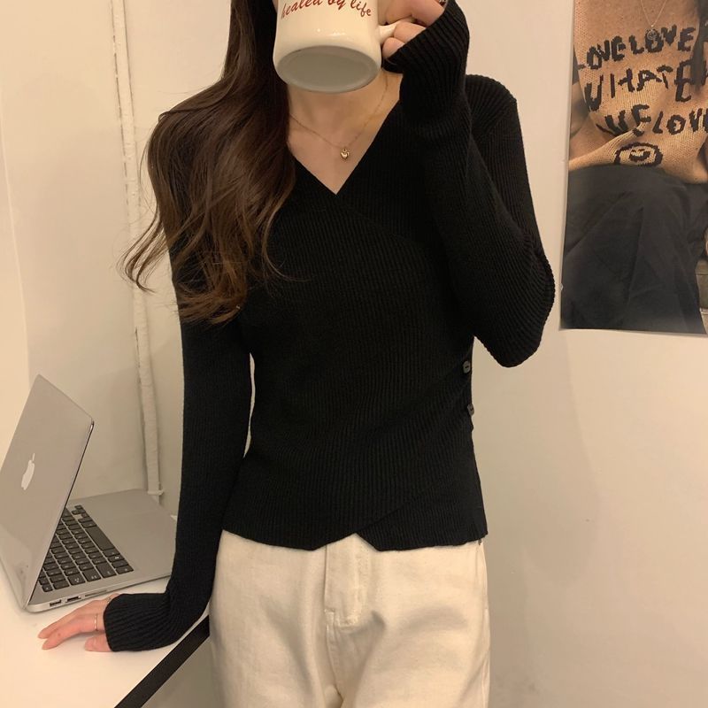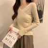 Compra Suéter de cuello en V para mujer, otoño e invierno 2024, nueva camisa interior ajustada de manga larga, top de punto fino y ajustado negro al por mayor en Joom.pro