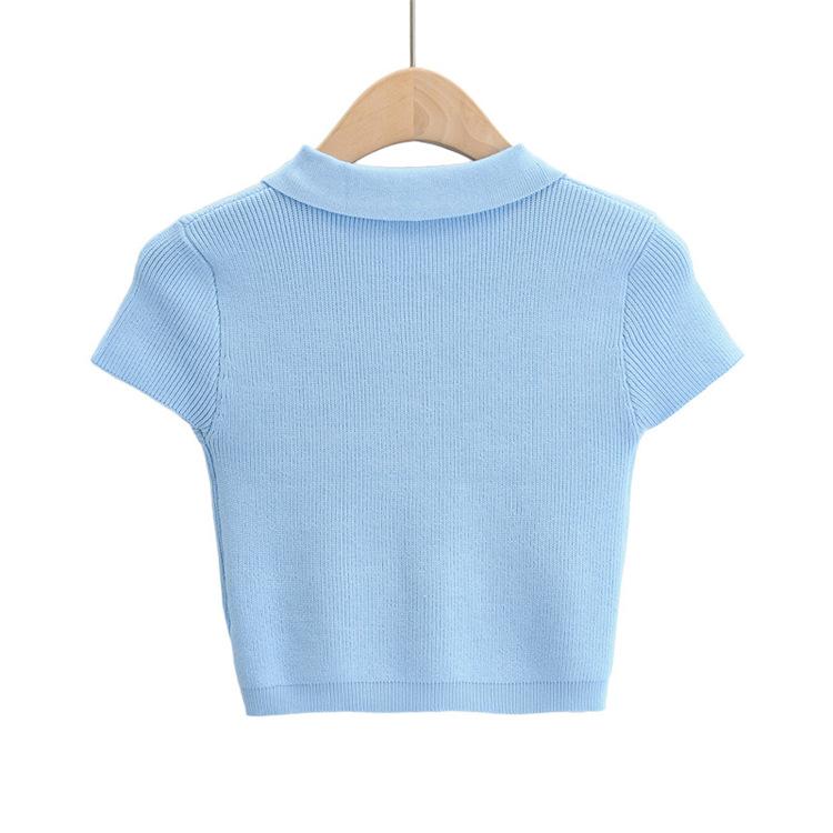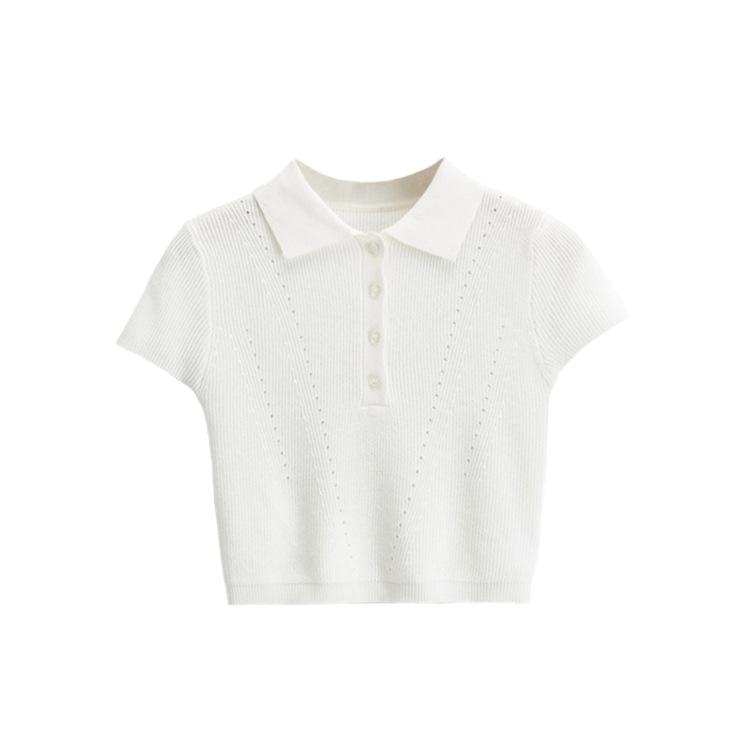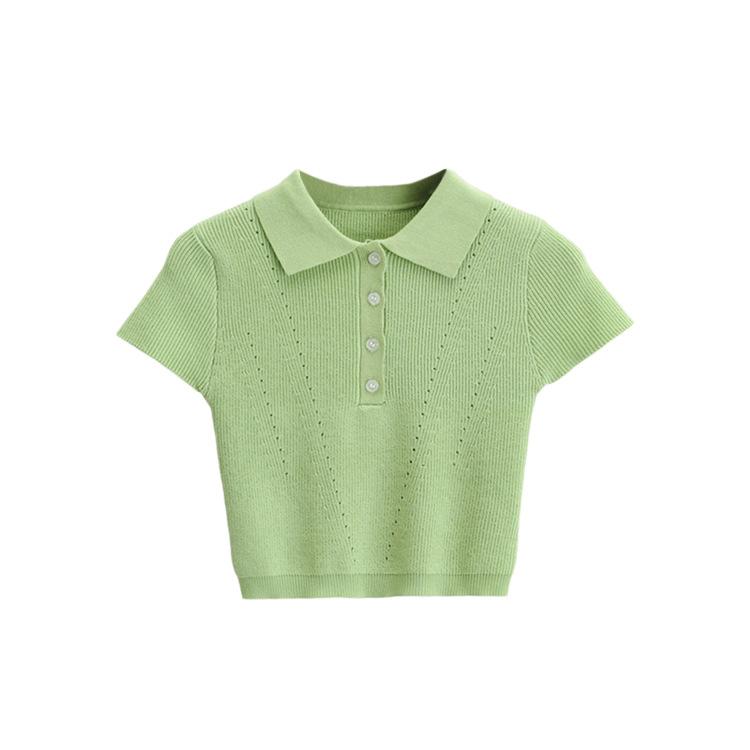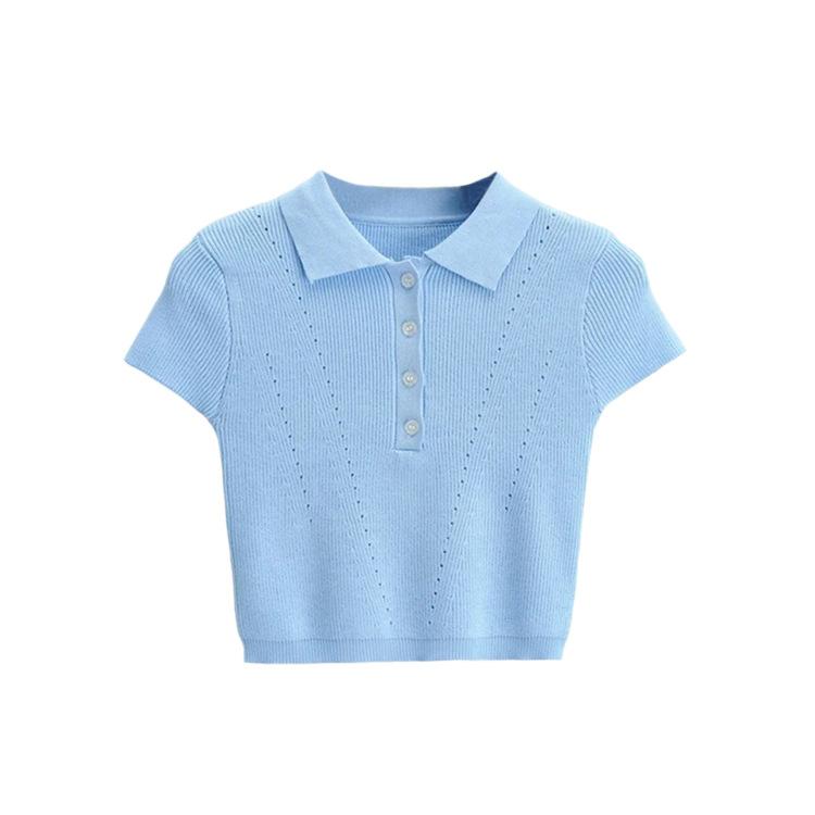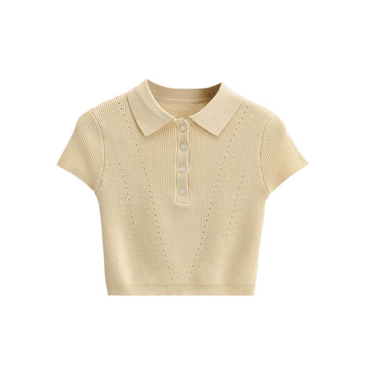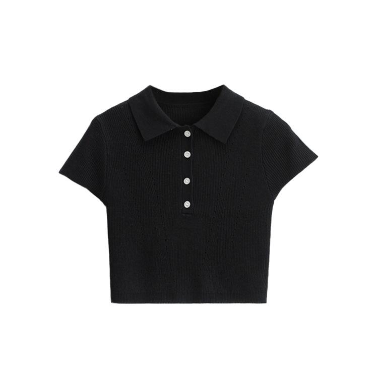 Camiseta de manga corta de punto con cuello tipo polo y agujeros para mujer, estilo retro europeo y americano, ultracorta, ajustada, de color liso, con ombligo al descubierto