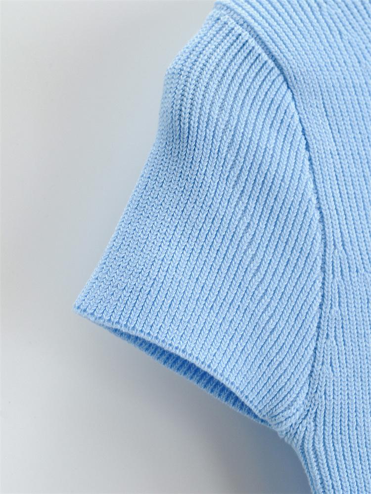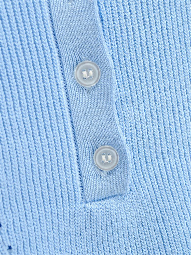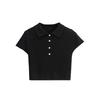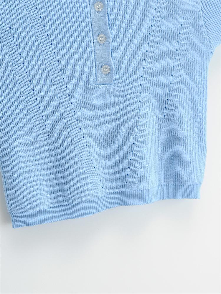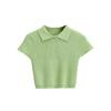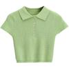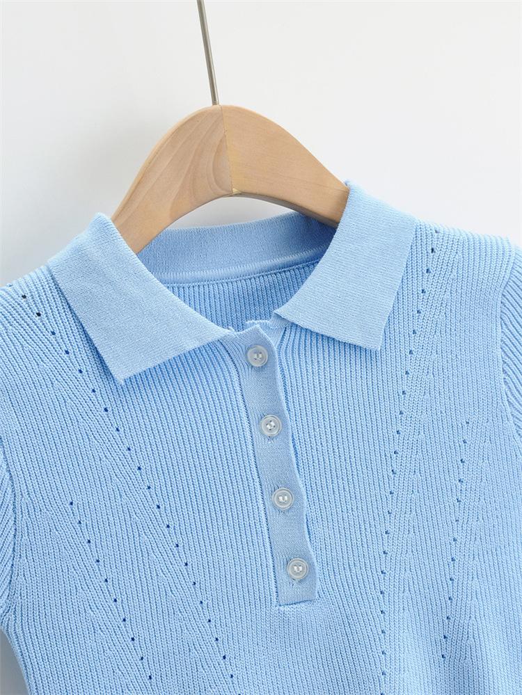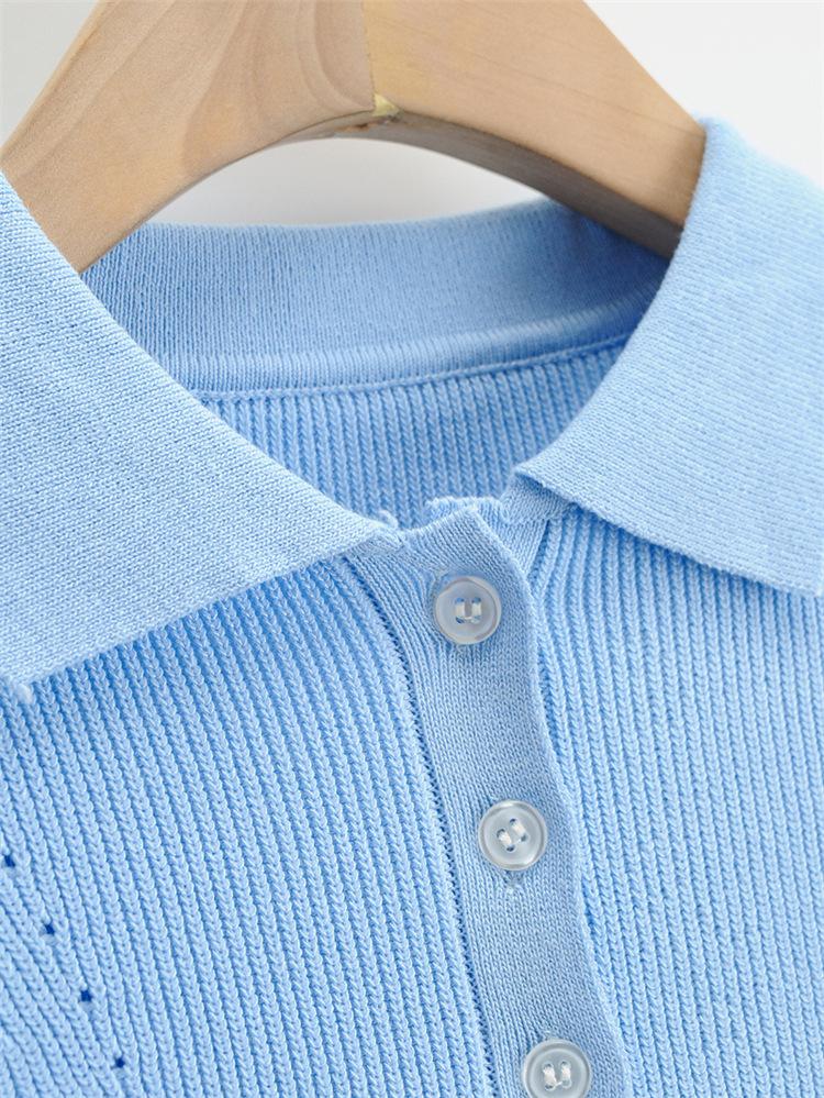 Camiseta de manga corta de punto con cuello tipo polo y agujeros para mujer, estilo retro europeo y americano, ultracorta, ajustada, de color liso, con ombligo al descubierto