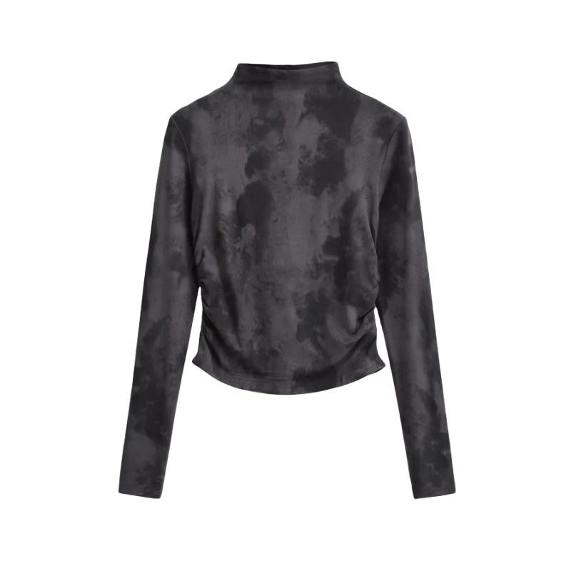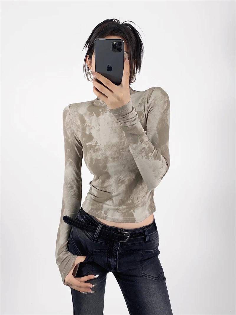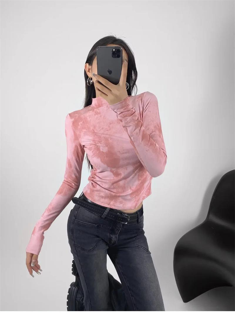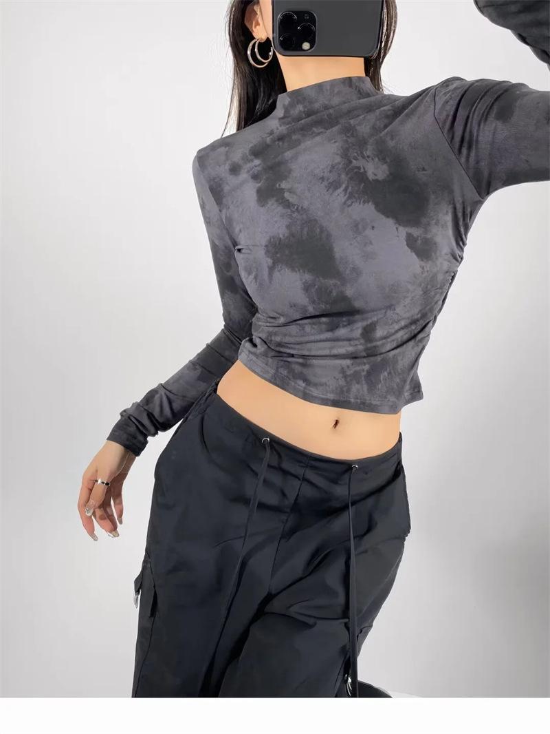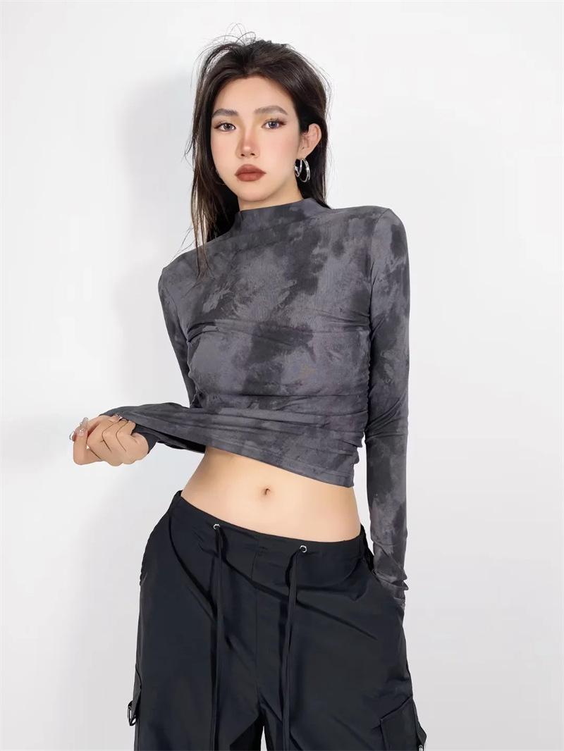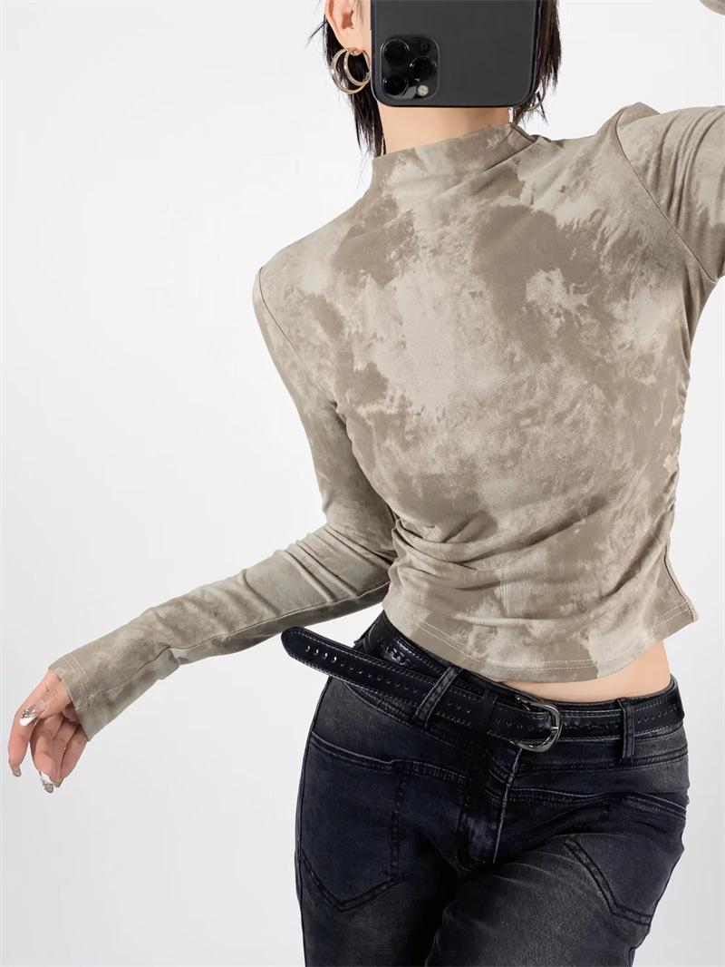Top Camiseta Base de Manga Larga con Cuello Medio Alto para Chica Caliente Estilo Europeo y Americano Retro Estampado Tie-Dye Ajustado Elástico Plisado Corto