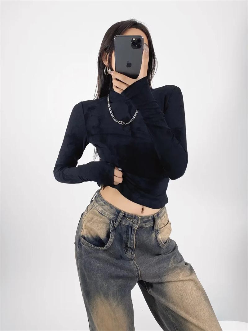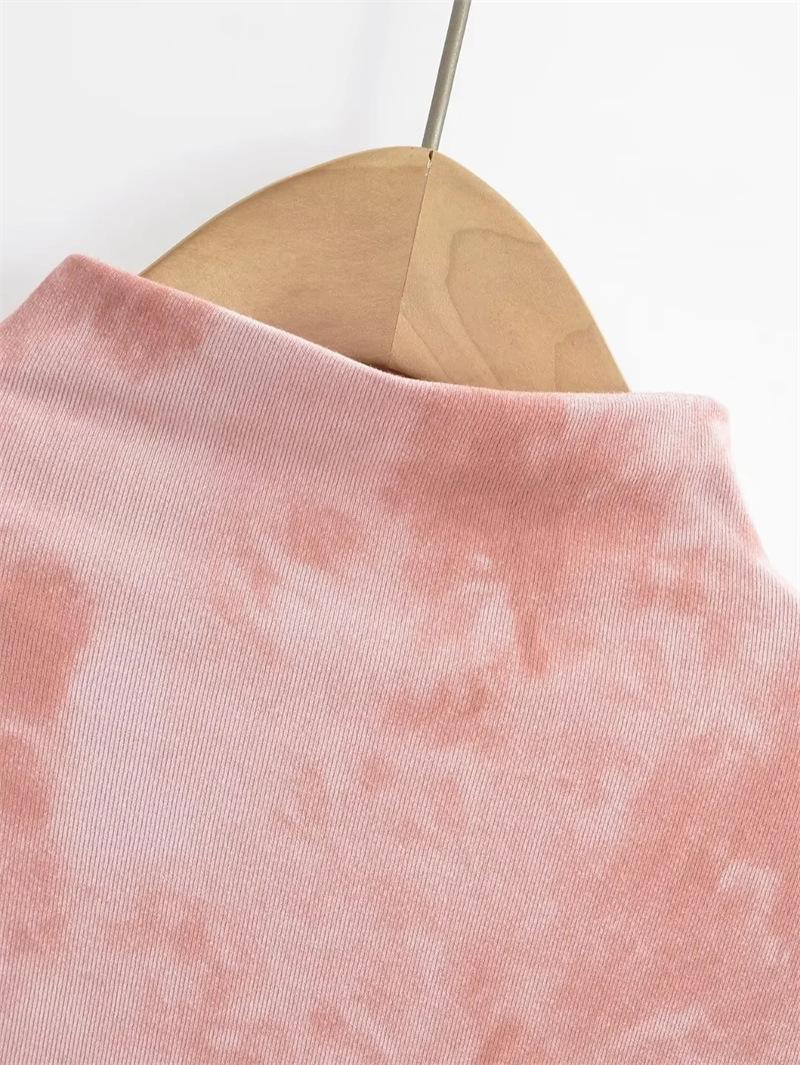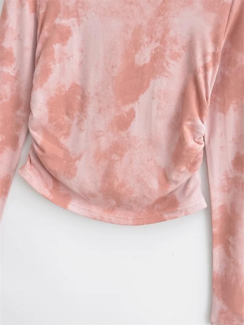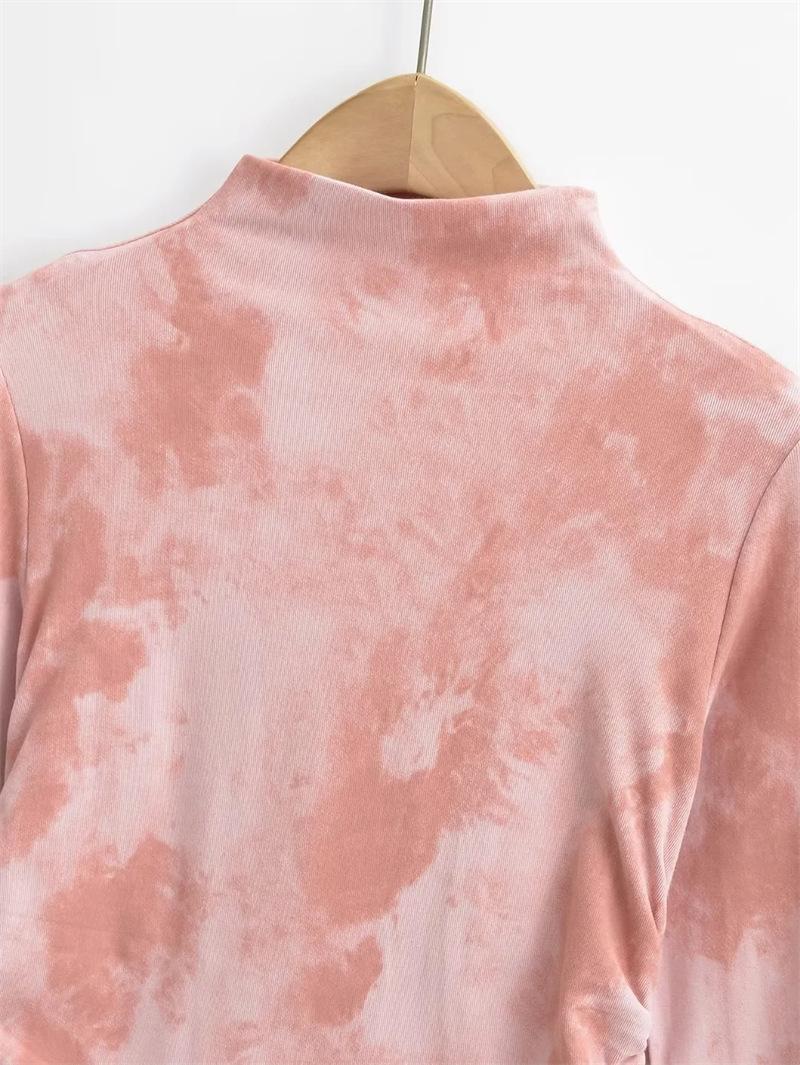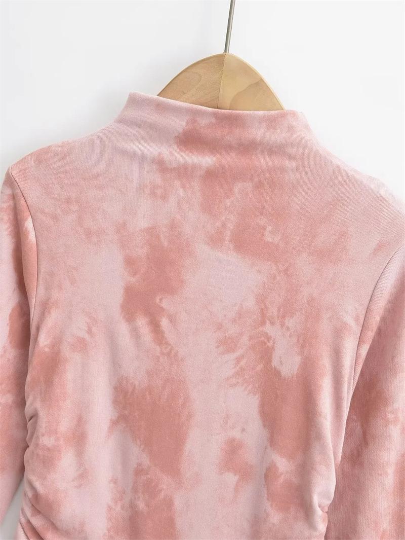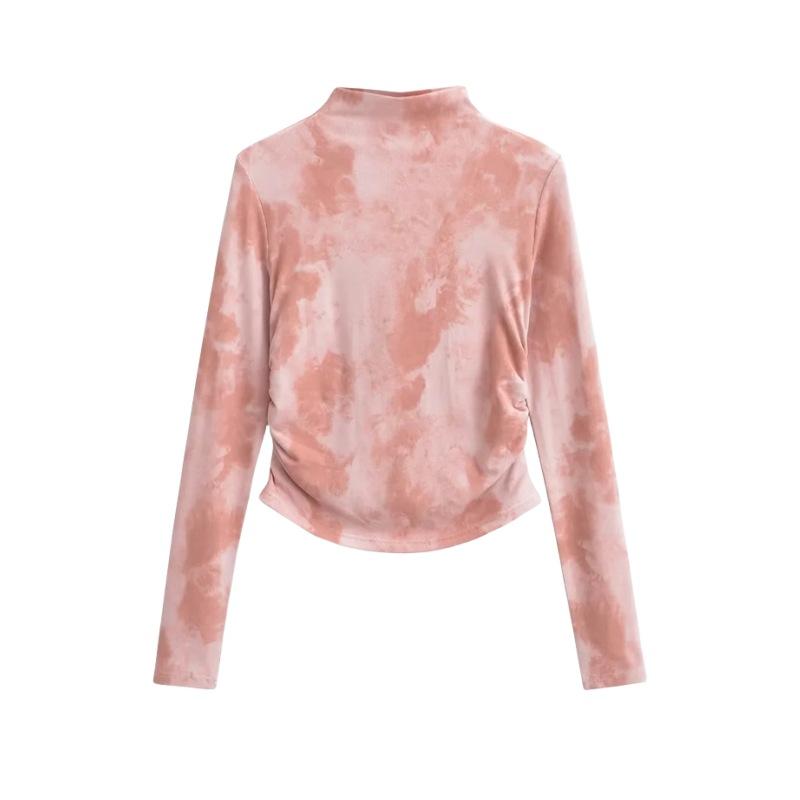 Top Camiseta Base de Manga Larga con Cuello Medio Alto para Chica Caliente Estilo Europeo y Americano Retro Estampado Tie-Dye Ajustado Elástico Plisado Corto