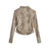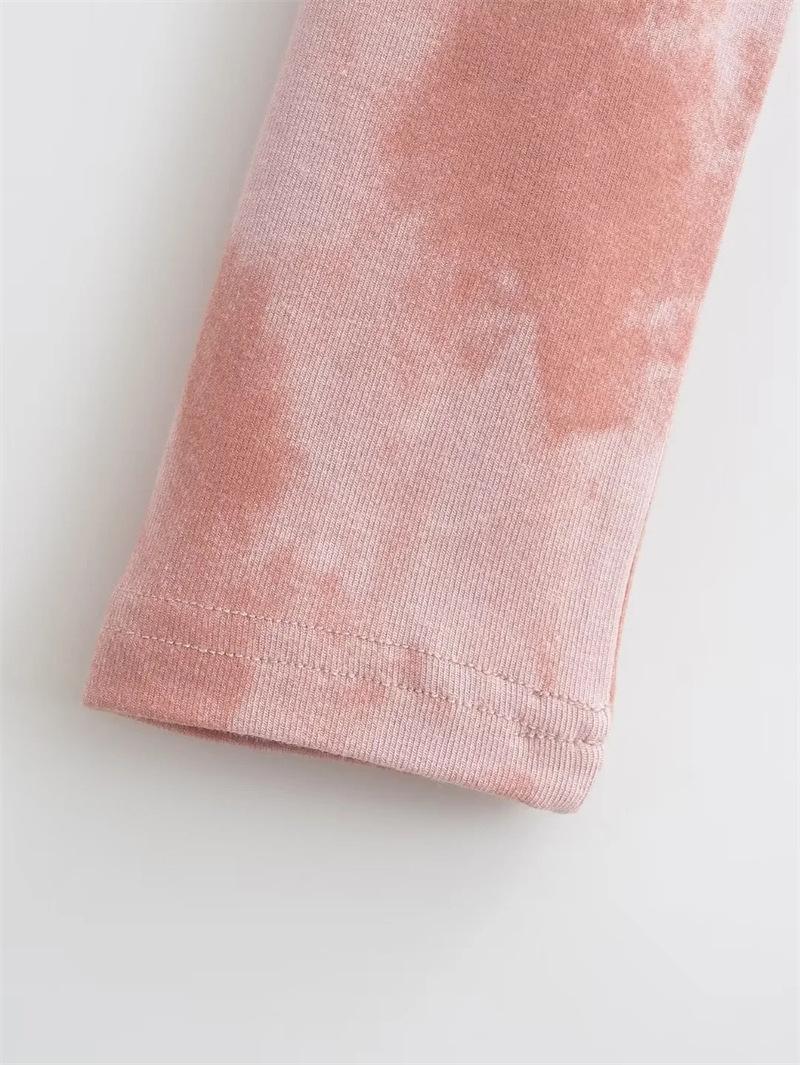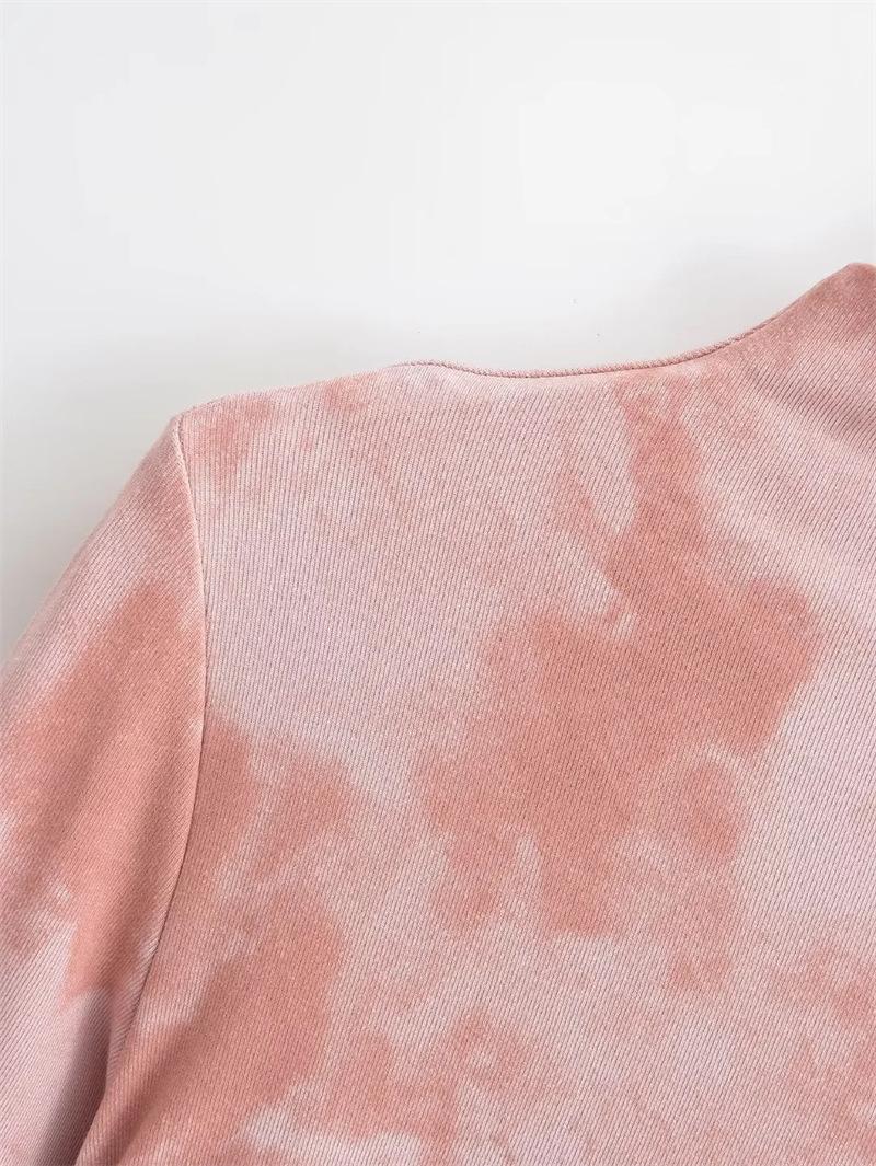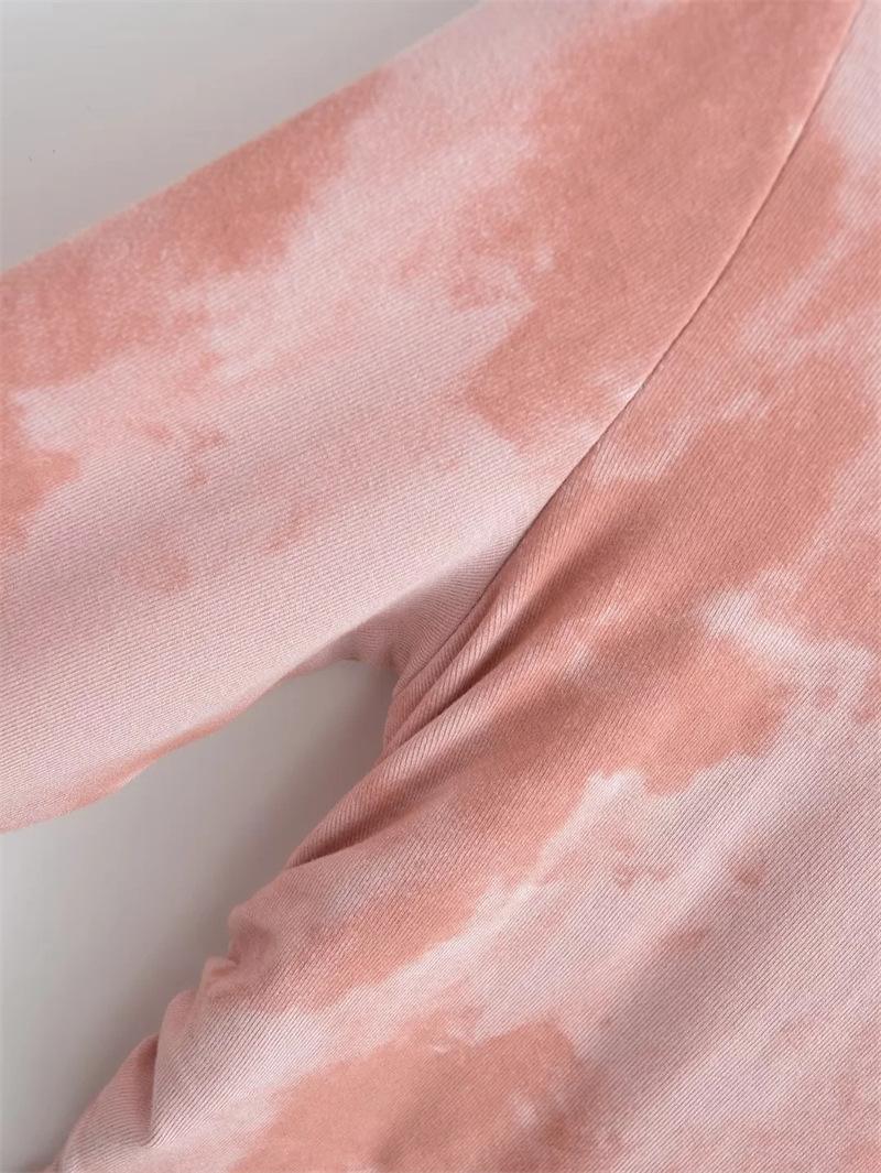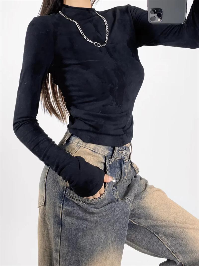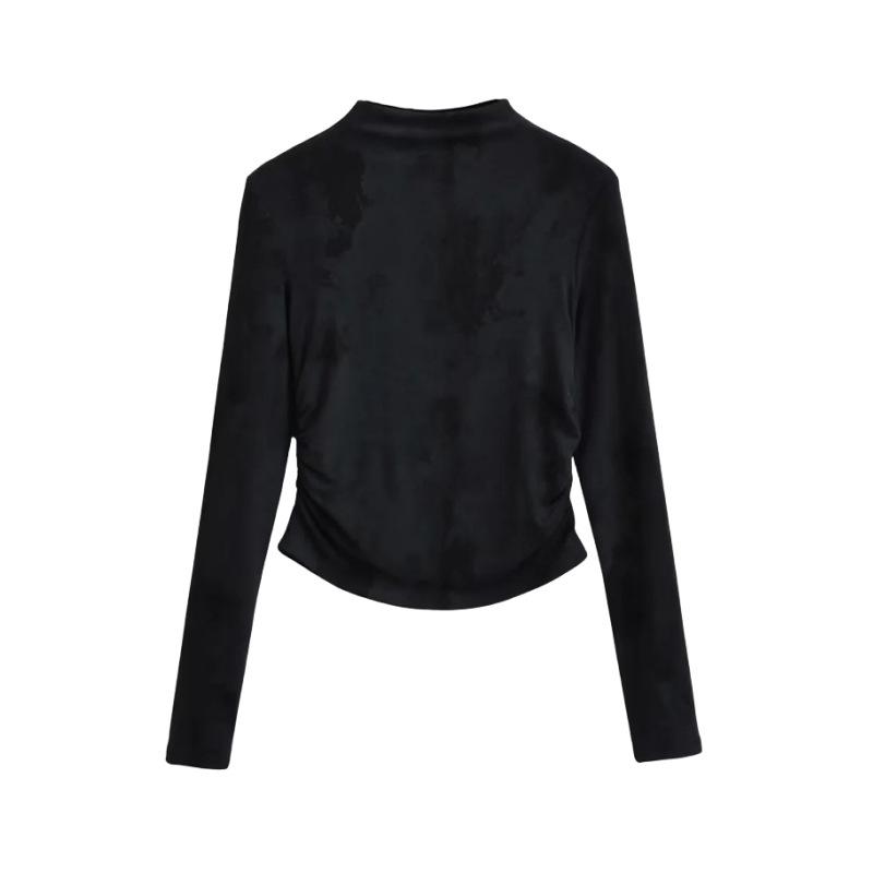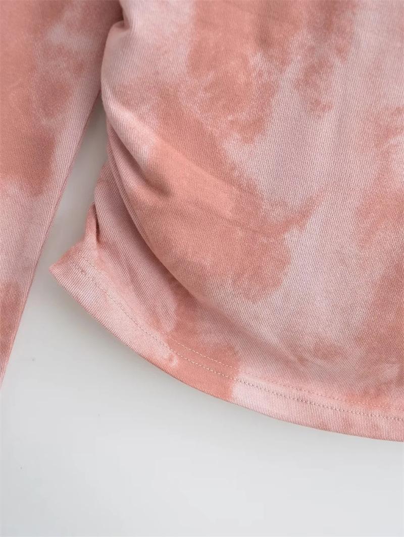 Top Camiseta Base de Manga Larga con Cuello Medio Alto para Chica Caliente Estilo Europeo y Americano Retro Estampado Tie-Dye Ajustado Elástico Plisado Corto