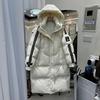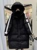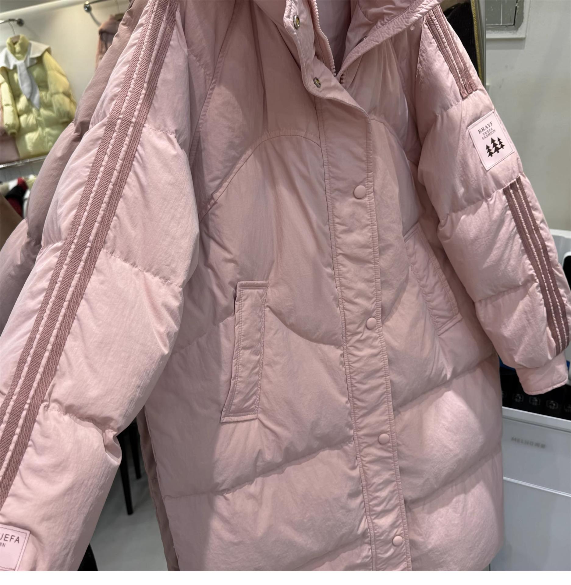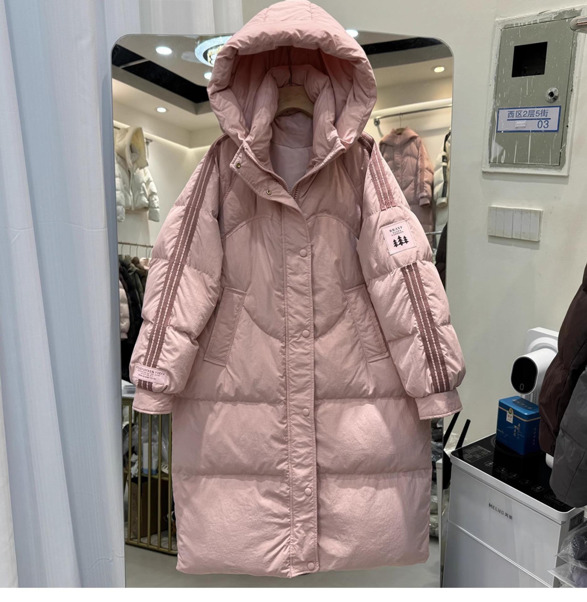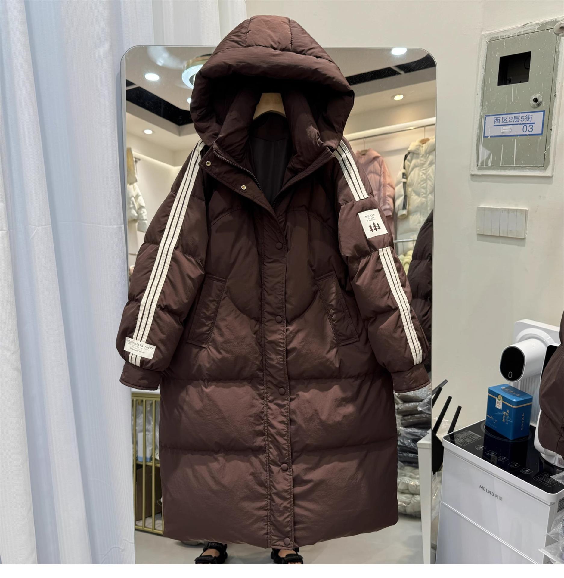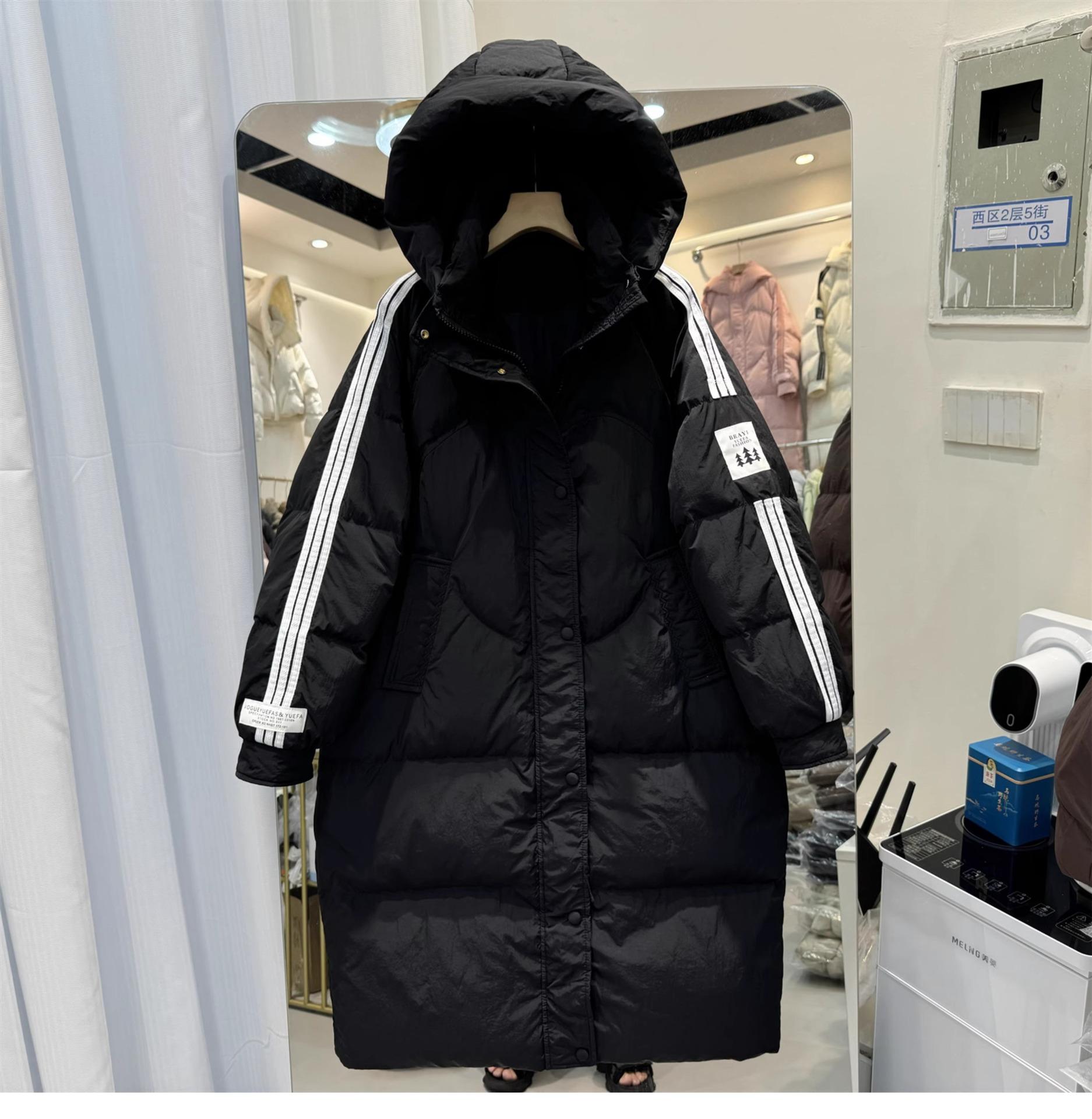 Invierno 2025 Nuevo Chaqueta Larga Acolchada con Capucha para Mujer Sobre la Rodilla Deportiva a Rayas Tres Árboles Gruesa Suelta Abrigo de Plumón de Pato