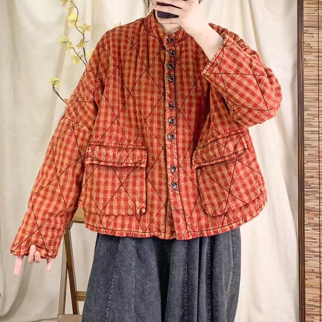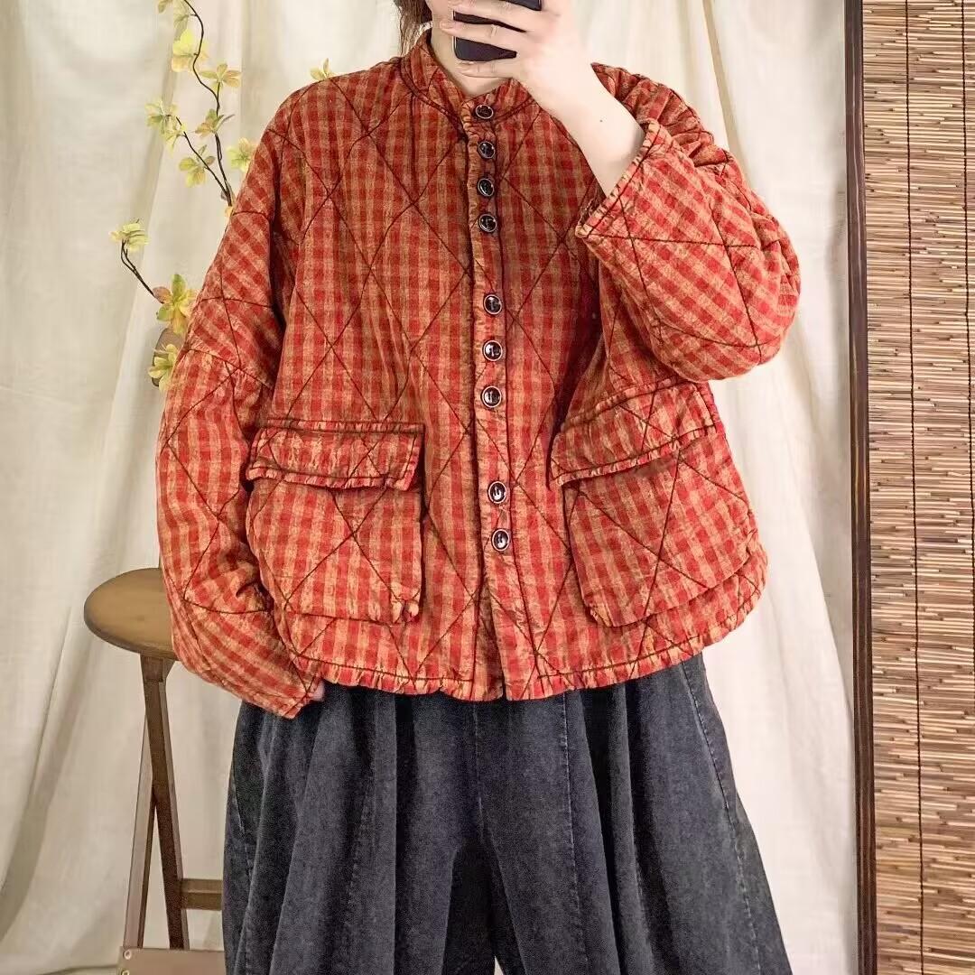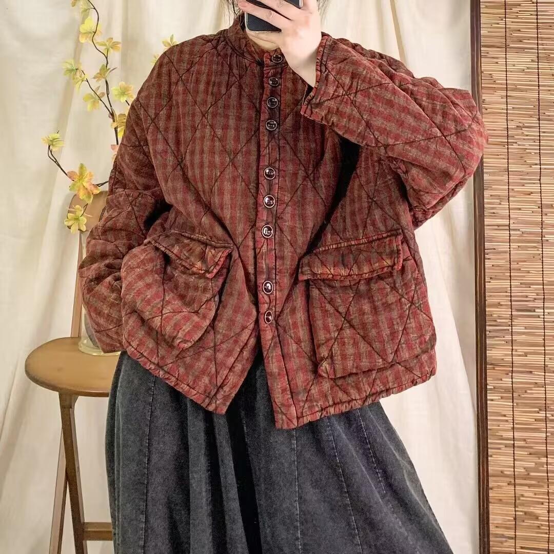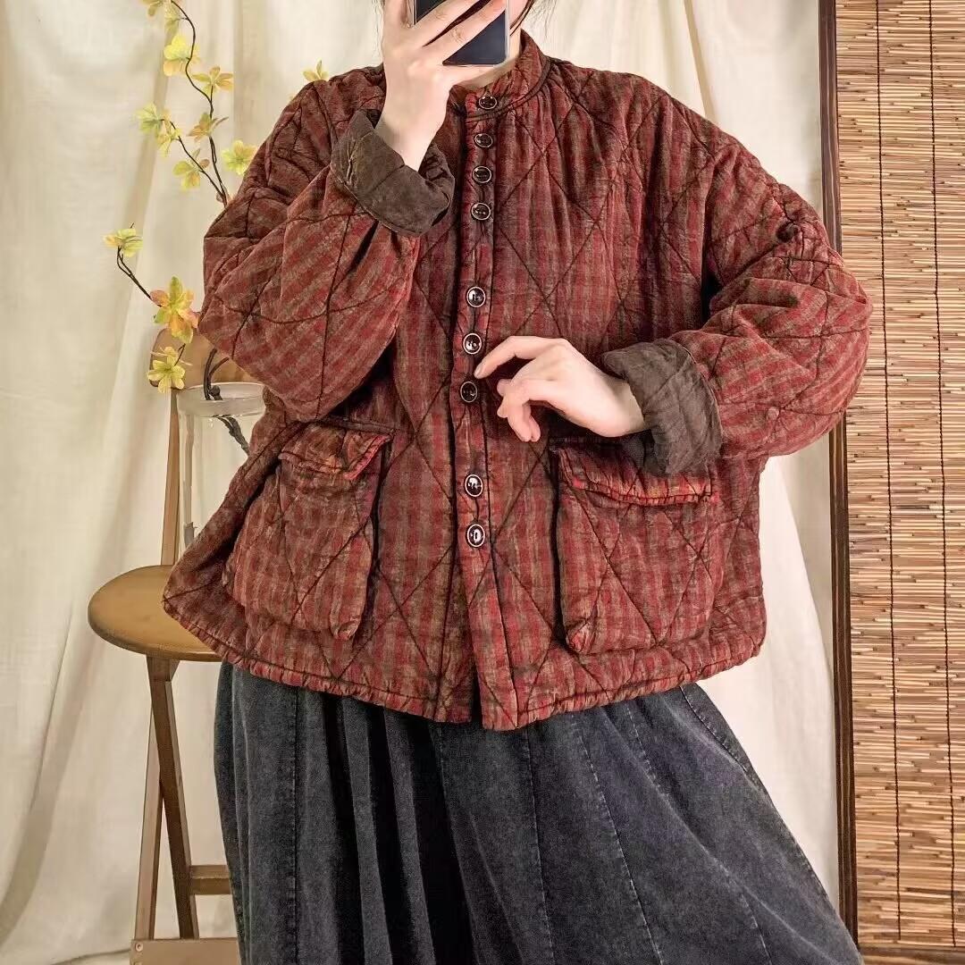 Chaqueta acolchada de algodón con cuadros de colores fritos para mujer, nueva chaqueta de invierno retro artística holgada de talla grande con contraste de color y doble bolsillo, cálida.