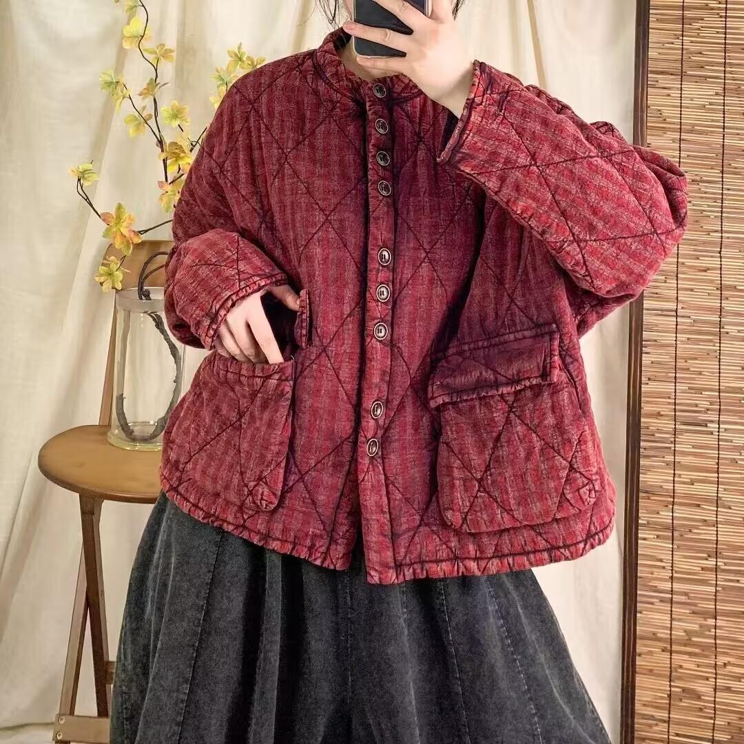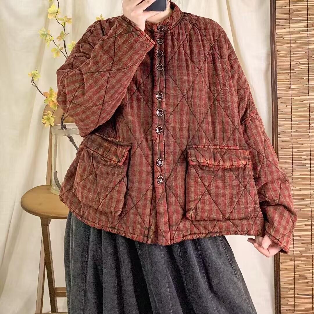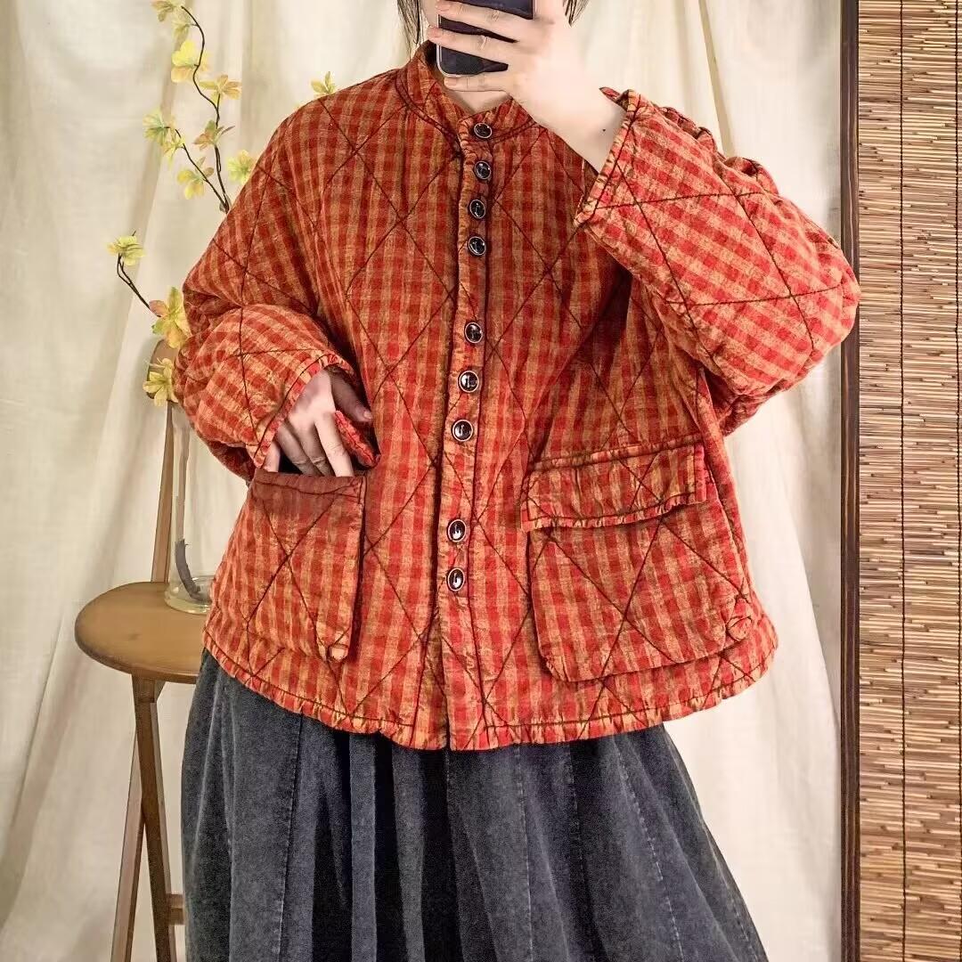 Chaqueta acolchada de algodón con cuadros de colores fritos para mujer, nueva chaqueta de invierno retro artística holgada de talla grande con contraste de color y doble bolsillo, cálida.