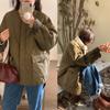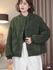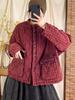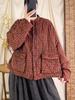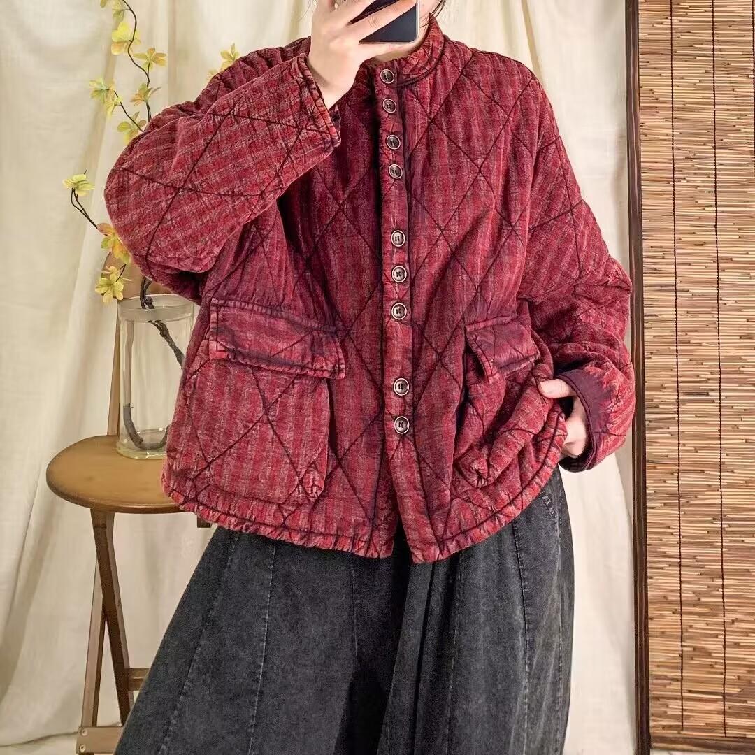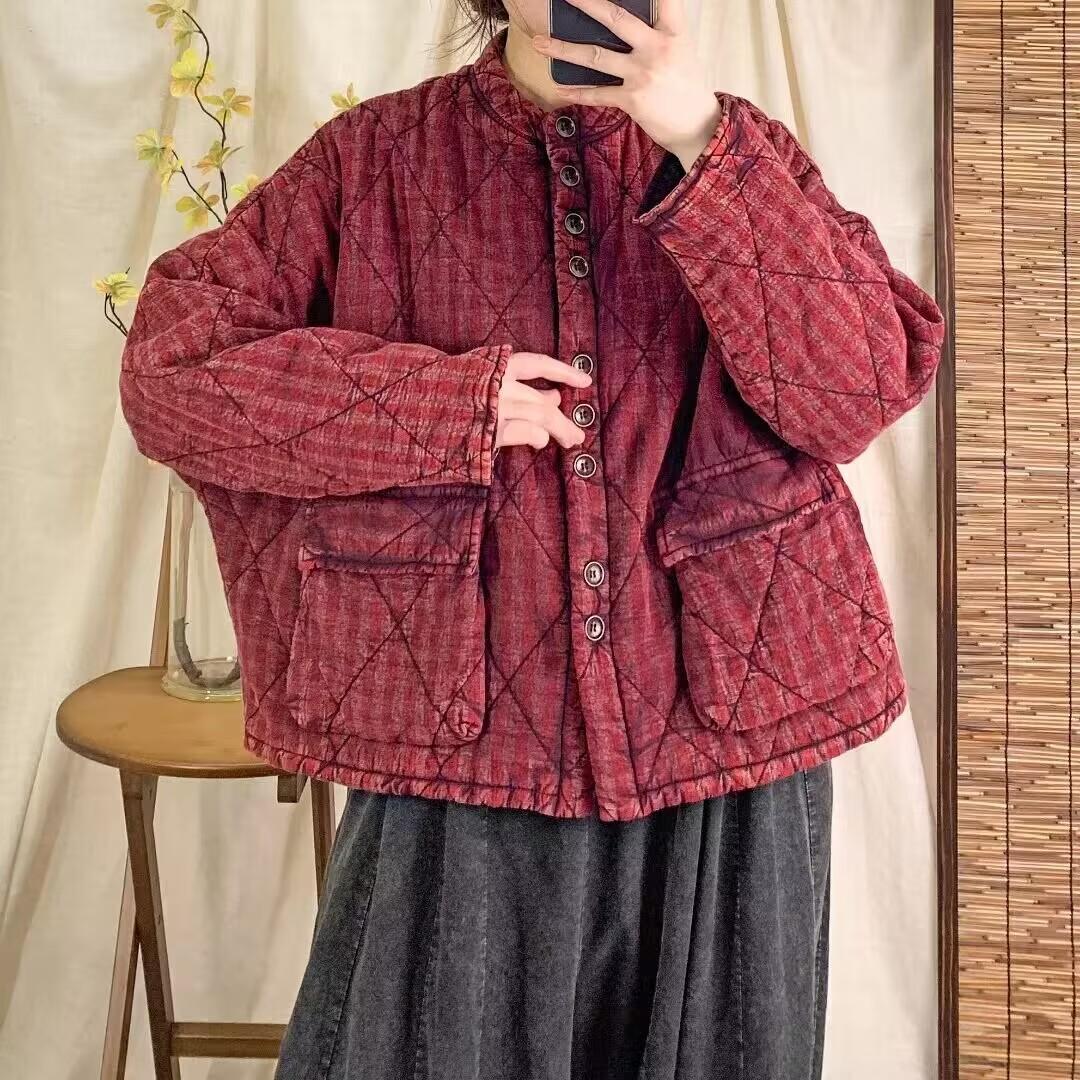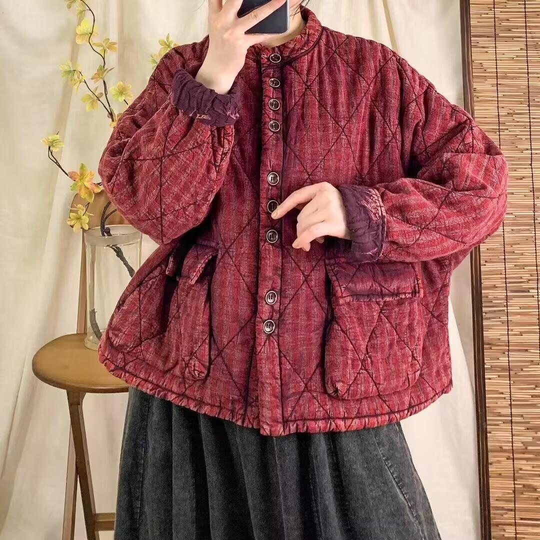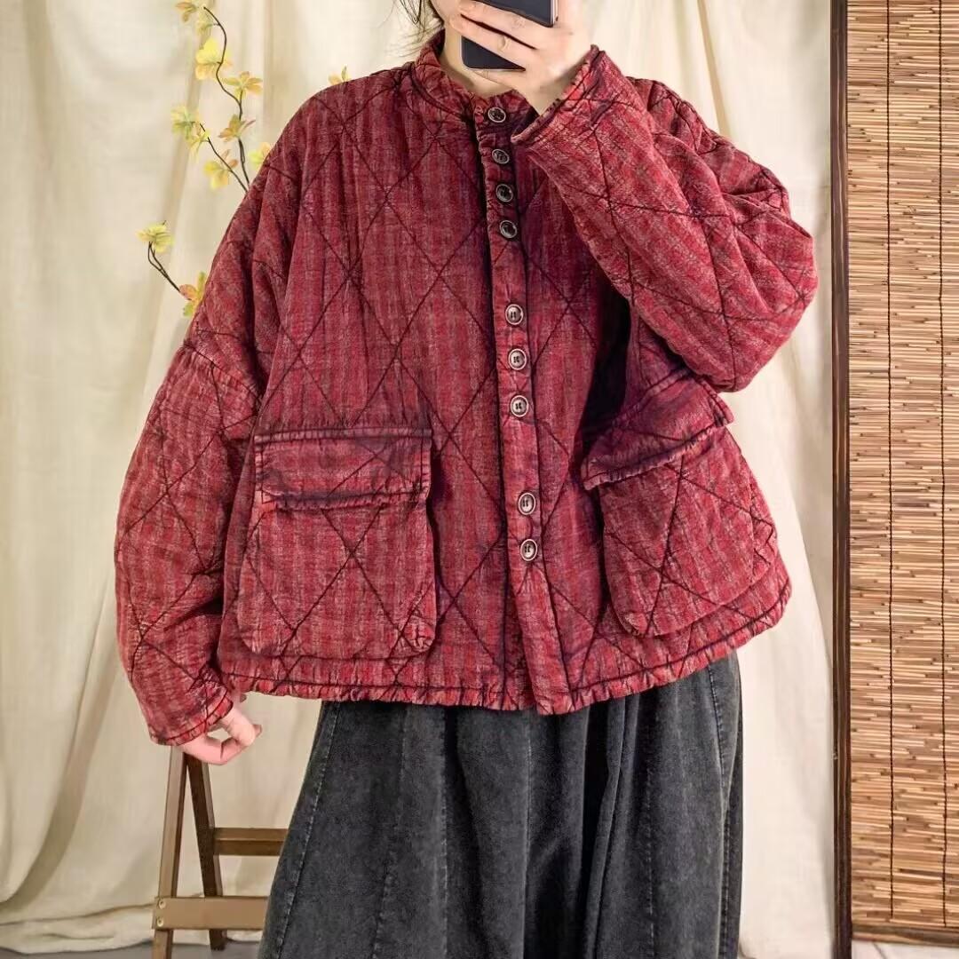 Chaqueta acolchada de algodón con cuadros de colores fritos para mujer, nueva chaqueta de invierno retro artística holgada de talla grande con contraste de color y doble bolsillo, cálida.