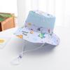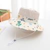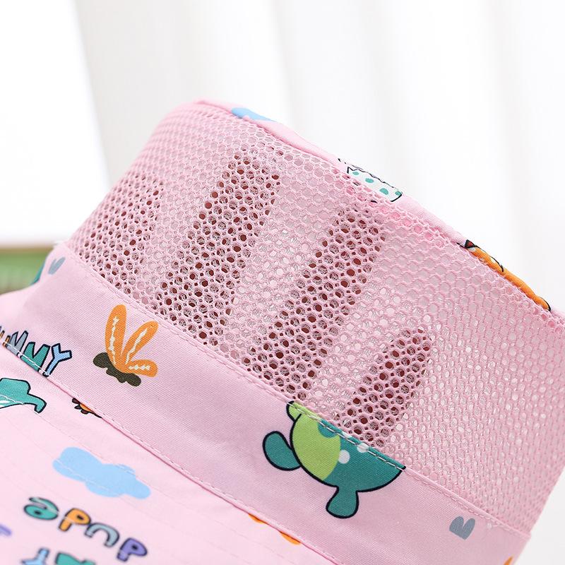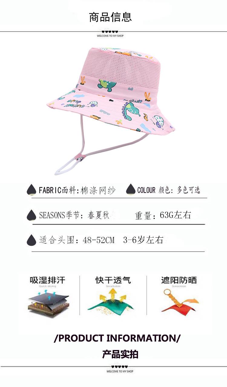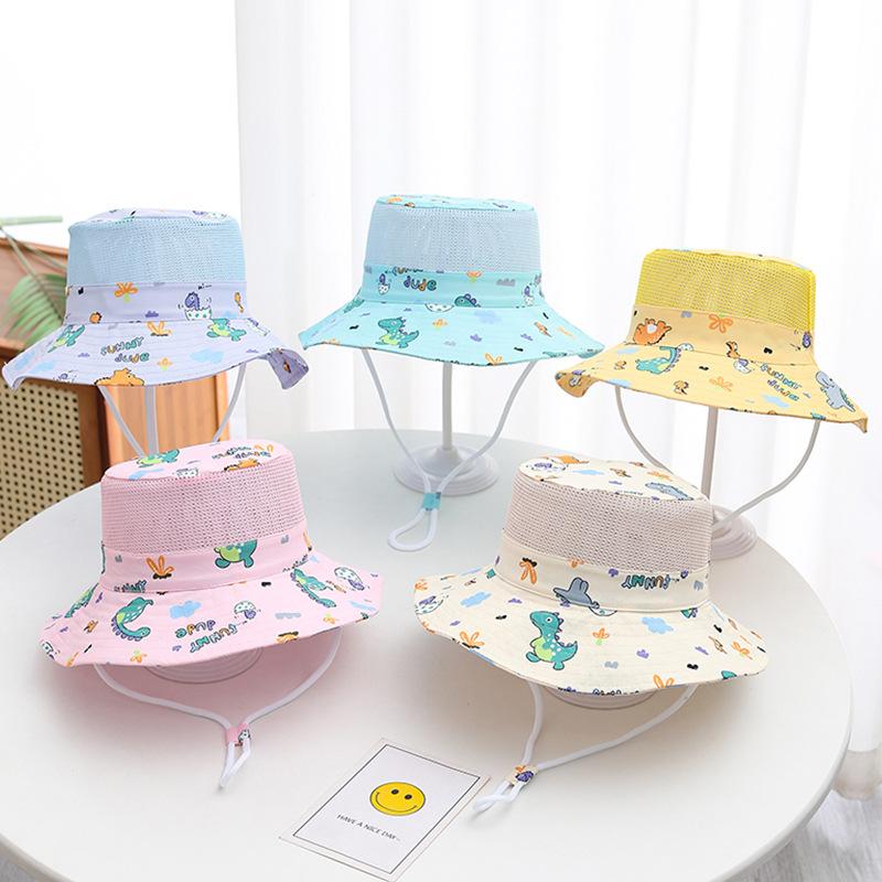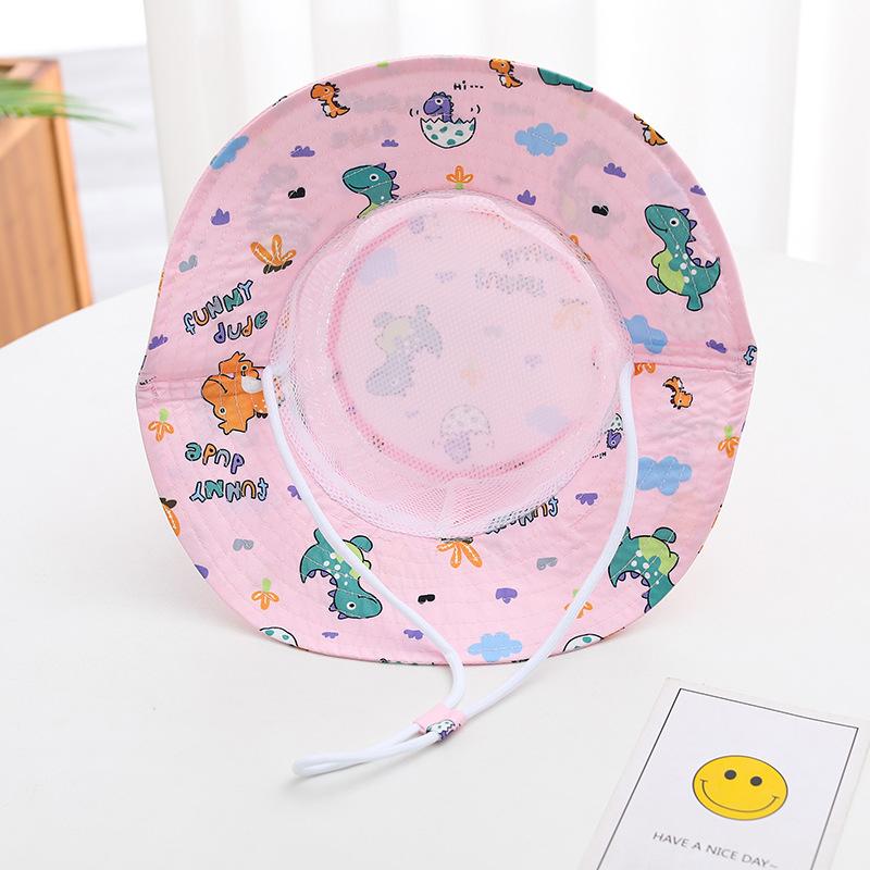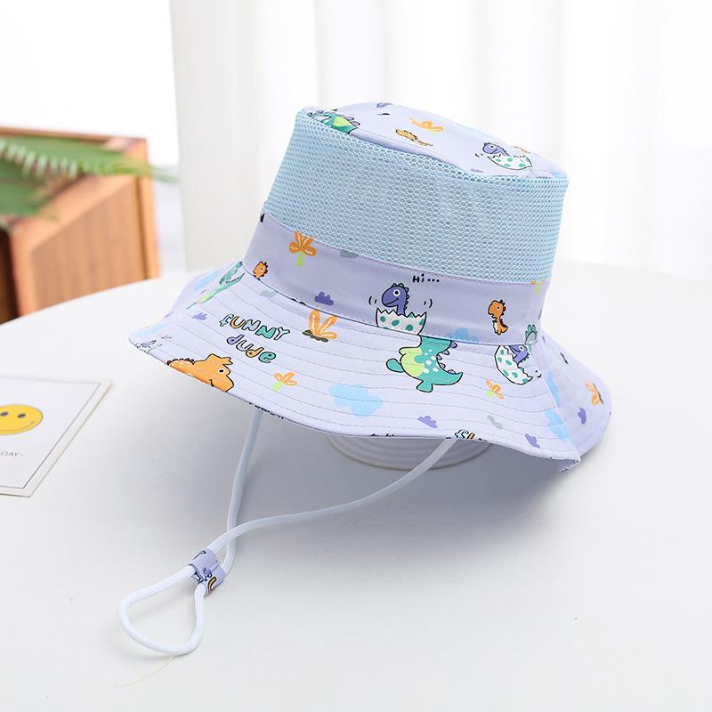 Sombrero de verano japonés y coreano, sombrero de malla para bebé con diseño de dinosaurio pequeño de dibujos animados para niños, sombrero de lavabo de parte superior plana, sombrero de pescador fino de protección solar para verano.