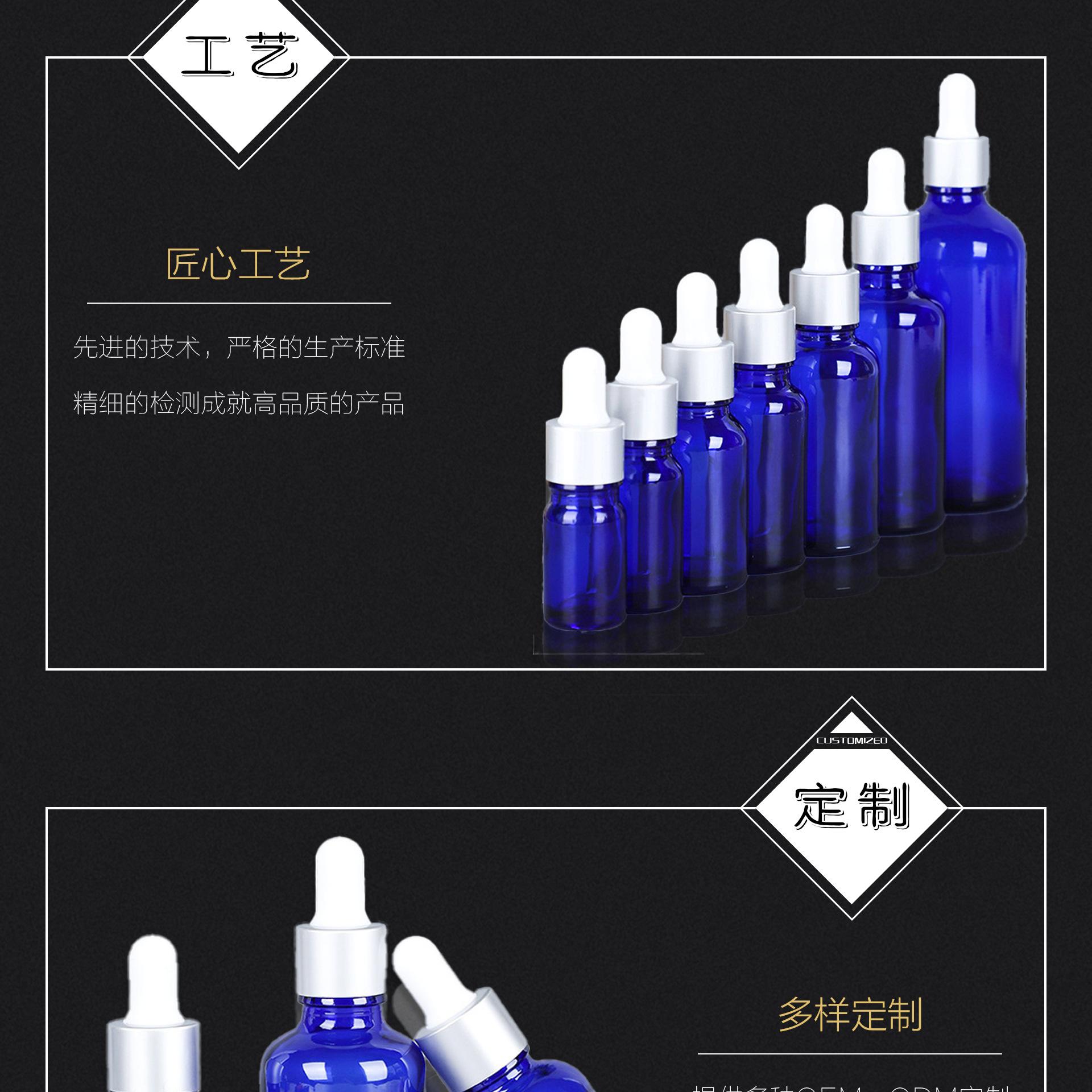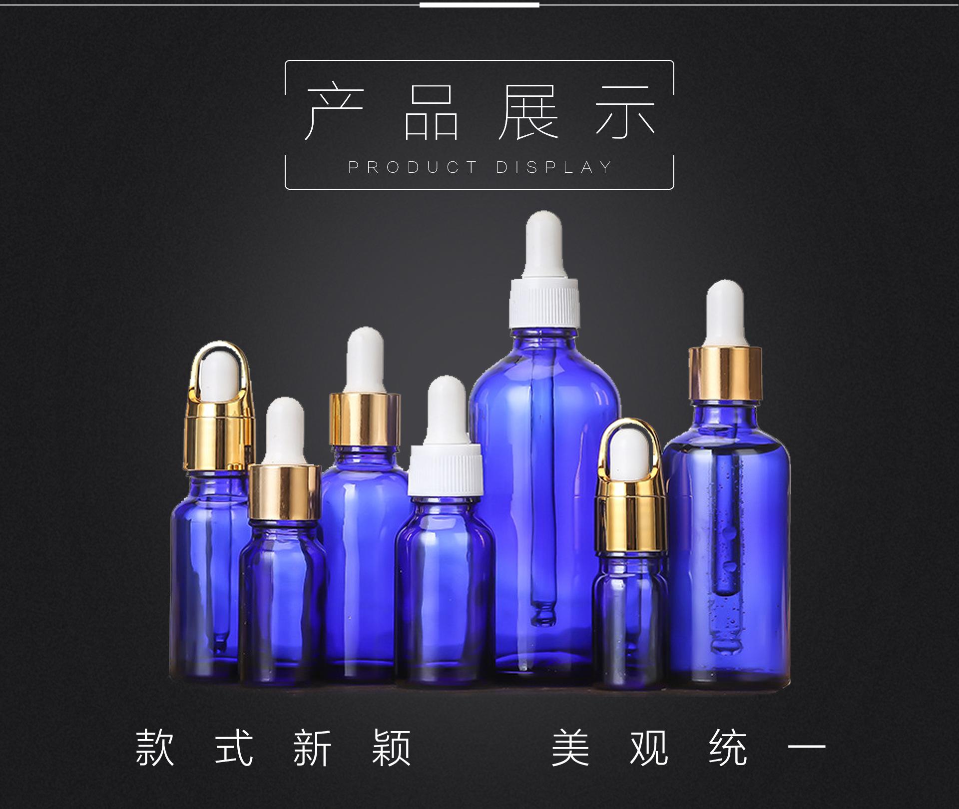 Blue bottle + anodized aluminum black ring + black plastic head + dropper * 10ml * glass