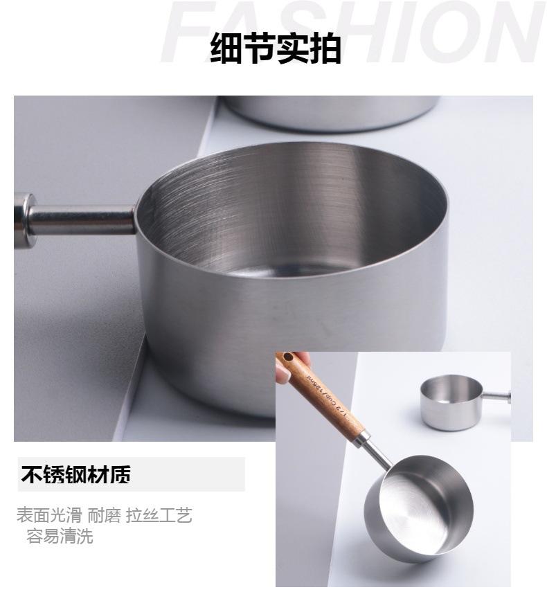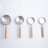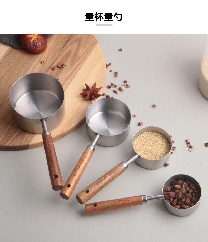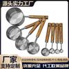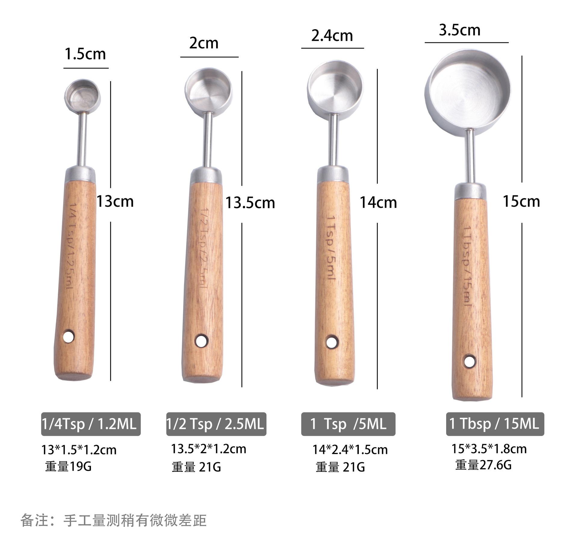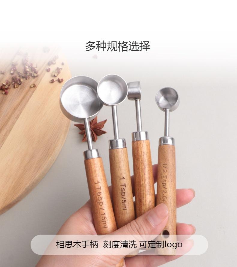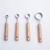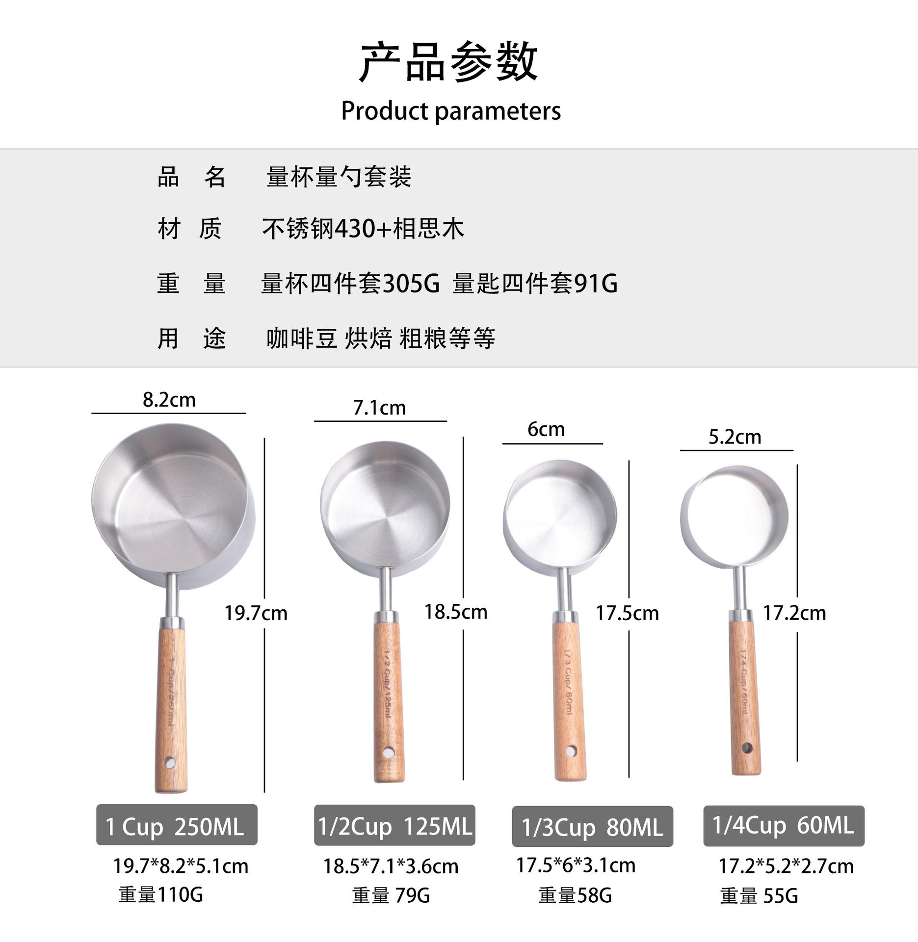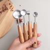 En stock Taza Medidora de Acero Inoxidable Transfronteriza Juego de Cuatro Piezas Utensilios para Hornear Domésticos Cuchara Medidora con Escala Juego de Cucharas Medidoras de Madera de Acacia
