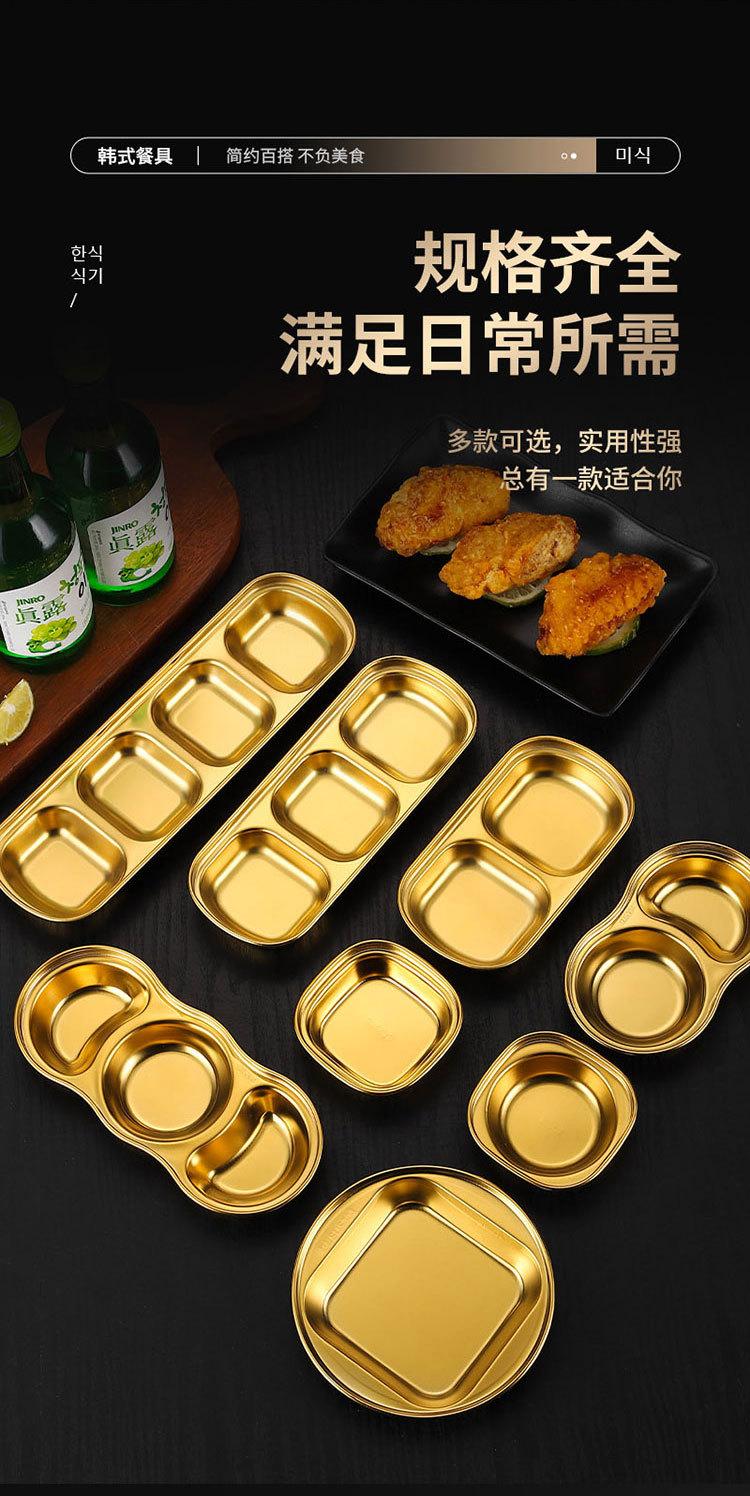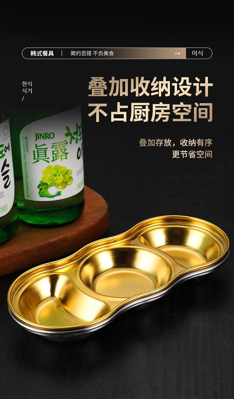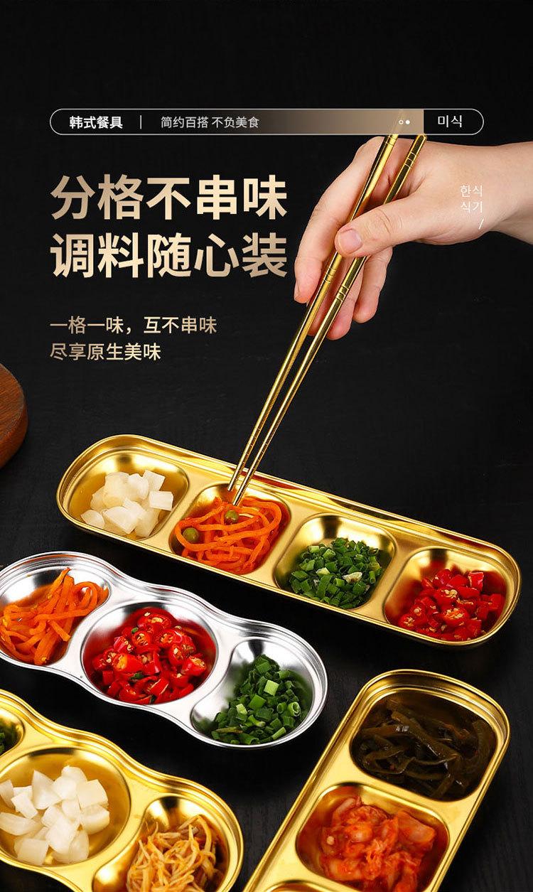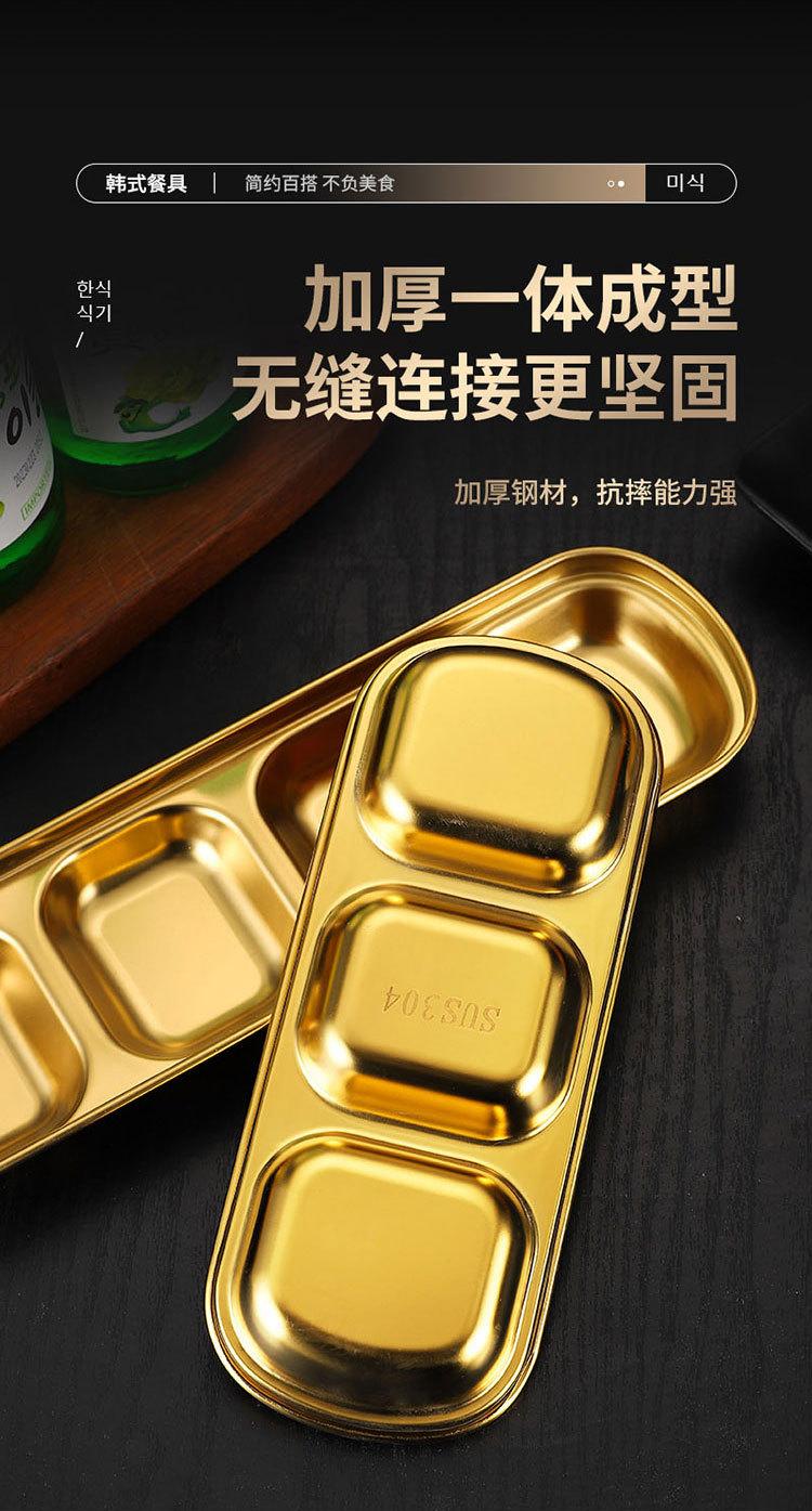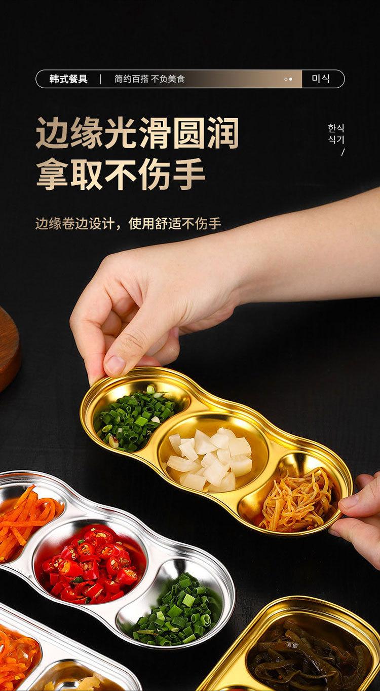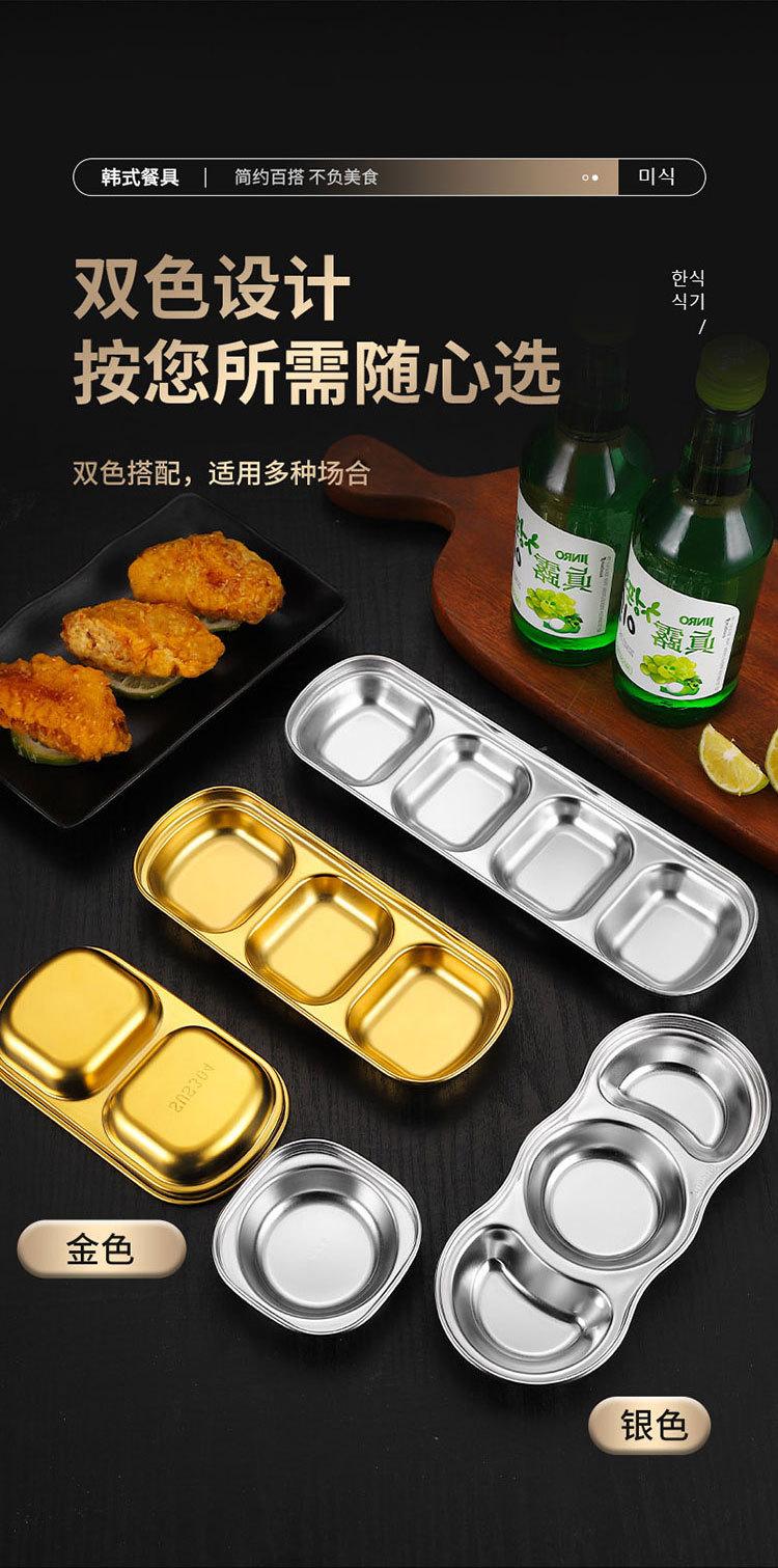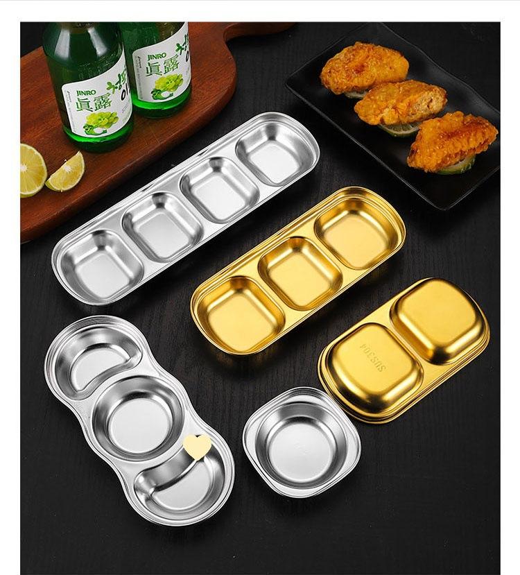 Compra Plato de condimentos al estilo coreano, plato para mojar dorado, acero inoxidable 304, dos compartimentos, tres compartimentos, olla caliente, salsa, encurtidos, vajilla para barbacoa al por mayor en Joom.pro