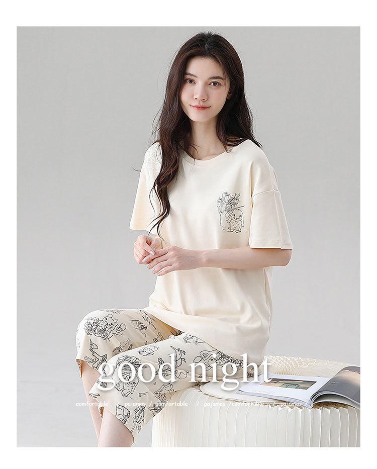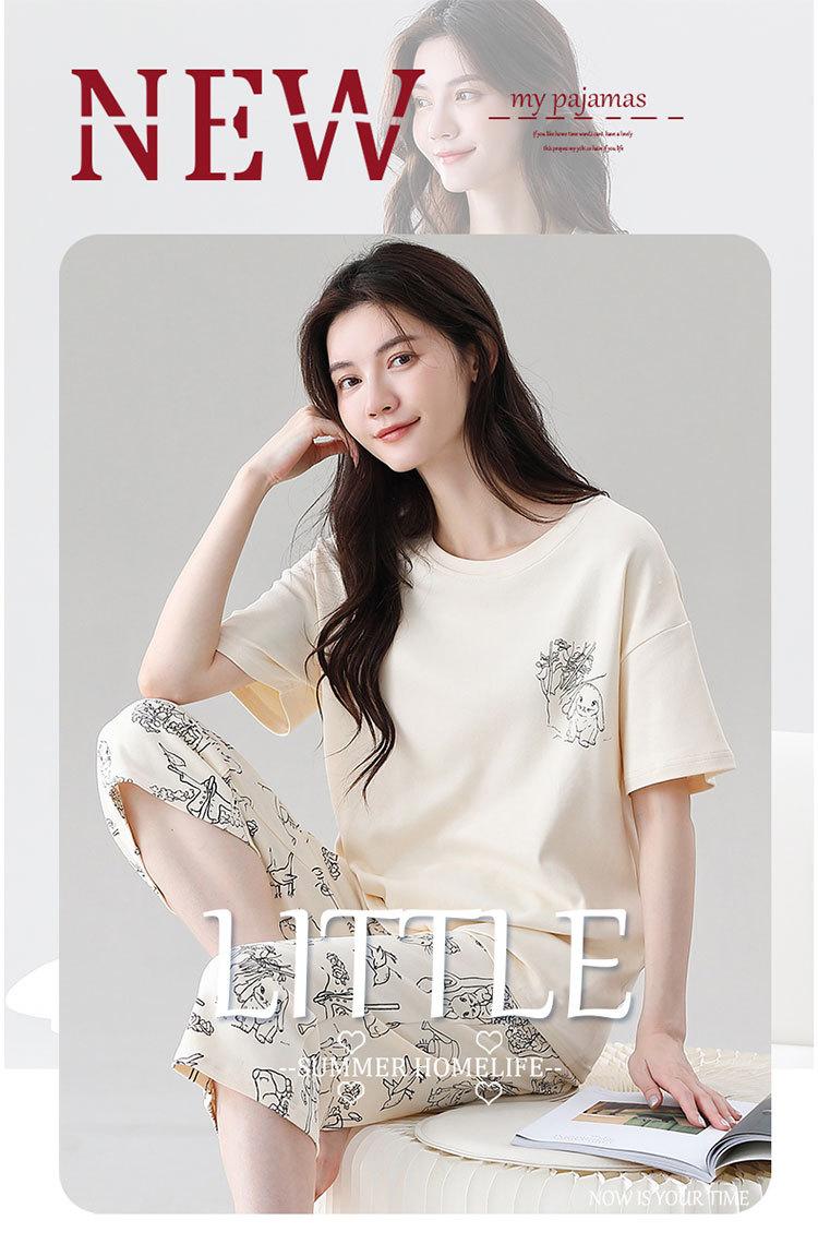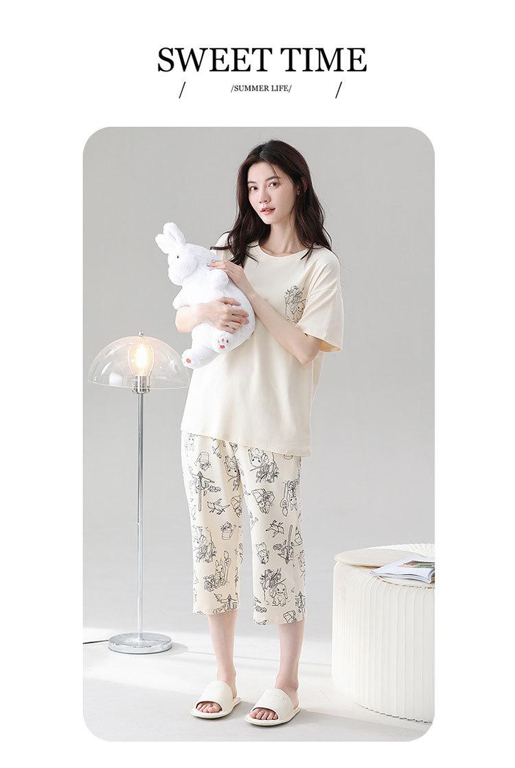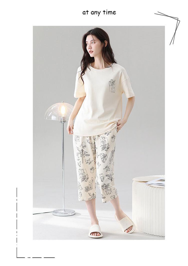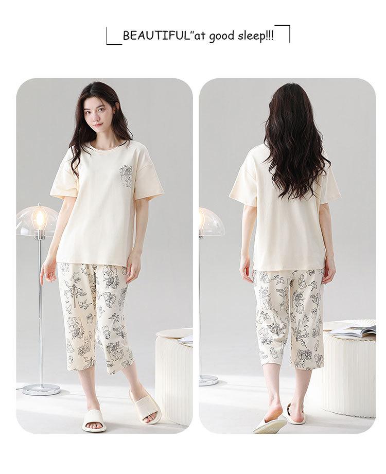 Pijama de algodón de verano para mujer, pantalones capri de manga corta con cuello redondo, ropa informal para el hogar, ropa exterior de estilo coreano para mujer, traje de algodón fresco