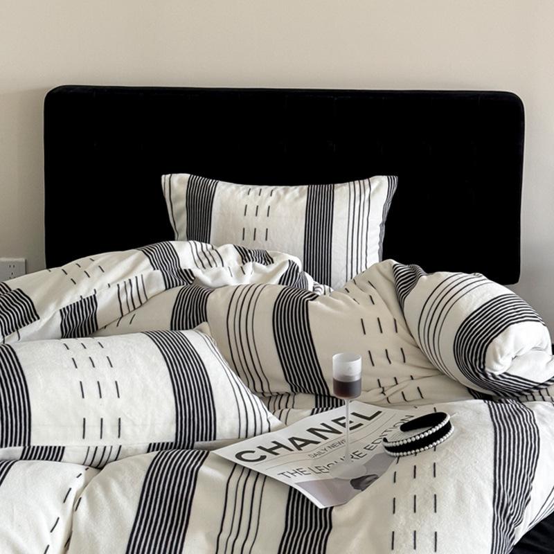 Conjunto de cuatro piezas de terciopelo de leche espesado para otoño e invierno, funda nórdica a rayas de estilo japonés simple, sábana y ropa de cama de terciopelo de doble cara