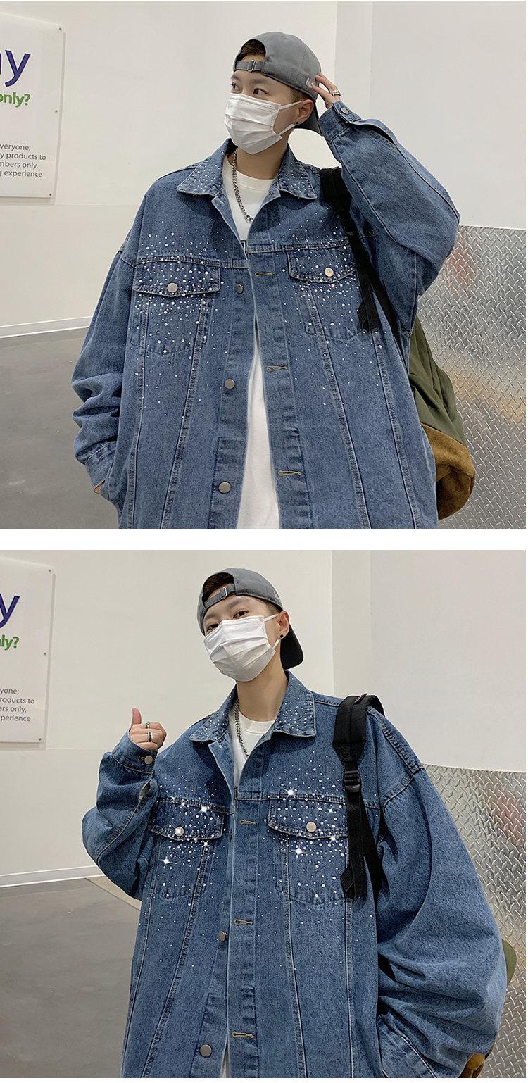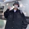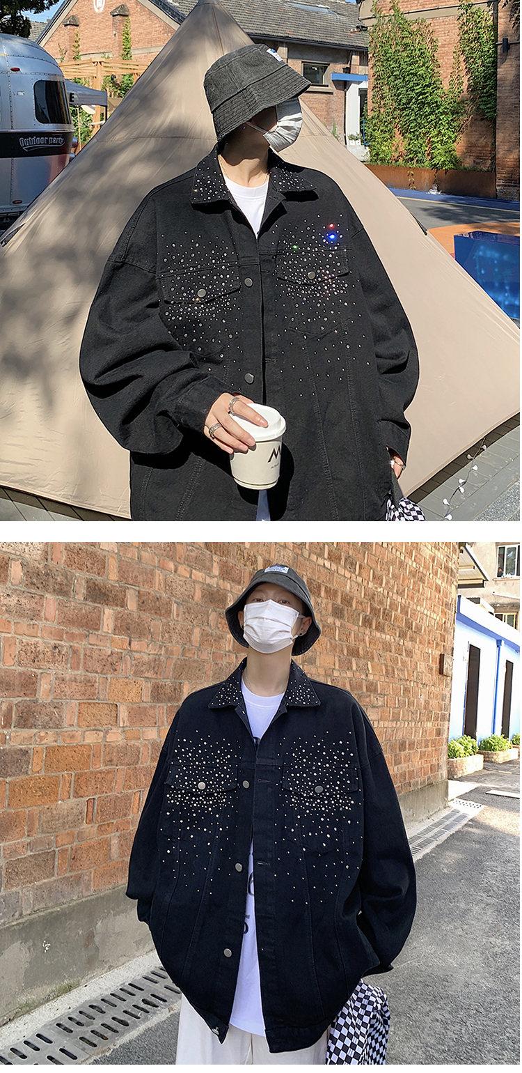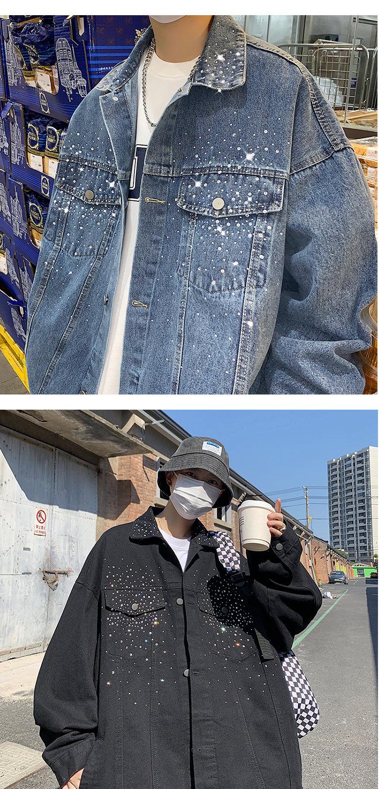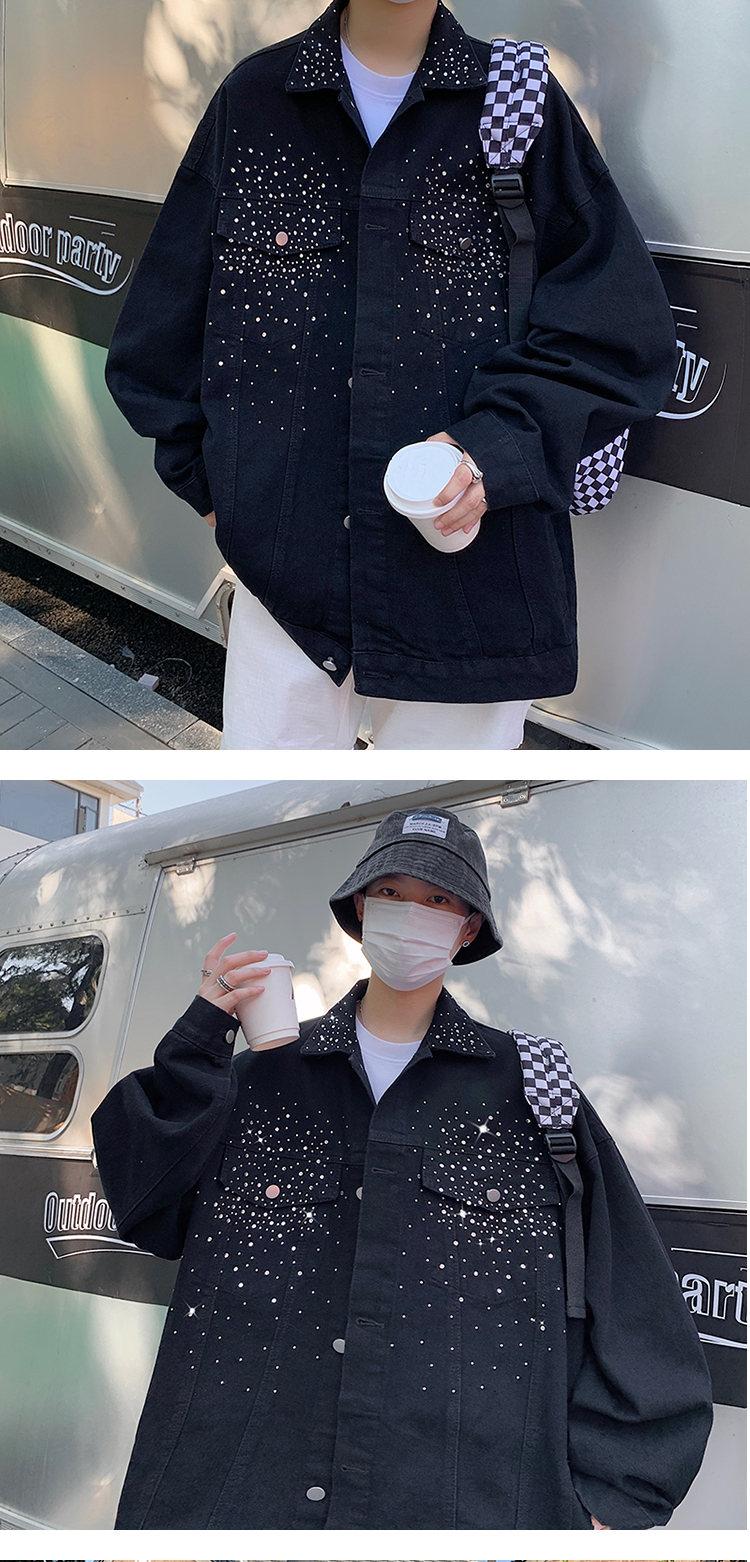 Chaqueta vaquera holgada con diamantes de imitación para hombre, chaqueta de manga larga combinable con todo, estilo coreano, color negro, para otoño
