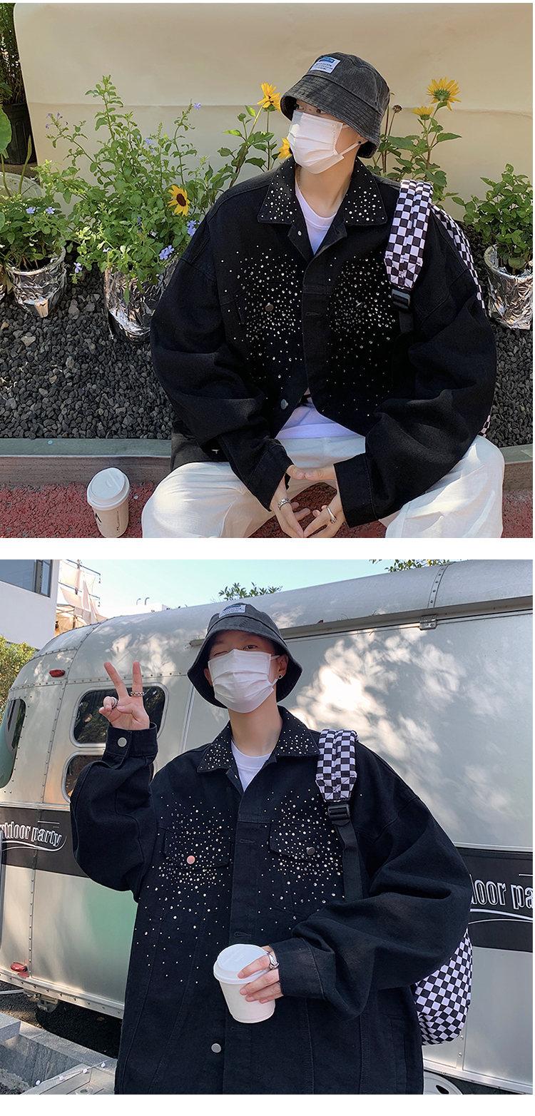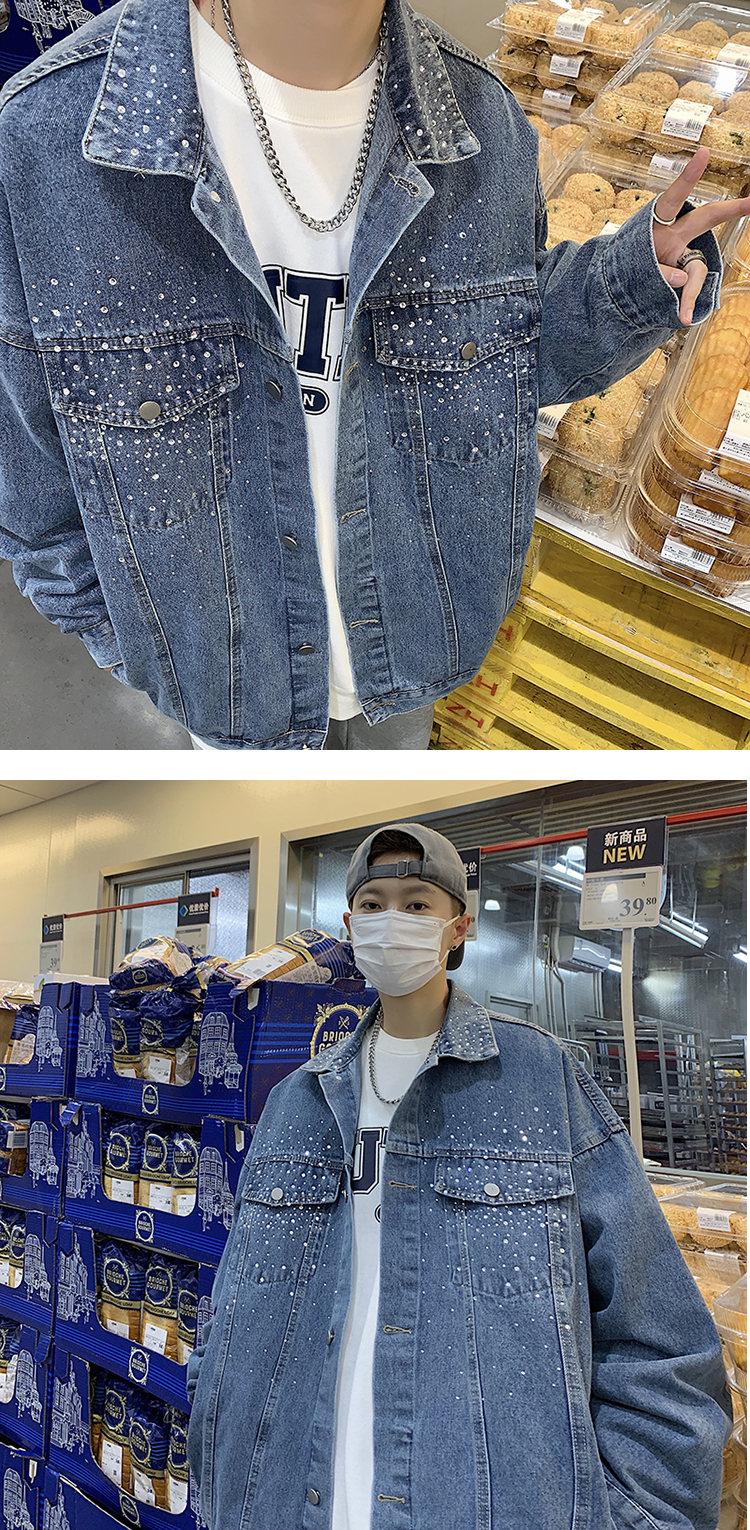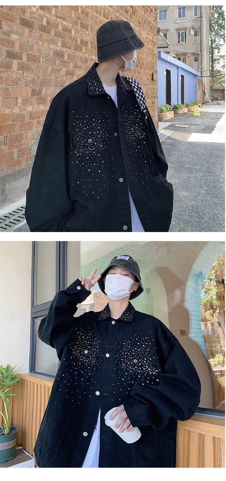 Chaqueta vaquera holgada con diamantes de imitación para hombre, chaqueta de manga larga combinable con todo, estilo coreano, color negro, para otoño