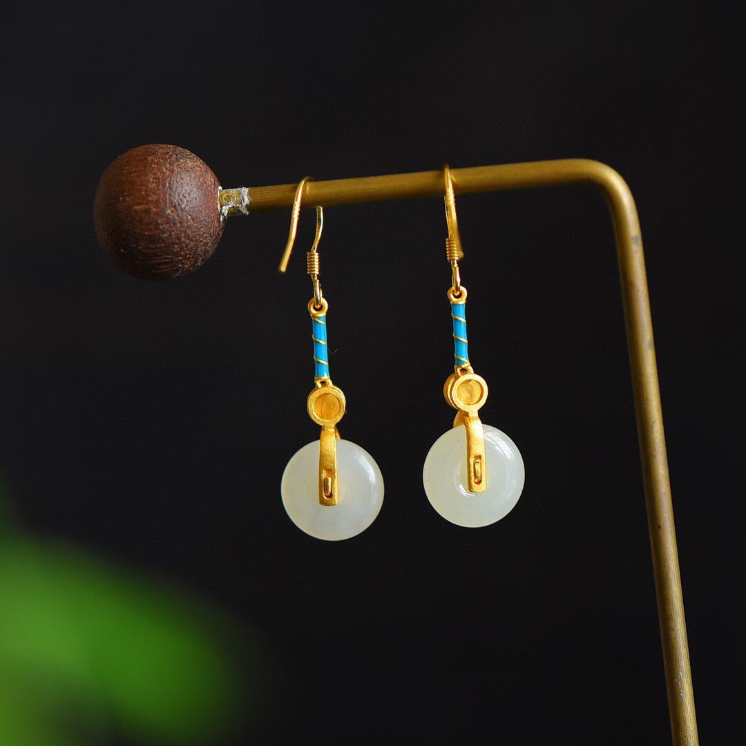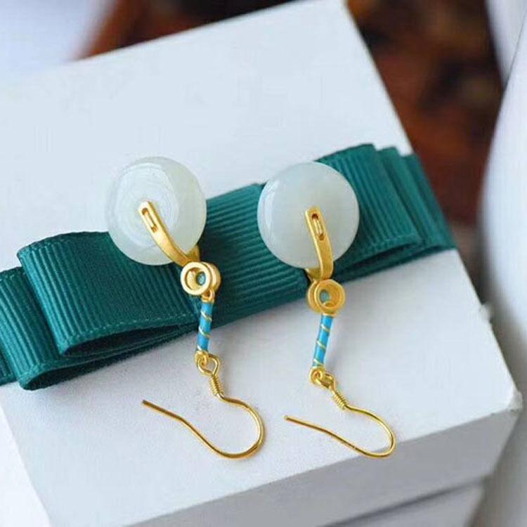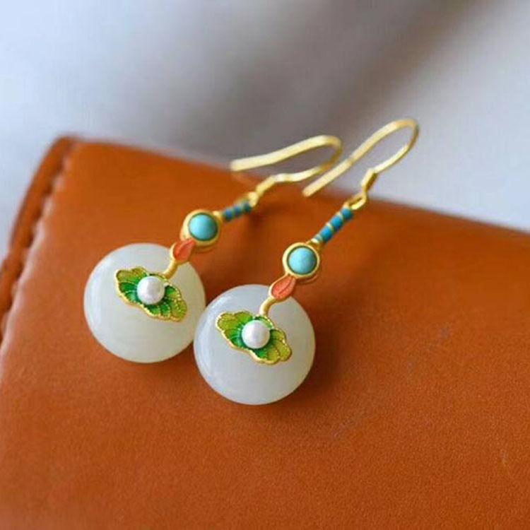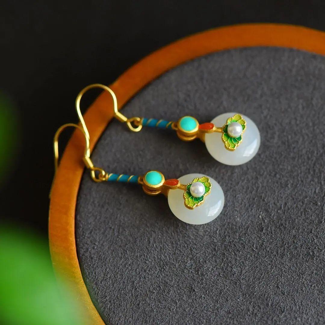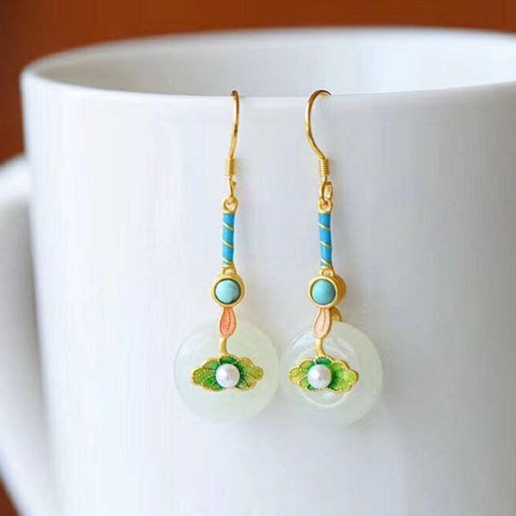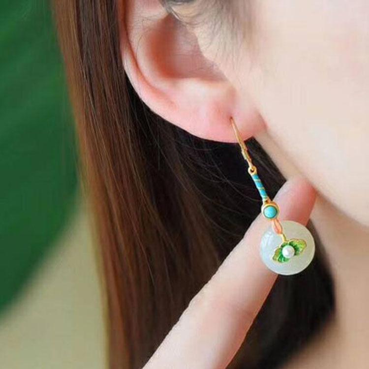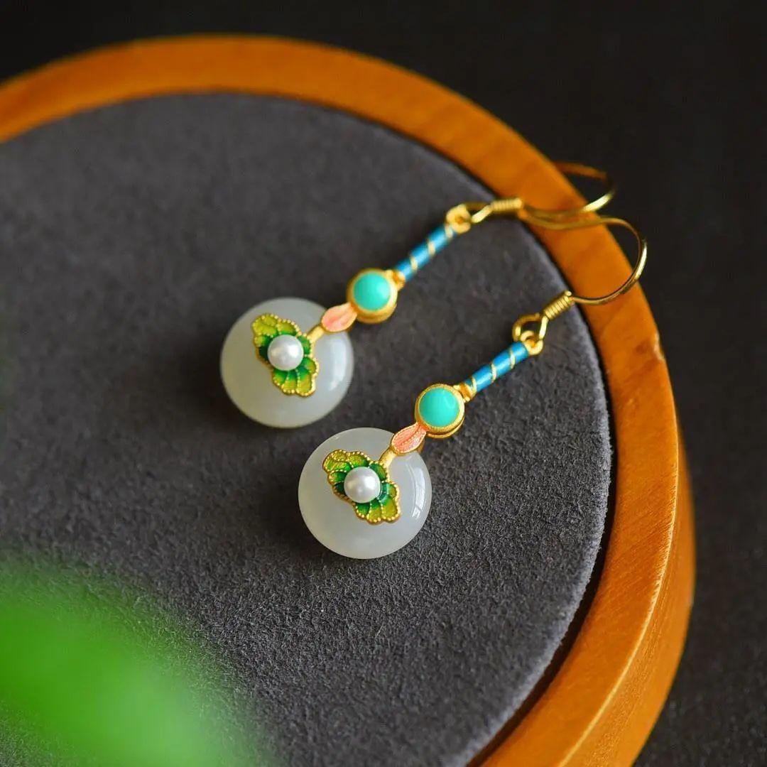 Pendientes con hebilla de paz, exquisitos pendientes vintage de jade blanco con perla azul quemada de loto, pendientes de plata S925 de estilo chino clásico.