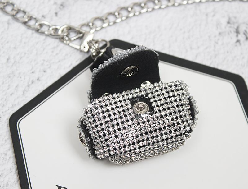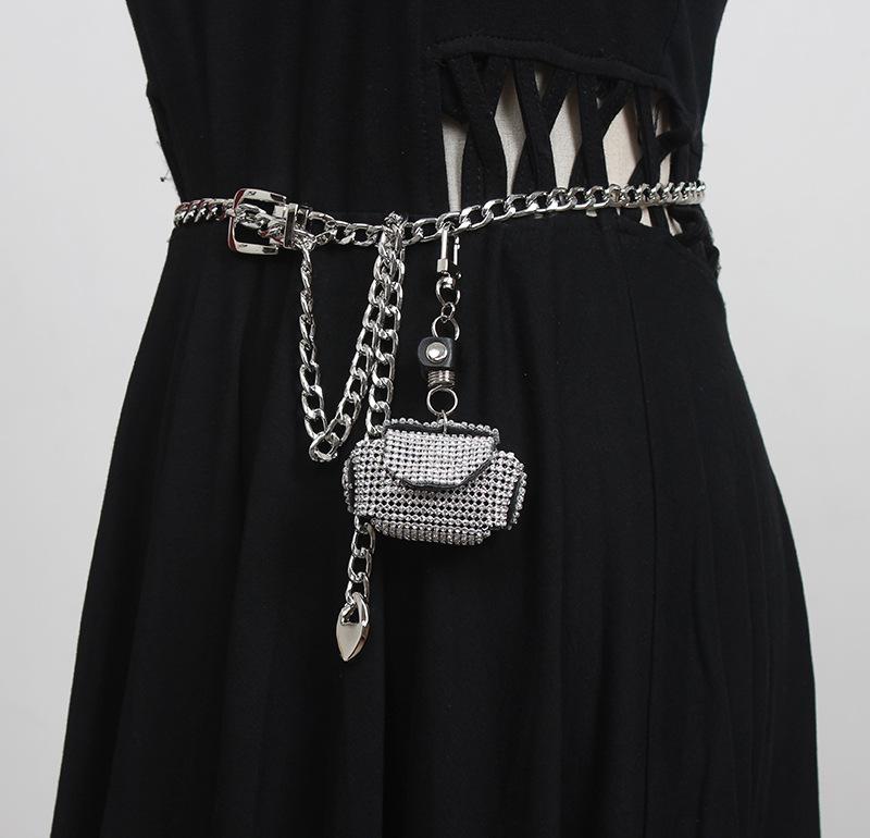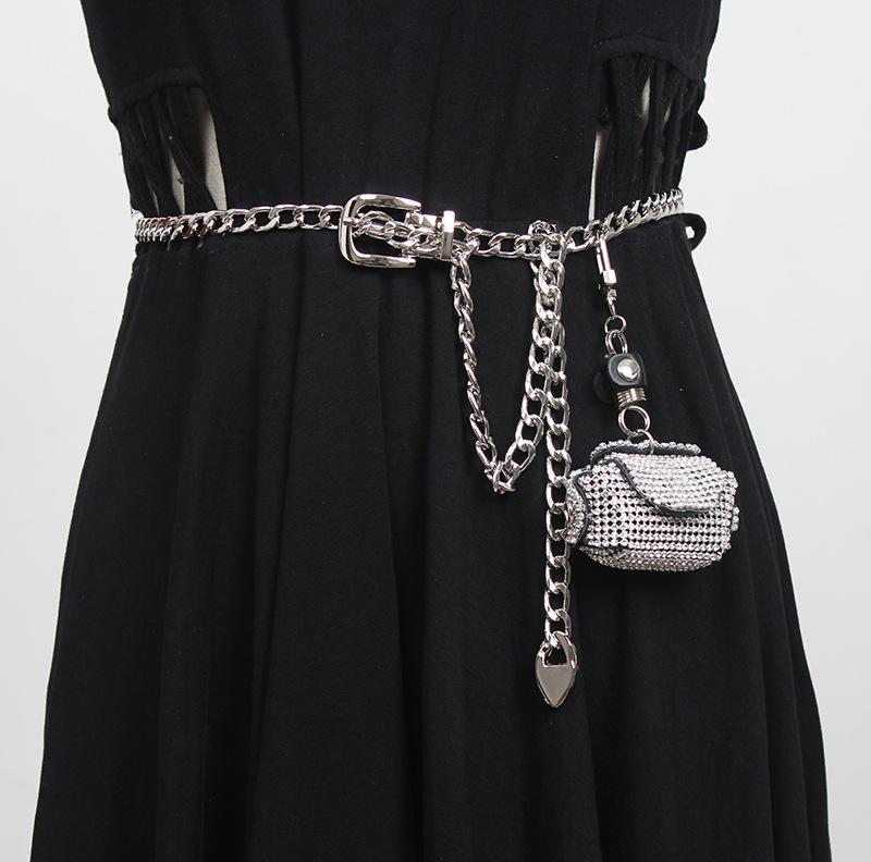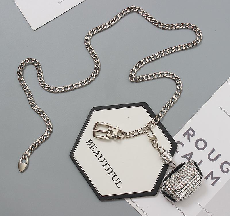 Mini bolso con cinturón de cadena y diamantes de imitación para mujer, adorno de cintura para falda de traje, estilo veraniego, con cadena.