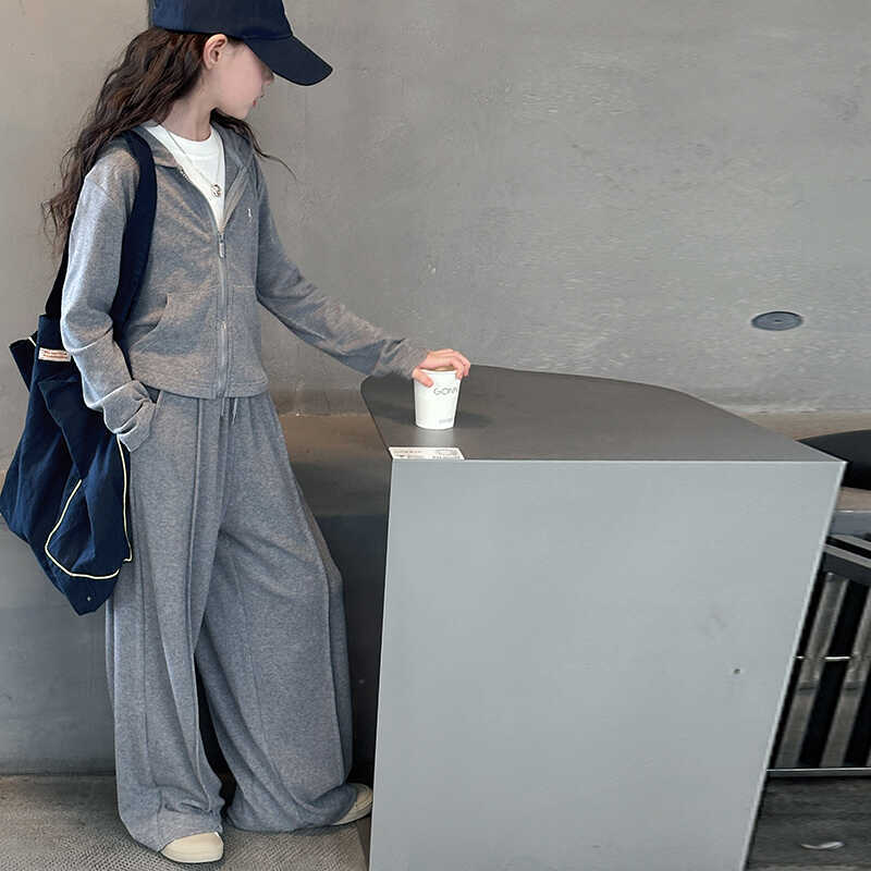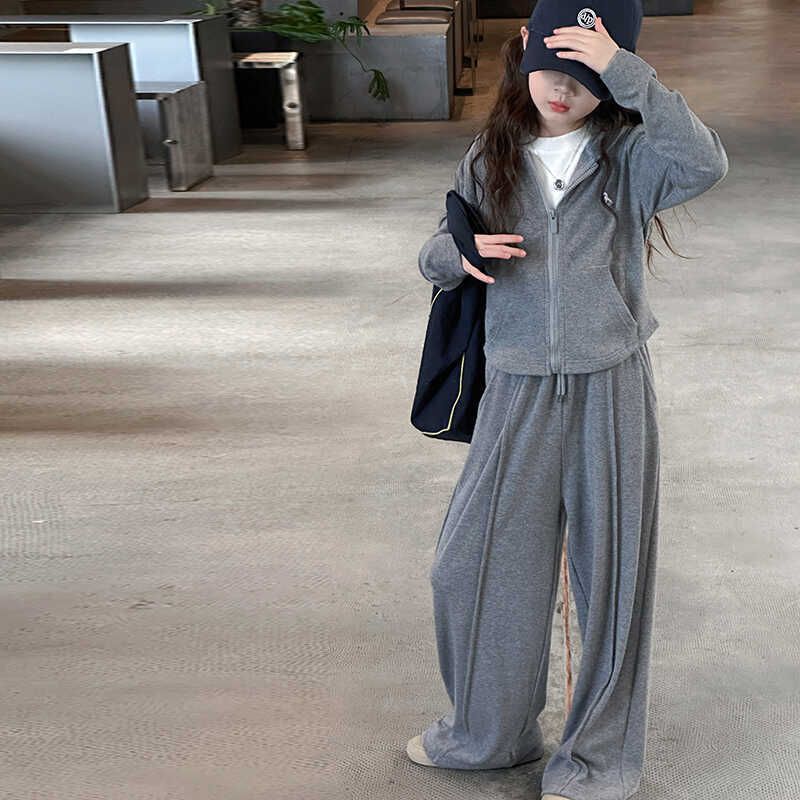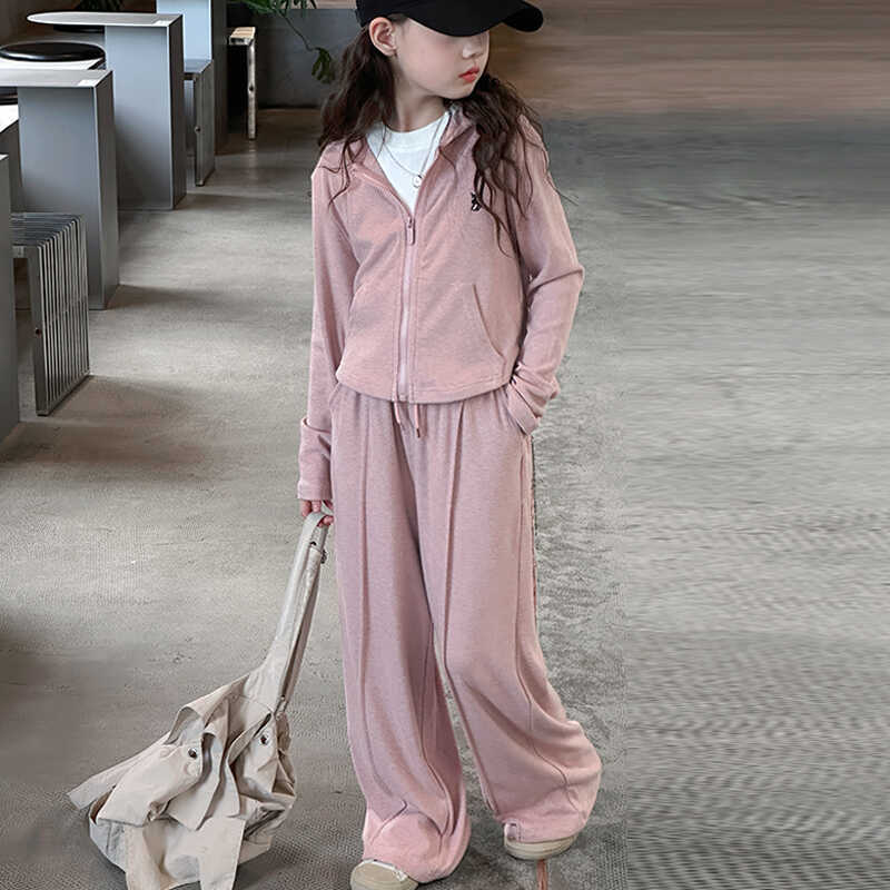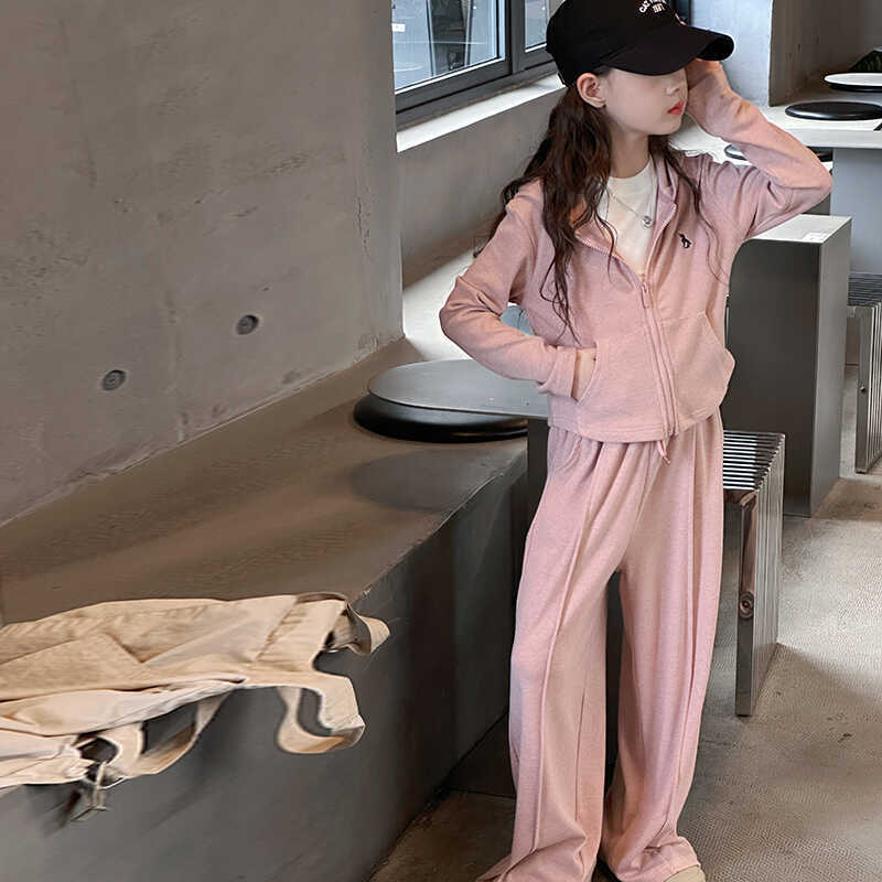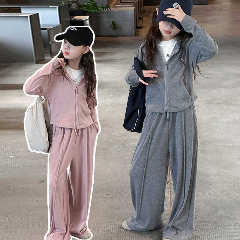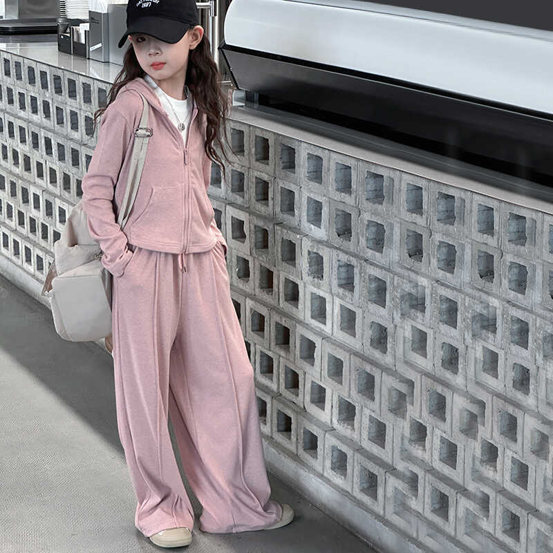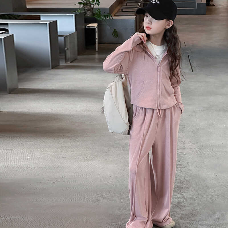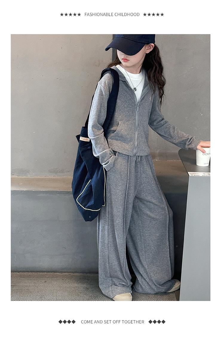 Compra Conjunto de dos piezas de ropa deportiva de manga larga con cárdigan, pantalones anchos y colores sólidos de estilo coreano para niñas, otoño e invierno, nuevo modelo al por mayor en Joom.pro