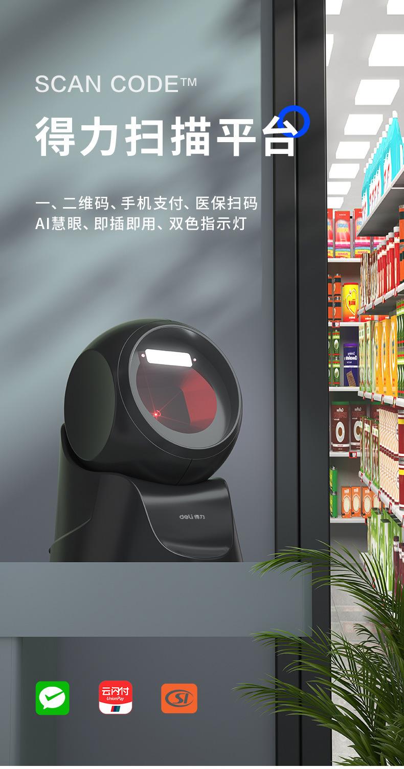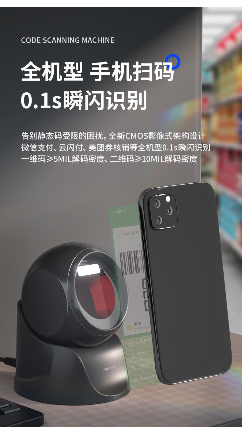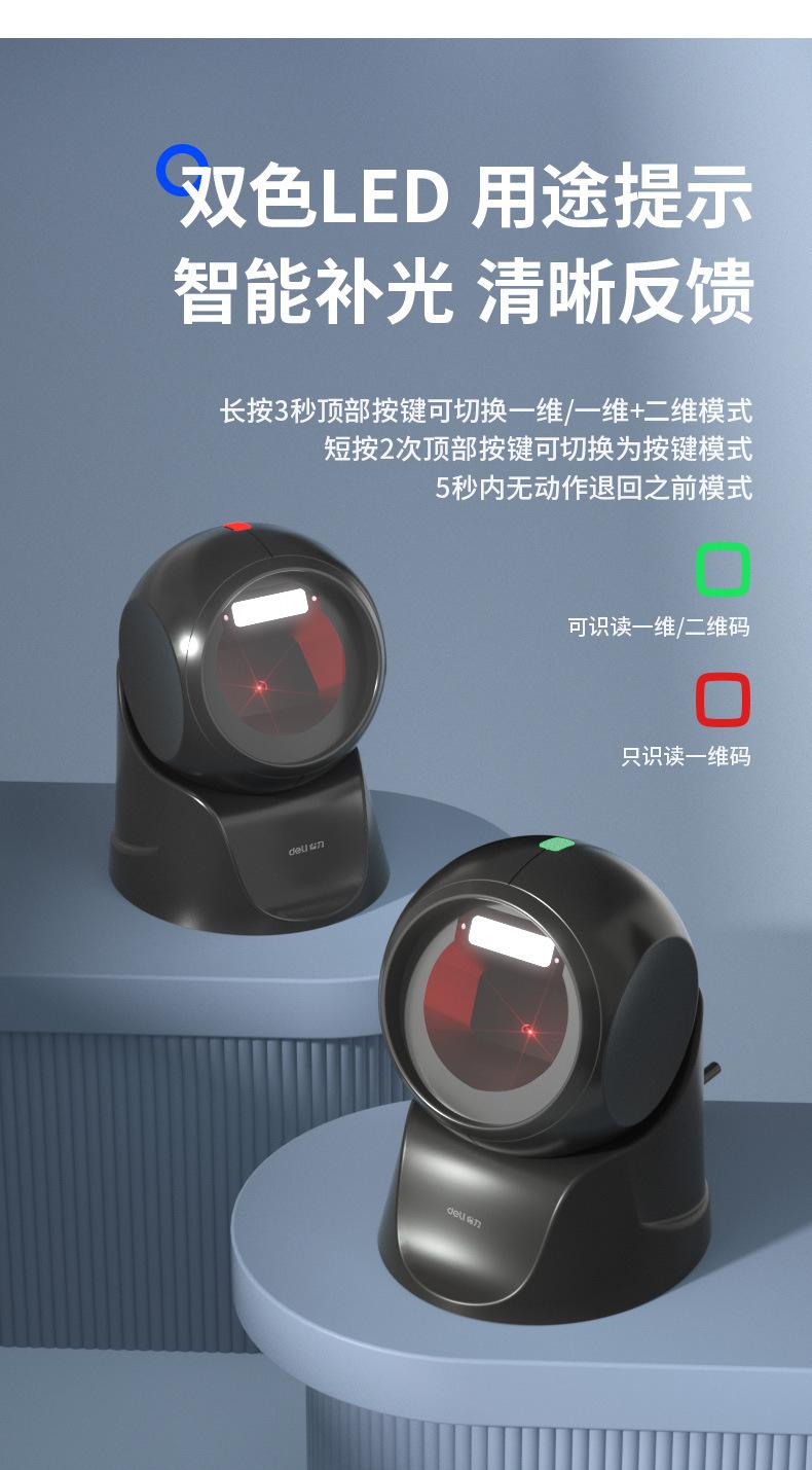 Escáner de plataforma de código unidimensional y bidimensional Deli 14963, bola de recolección, plataforma de escaneo de caja registradora de supermercado, pistola de escaneo de código