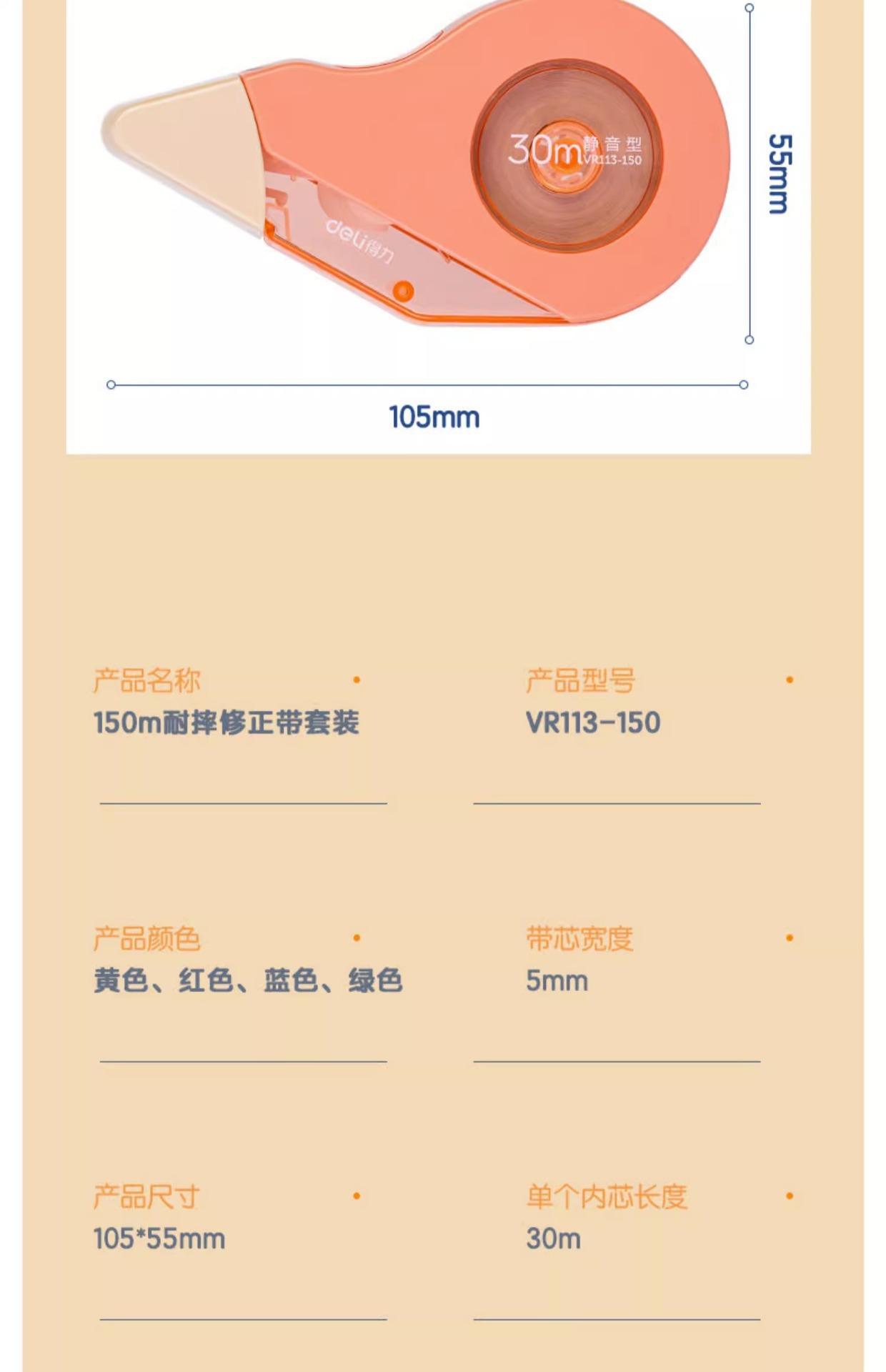 Deli Vr113-150 Cinta Correctora Silenciosa para Estudiantes, Resistente a Caídas, Cinta Correctora de Gran Capacidad, Venta al por Mayor de Cinta Correctora