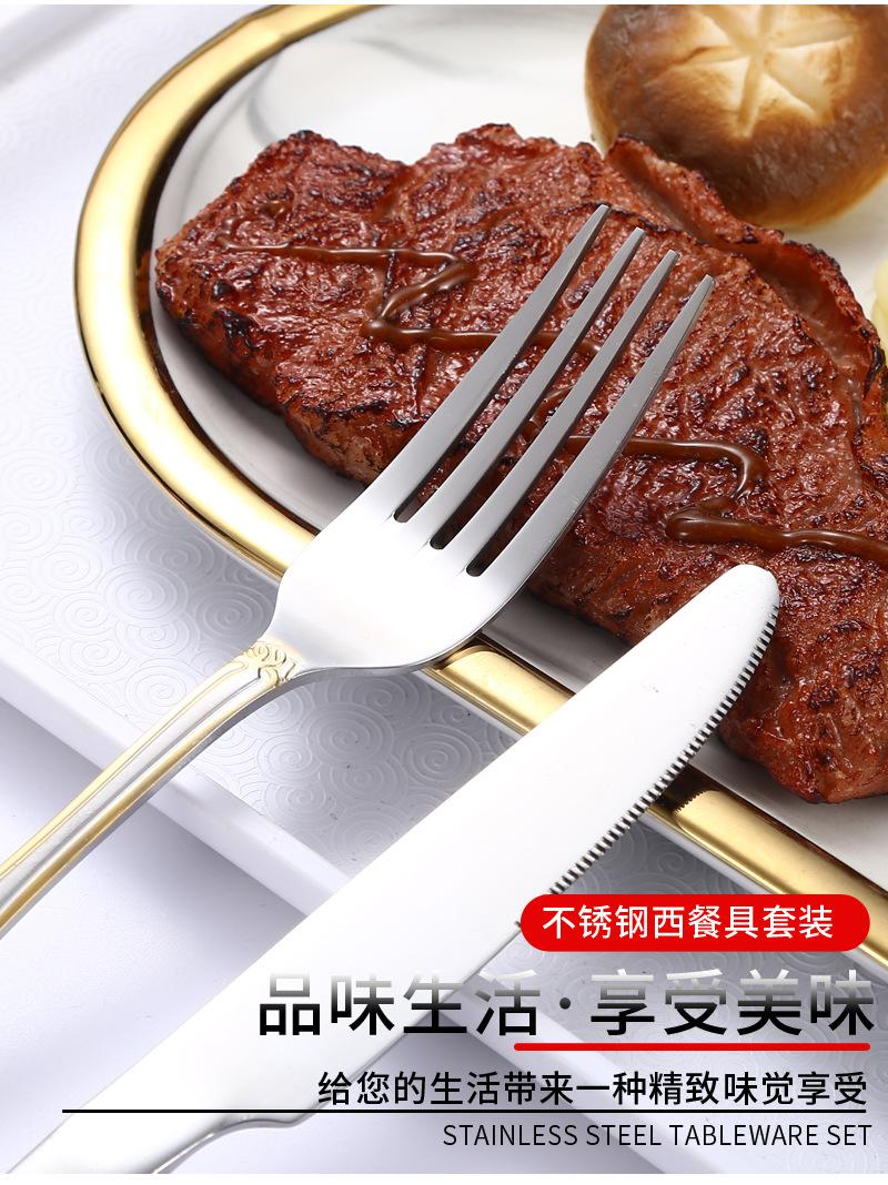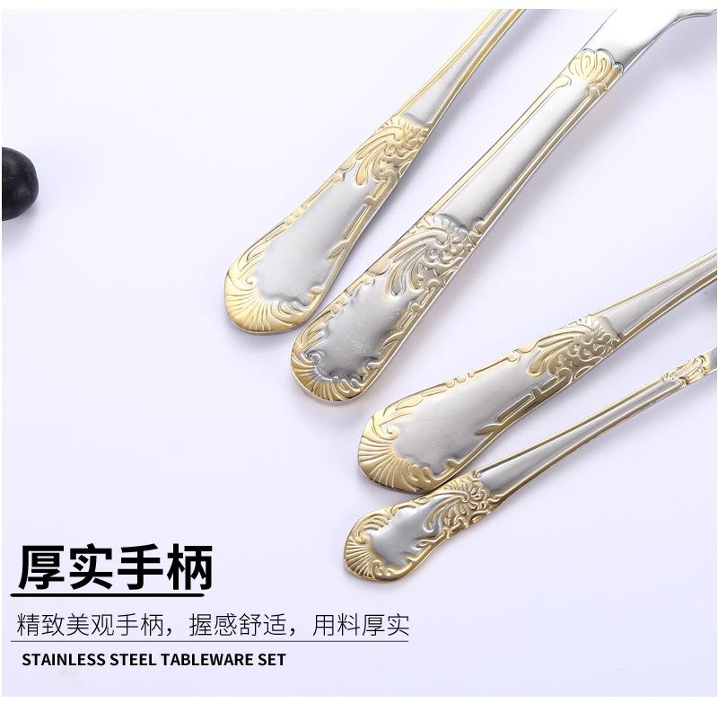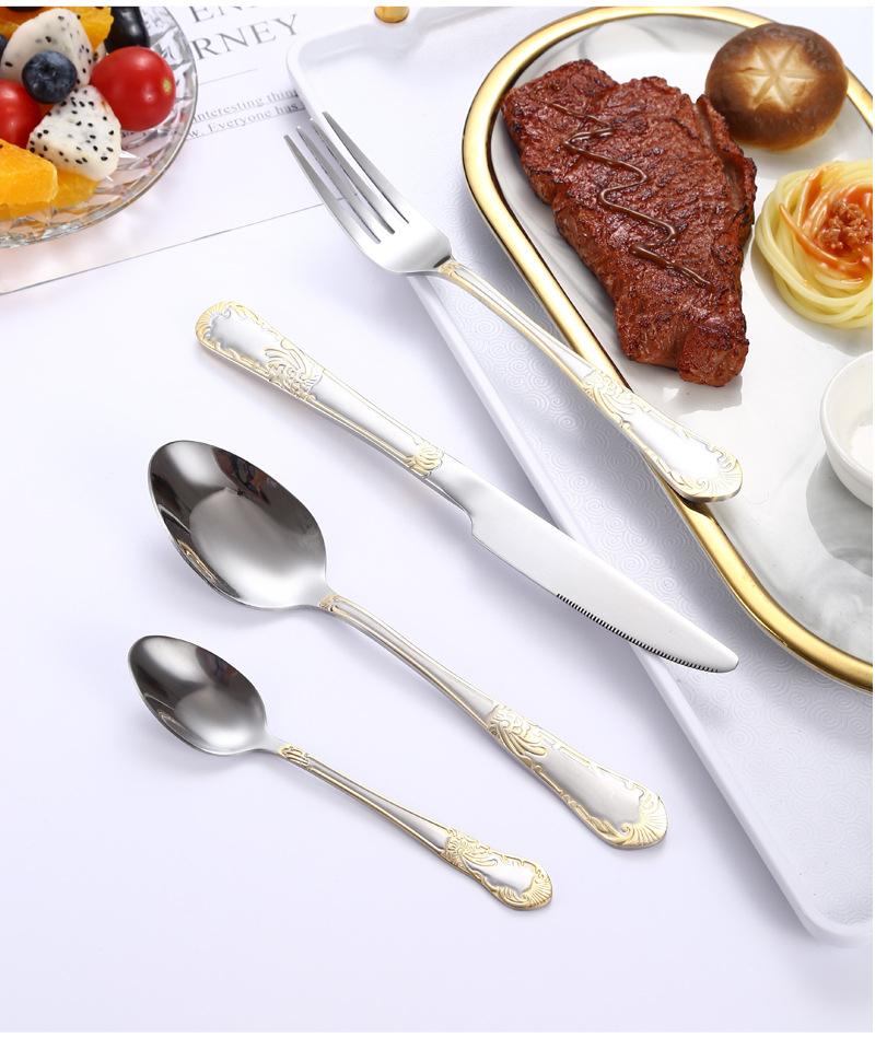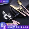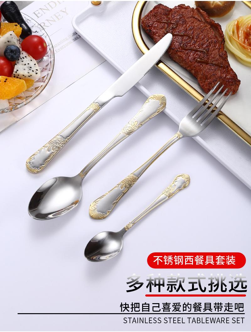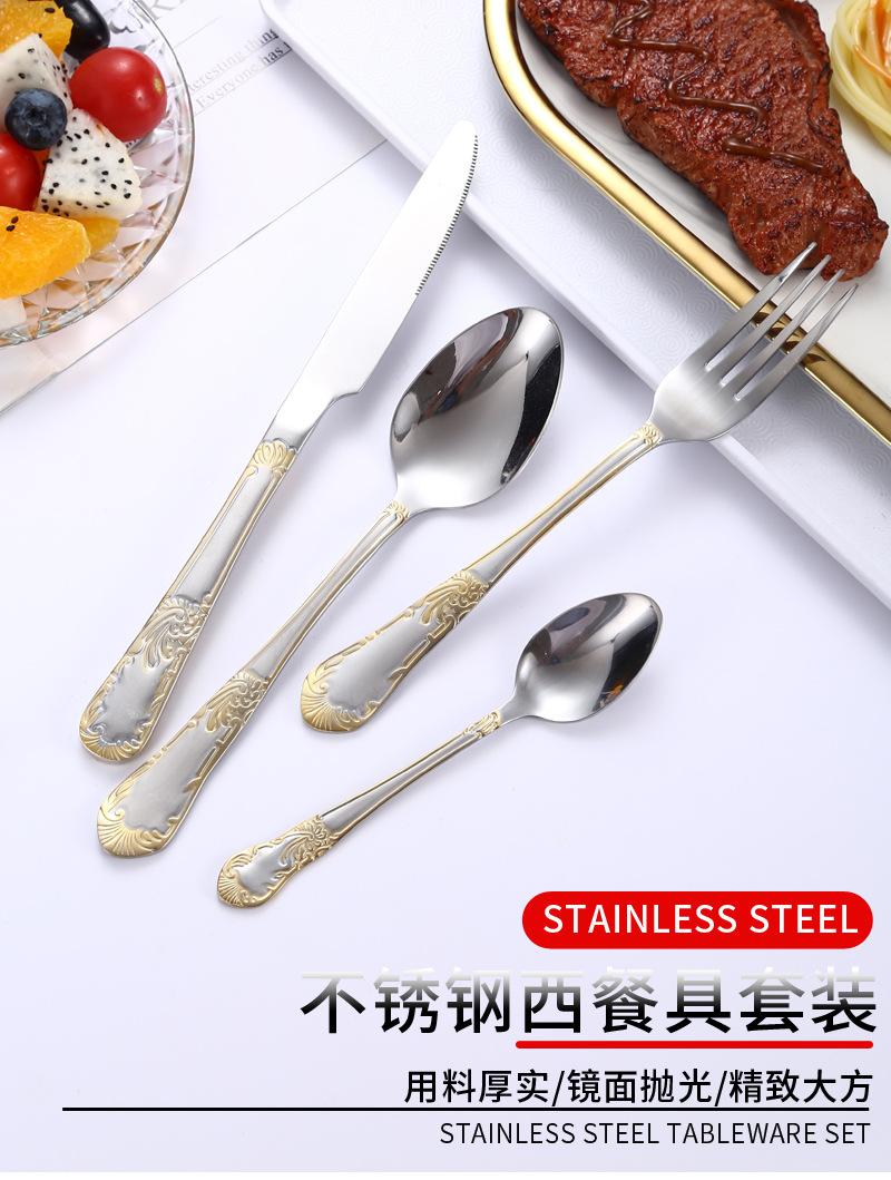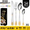Vajilla de acero inoxidable estilo occidental con cuchillo, tenedor y cuchara de Amazon transfronterizos, juego de cuatro piezas de cuchillo, tenedor, cuchara y cuchara para carne con revestimiento de titanio.