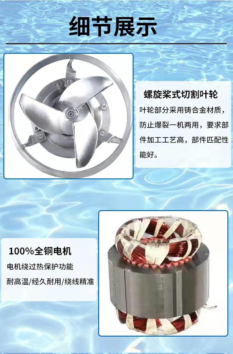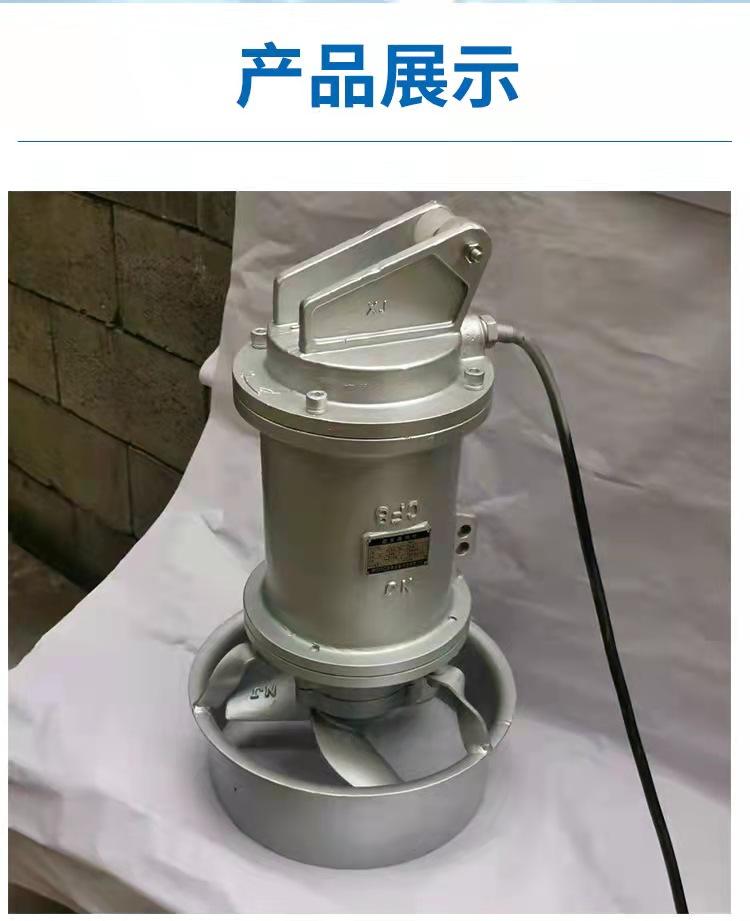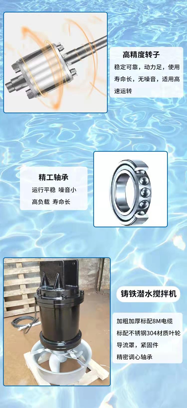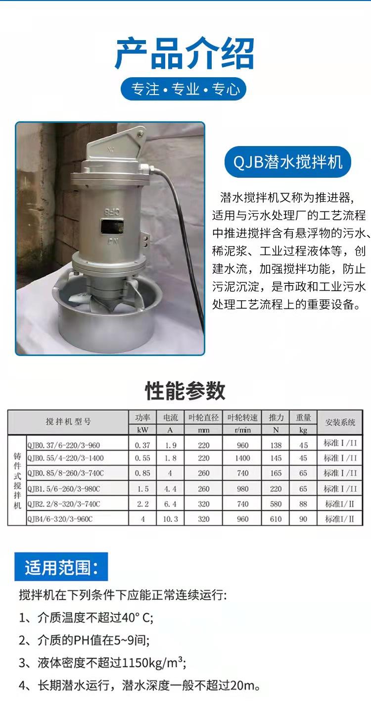 El mezclador sumergible de fundición tipo QJB se compone principalmente de motor sumergible, mecanismo de sellado, impulsor, cubierta guía, polipasto manual, sistema de instalación, control eléctrico, etc. El impulsor gira y agita el líquido bajo el impulso del motor para producir un chorro giratorio, y utiliza la tensión cortante a lo largo de la superficie del chorro para mezclar, de modo que el líquido fuera del campo de flujo produce un efecto de agitación por fricción y forma un flujo volumétrico mientras se mezcla, y se aplica un modo de flujo de gran volumen para obtener un suministro de fluido controlado.