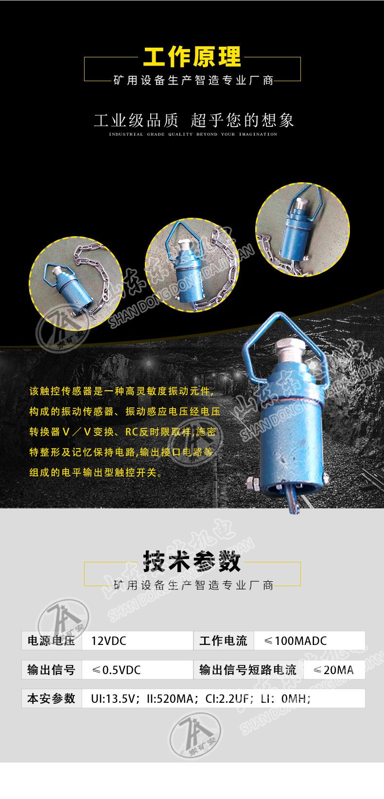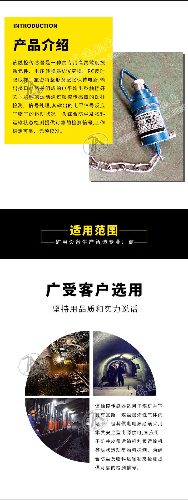 El sensor táctil es adecuado para lugares con gas y polvo de carbón en minas de carbón, pero su fuente de alimentación debe ser una fuente de alimentación intrínsecamente segura; es adecuado para detectar materiales en movimiento en forma de bloque, como cintas transportadoras de minas y transportadores raspadores, y proporciona señales de detección confiables para la prevención integral del polvo y la detección del estado del transporte del material.