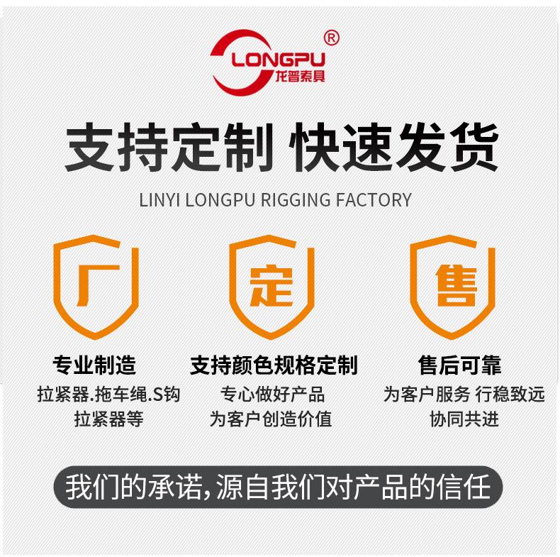La Fábrica de Aparejos Longpu del Distrito de Linyi Lanshan se especializa en la producción y procesamiento de amarres, correas de amarre, cinturones de seguridad, amarres de poliéster, amarres de polipropileno, hebillas de trinquete, correas de polipropileno, correas de poliéster, correas para remolques, tensores y otros productos. Cuenta con un sistema de gestión de calidad completo y científico. La integridad, la solidez y la calidad de sus productos han sido reconocidas por la industria. Invitamos a amigos de todos los ámbitos a visitarnos, guiarnos y negociar.