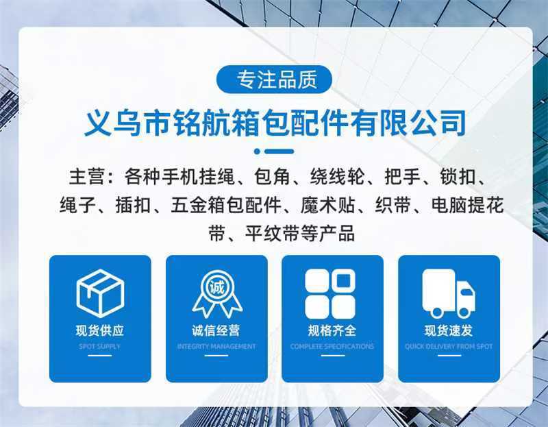 Yiwu Minghang Bags Accessories Co., Ltd. se encuentra en la ciudad de Yiwu, provincia de Zhejiang, conocida como la famosa ciudad de los productos básicos de China. La empresa cuenta con numerosas líneas de producción avanzadas y equipos completos. Es una gran empresa especializada en la producción de diversos bolsos y accesorios de ropa. Sus principales productos son correas y cintas, que lideran la industria de accesorios para bolsos. Sus productos se venden con éxito en el mercado nacional gracias a su exquisita artesanía, alta calidad, bajo precio y un servicio atento. Se ha convertido en un socio de referencia en la industria de bolsos y ropa y goza de una gran popularidad entre los clientes.