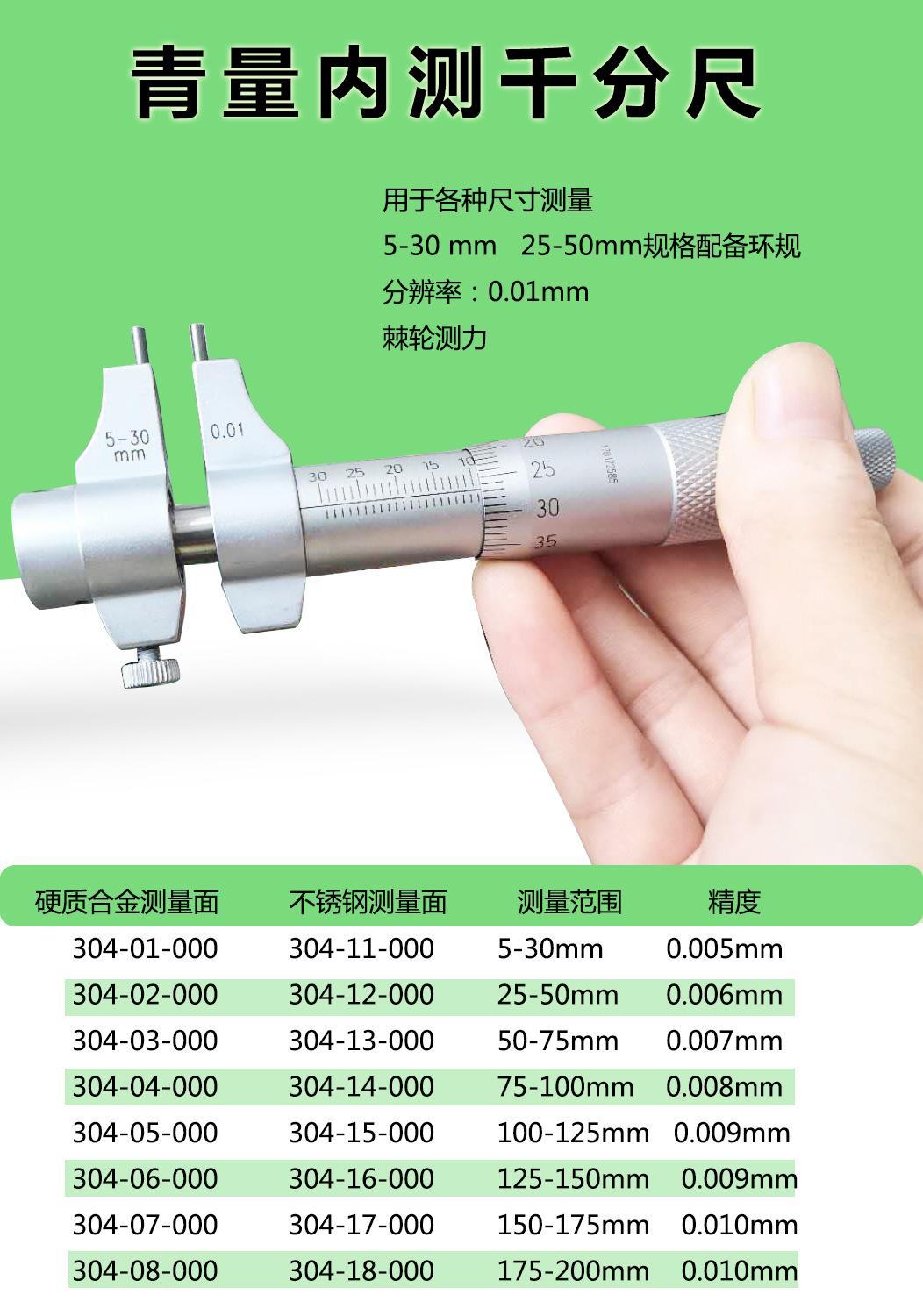 Micrómetro interno verde Qinghai 5-30 25-50-200 0.01 mecánico de dos puntos