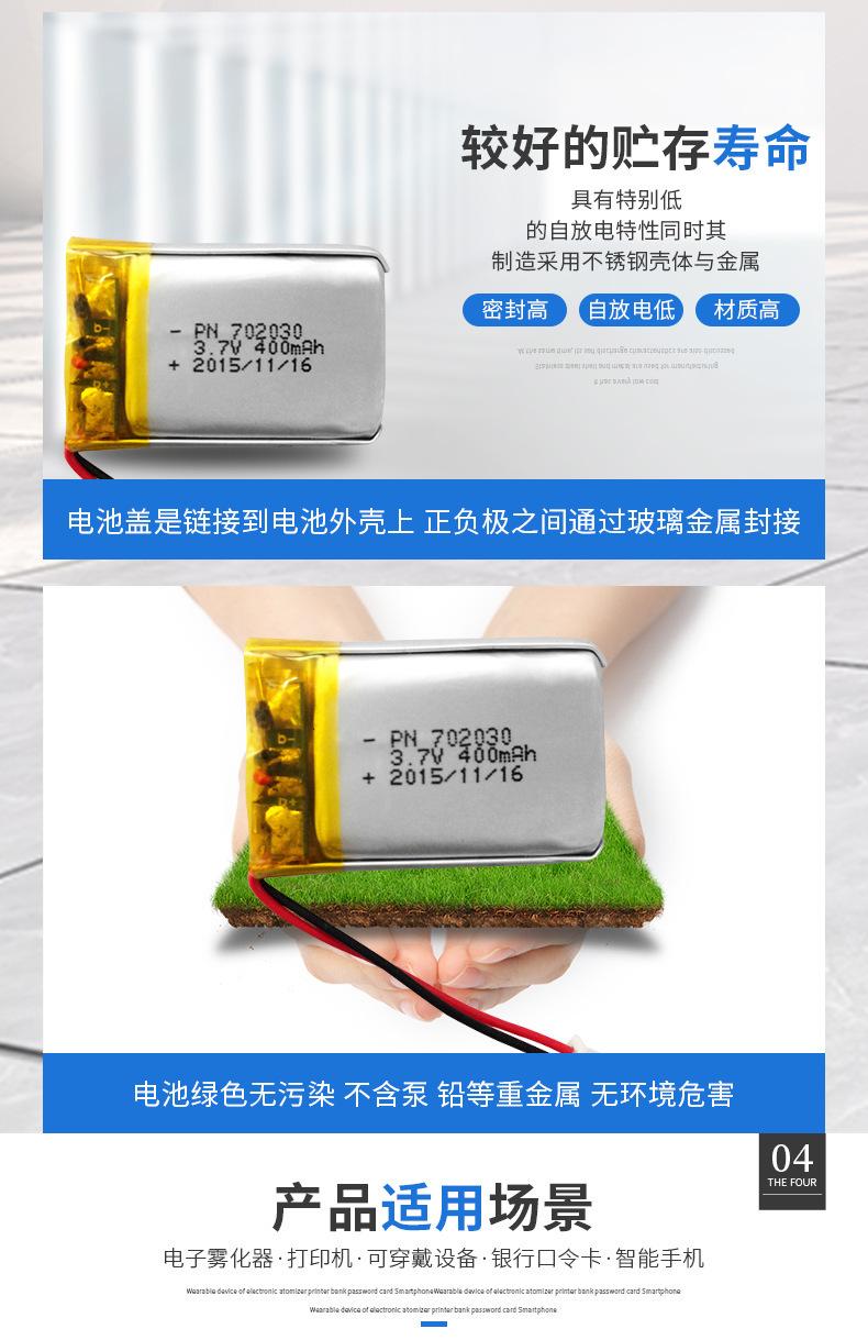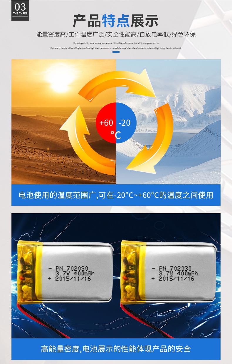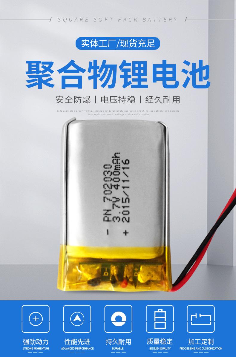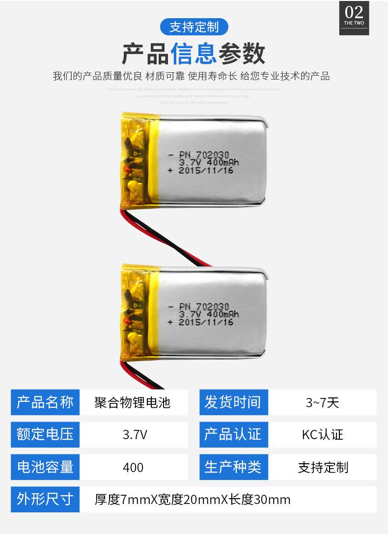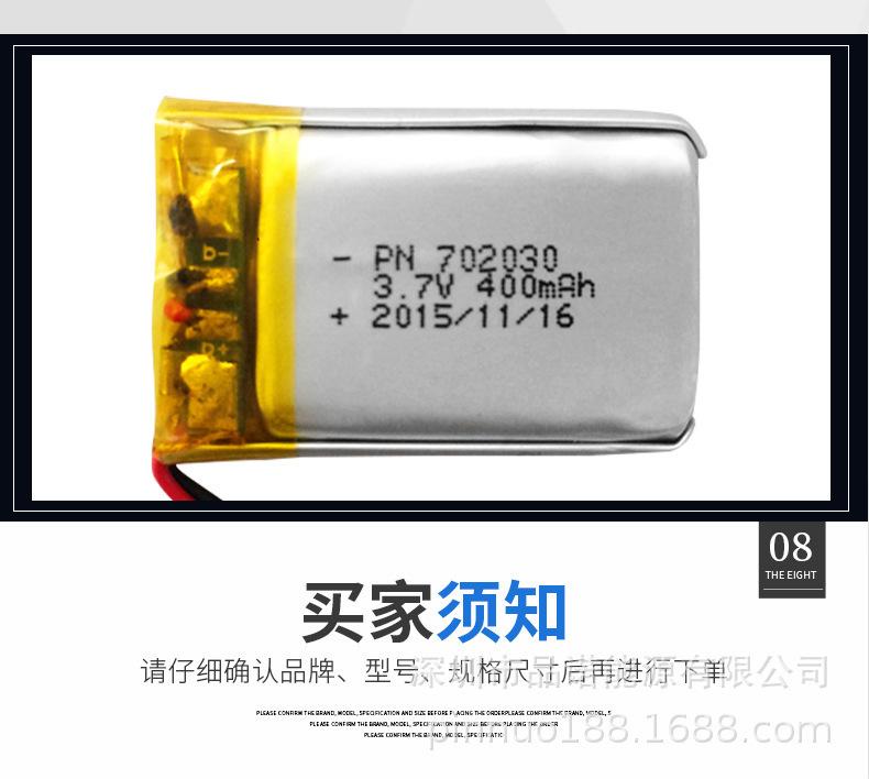Batería de Polímero de Litio 3.7V 702030 400mAh Luz de Toque LED Paquete de Batería para Cámara Inalámbrica