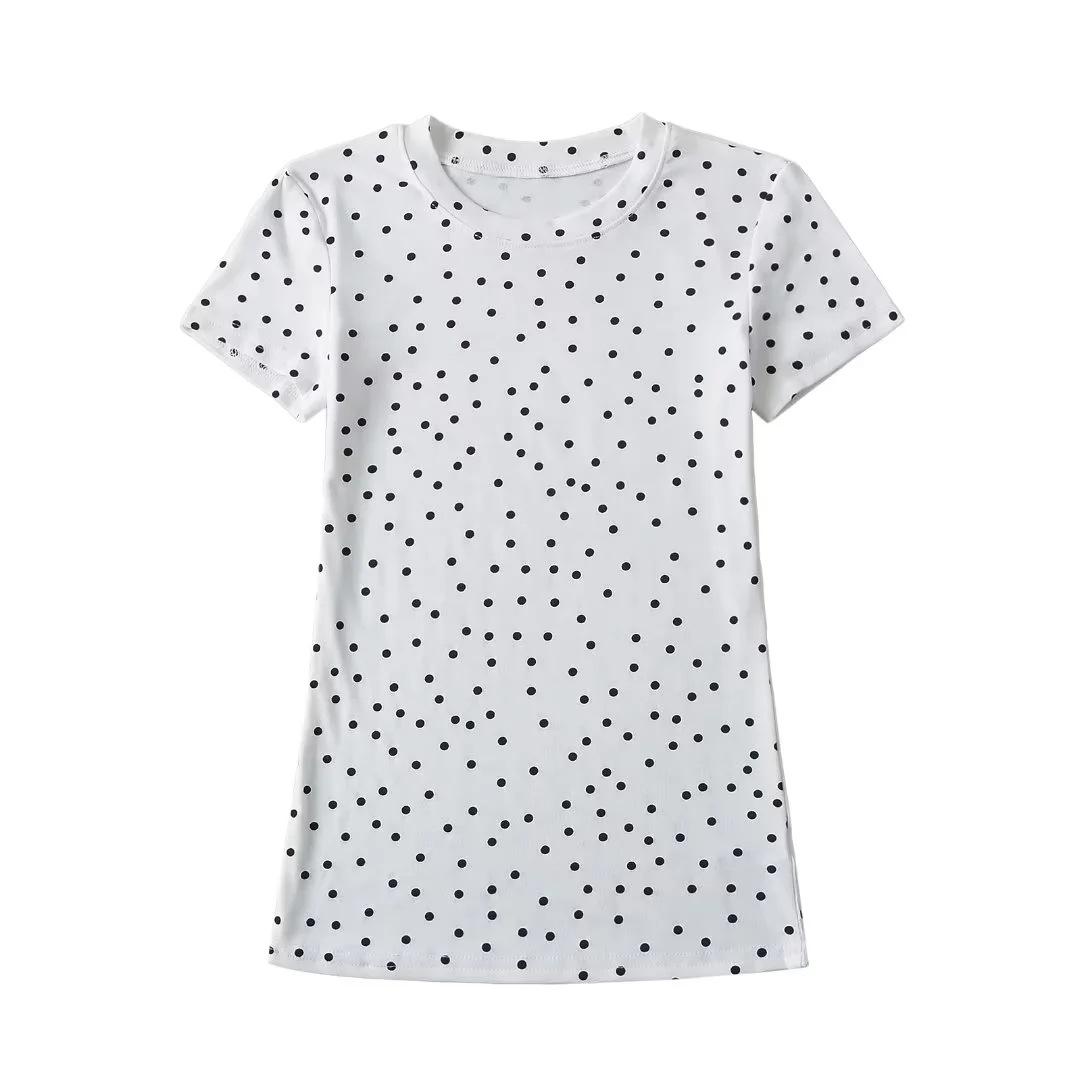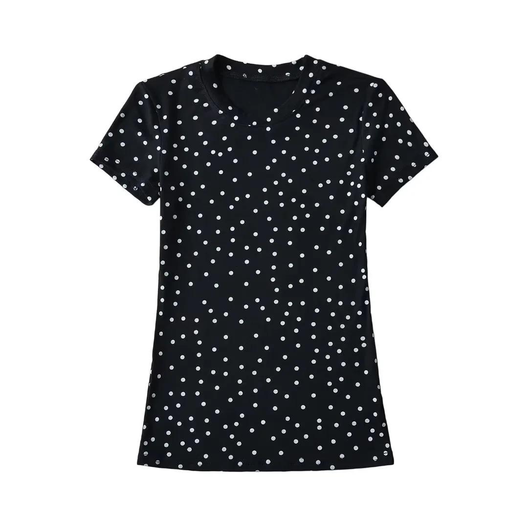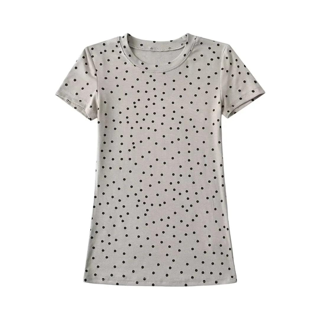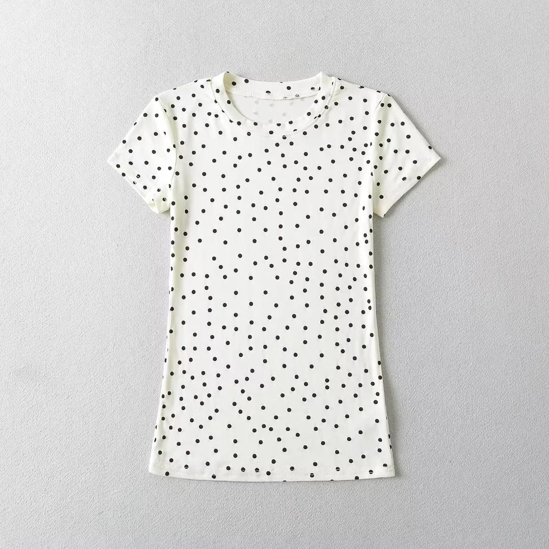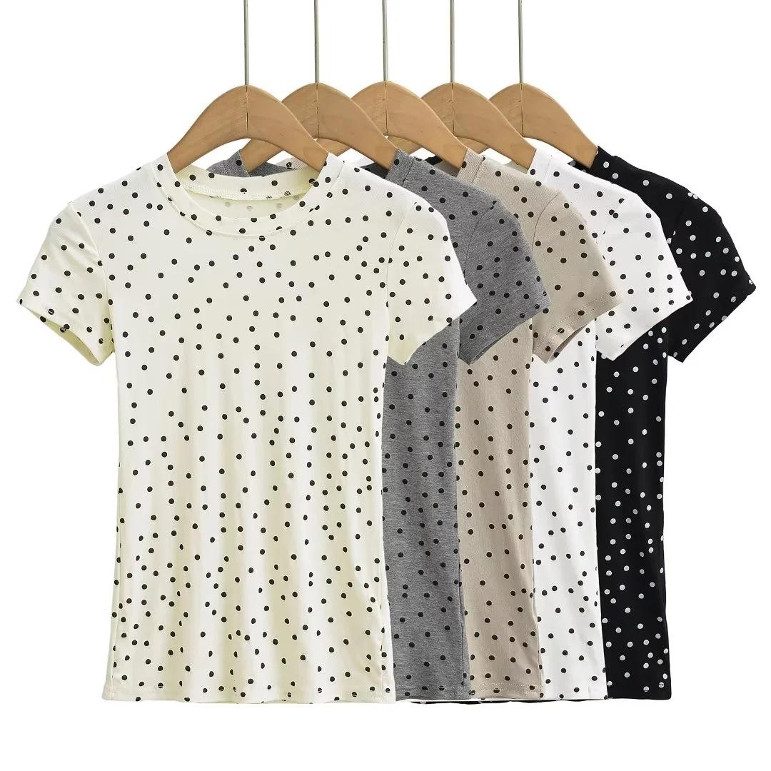 Camiseta de manga corta con cuello redondo y lunares de Niche Design para mujer, novedad de verano 2024, top adelgazante de moda que combina con todo y con los hombros al descubierto.