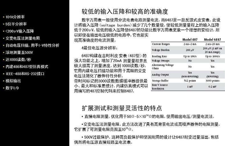 | 6487 | 10 fA - 20 mA | 1 | GPIB, RS-232 |