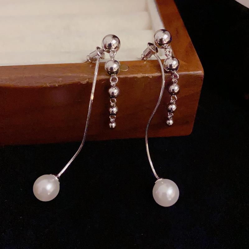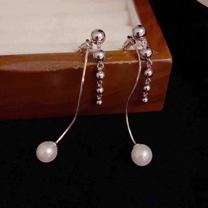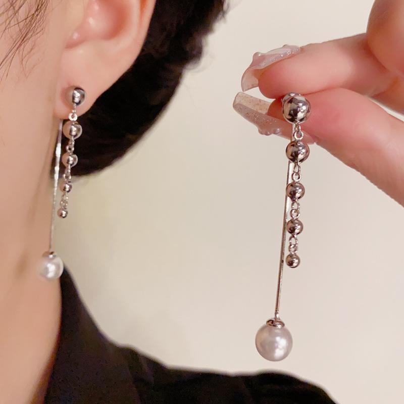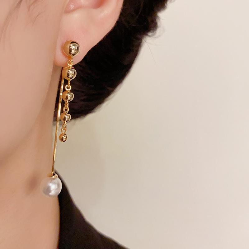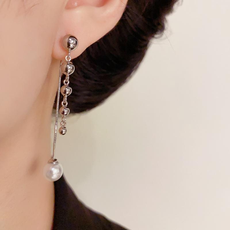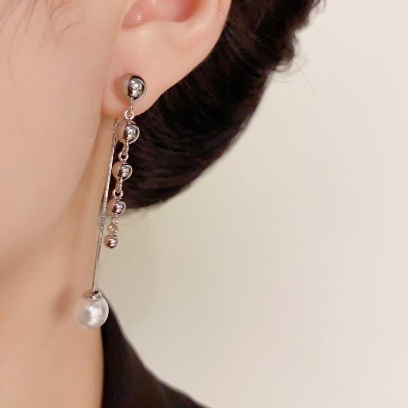 silver-two wearing pearl long tassel earrings (thick gold plating)