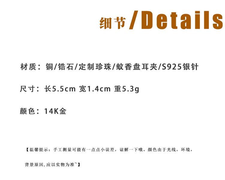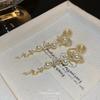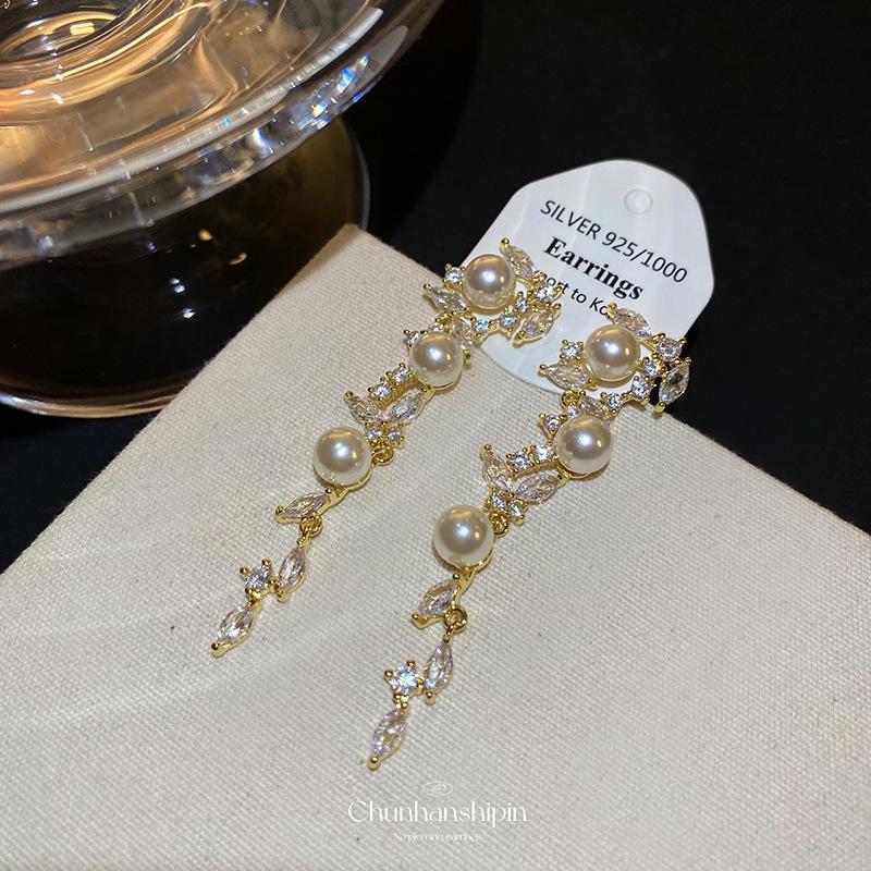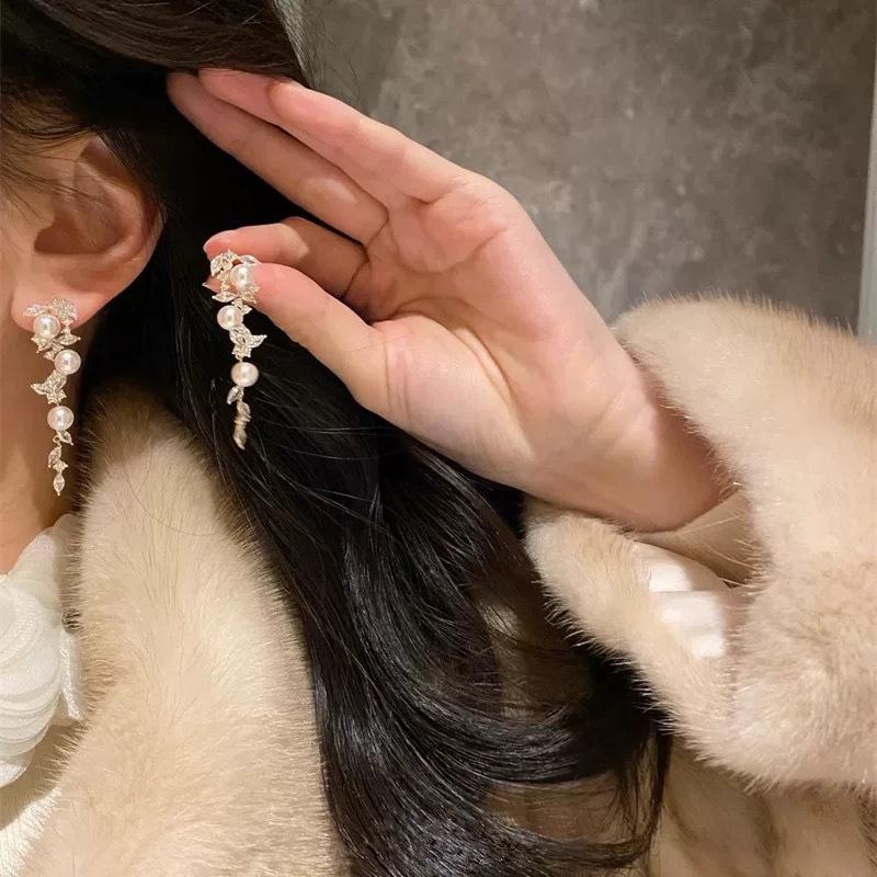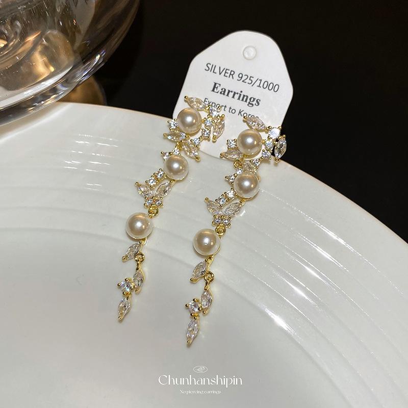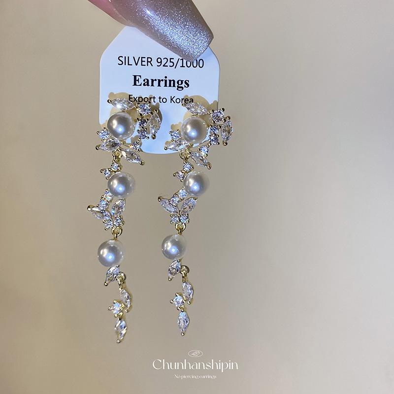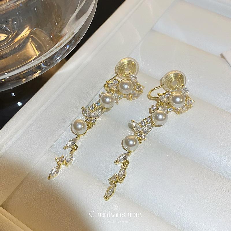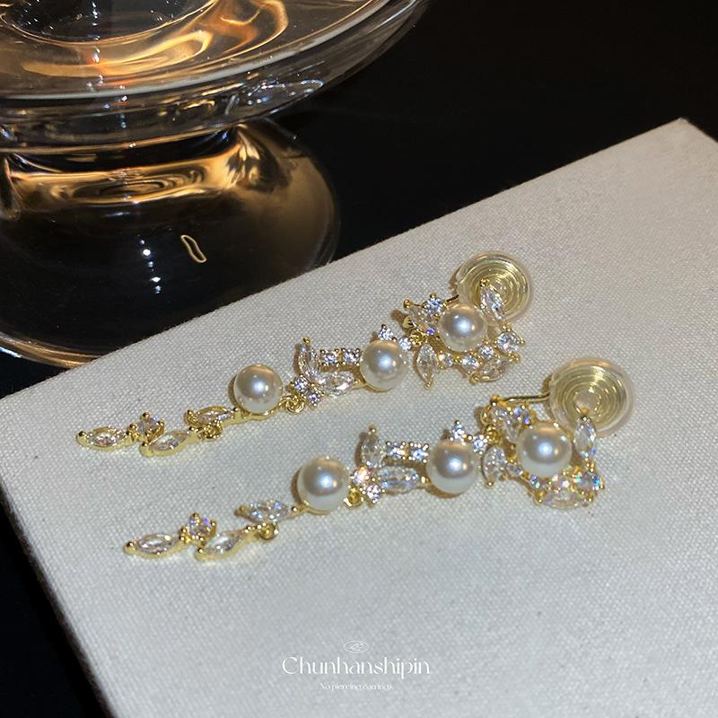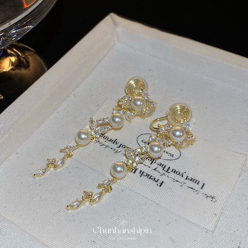 French long zircon pearl ear clips, French long zircon pearl earrings