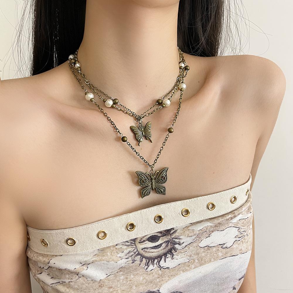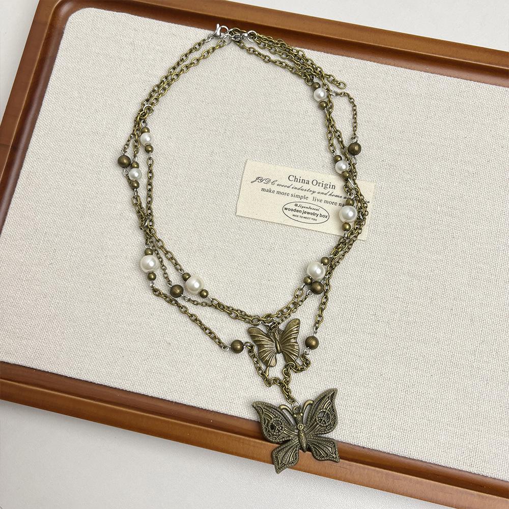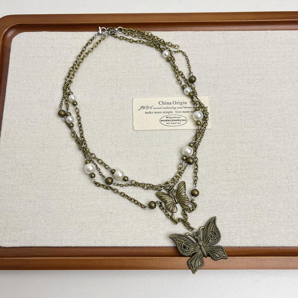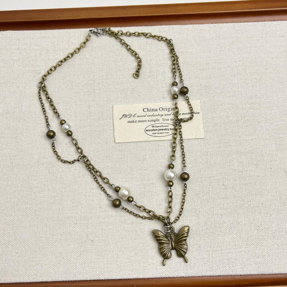 Collar de mariposa de perlas de doble capa con efecto desgastado retro para mujer, cadena de clavícula de nicho de lujo ligero de alta gama, nuevos accesorios 2024