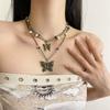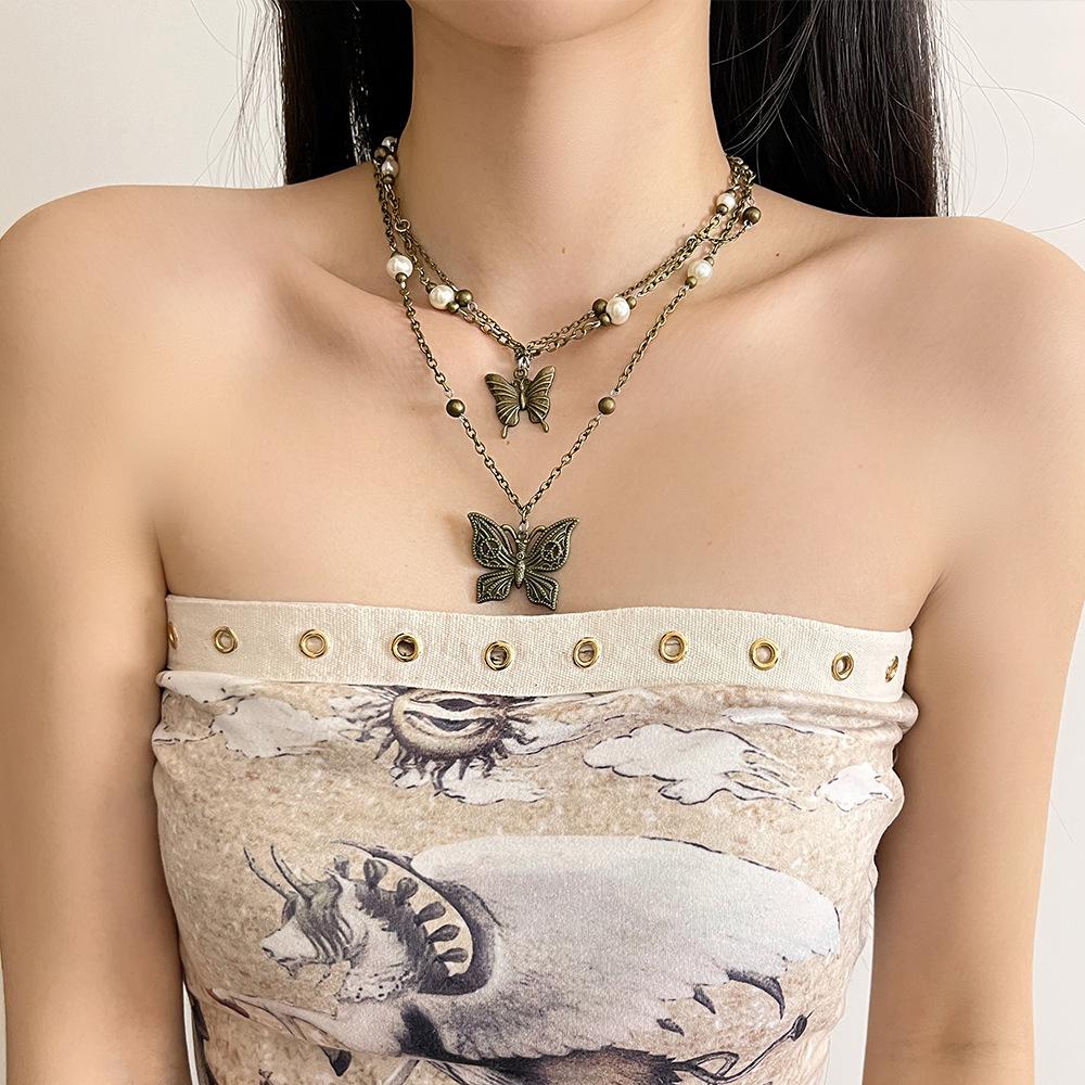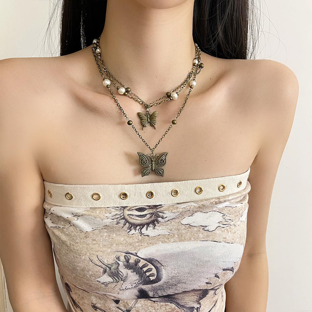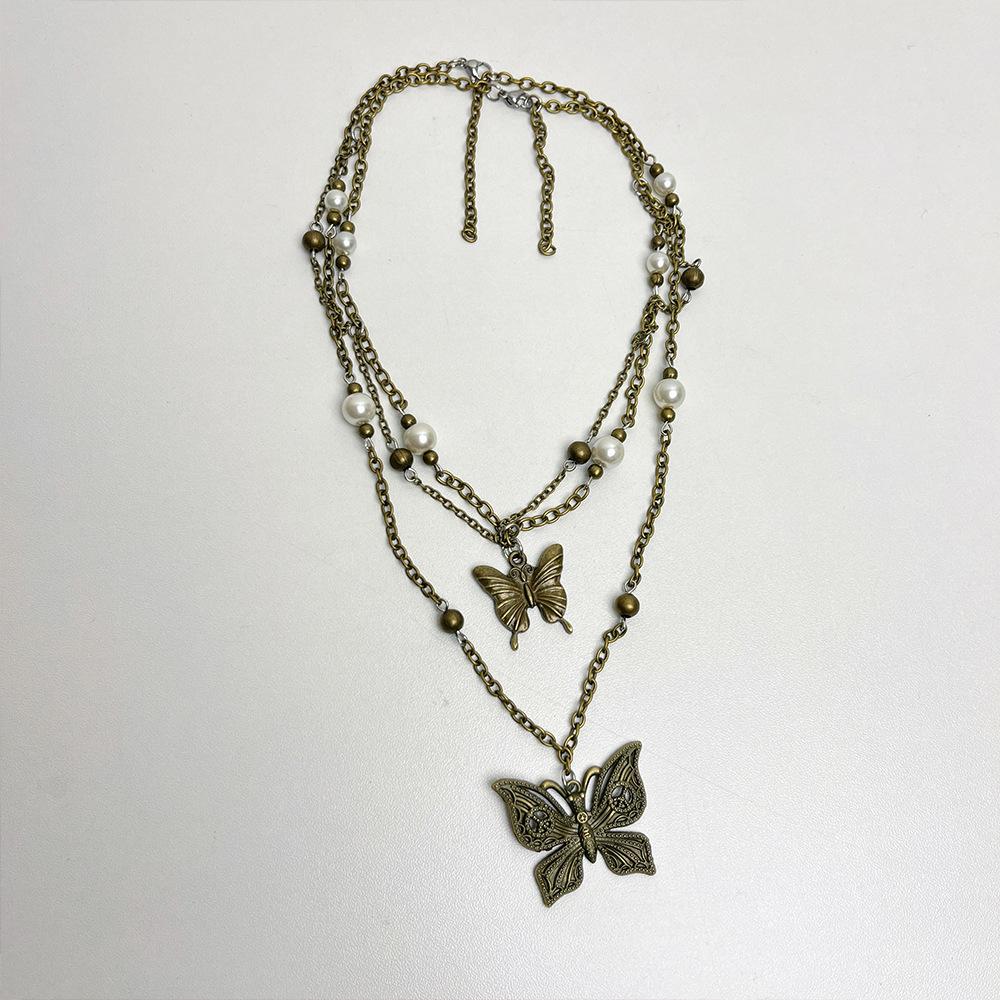 Collar de mariposa de perlas de doble capa con efecto desgastado retro para mujer, cadena de clavícula de nicho de lujo ligero de alta gama, nuevos accesorios 2024