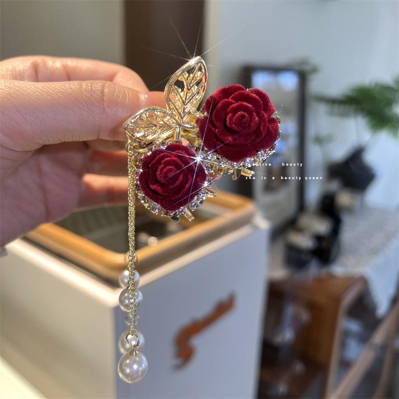 Horquilla para el pelo con forma de rosa, con borla de terciopelo, elegante, con forma de tiburón, de metal, de gran tamaño