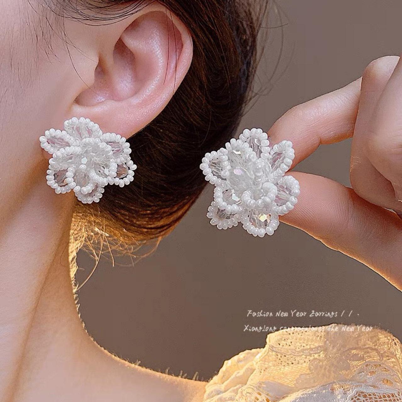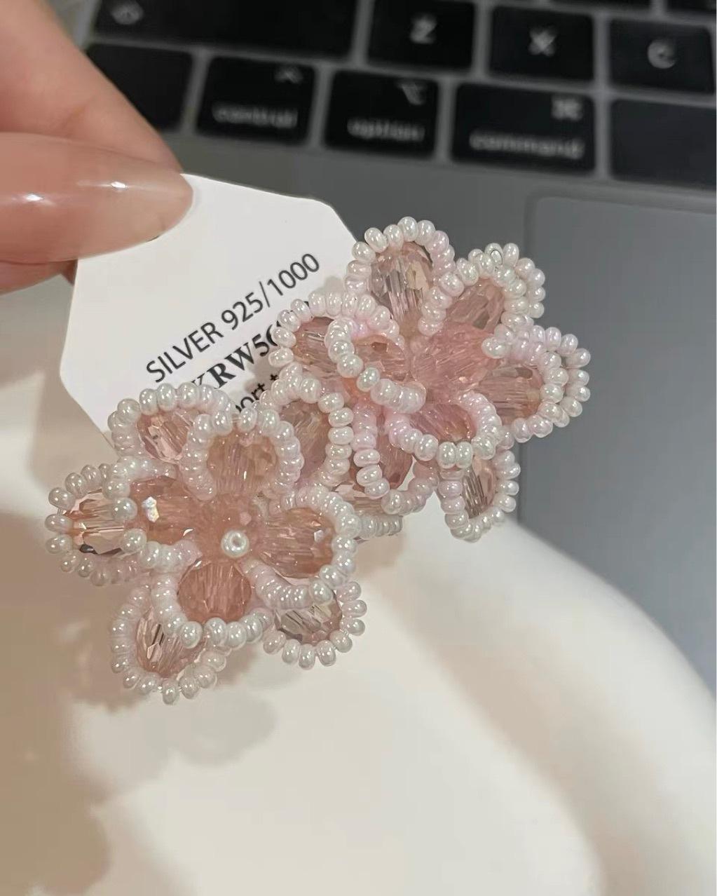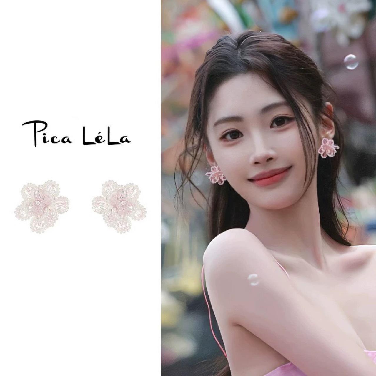 Aretes de Botón de Flor de Perla de Cristal Rosa Súper Hada 2024 Nuevos Aretes de Nicho Aretes de Temperamento de Lujo Ligero
