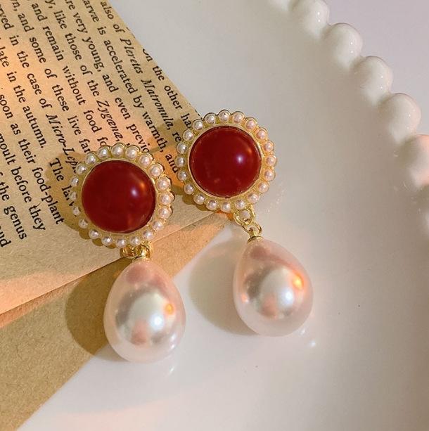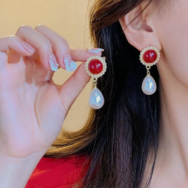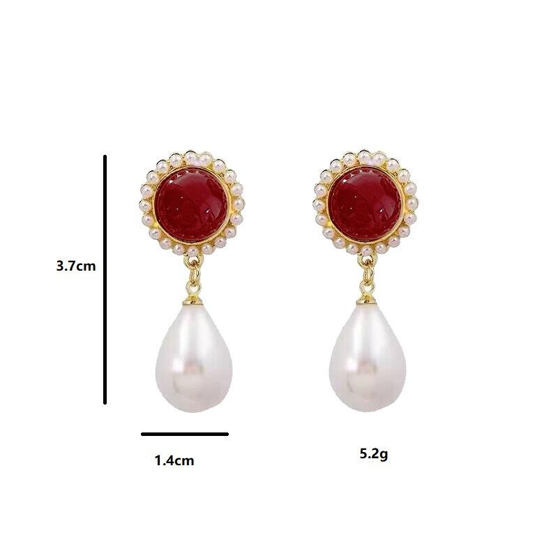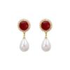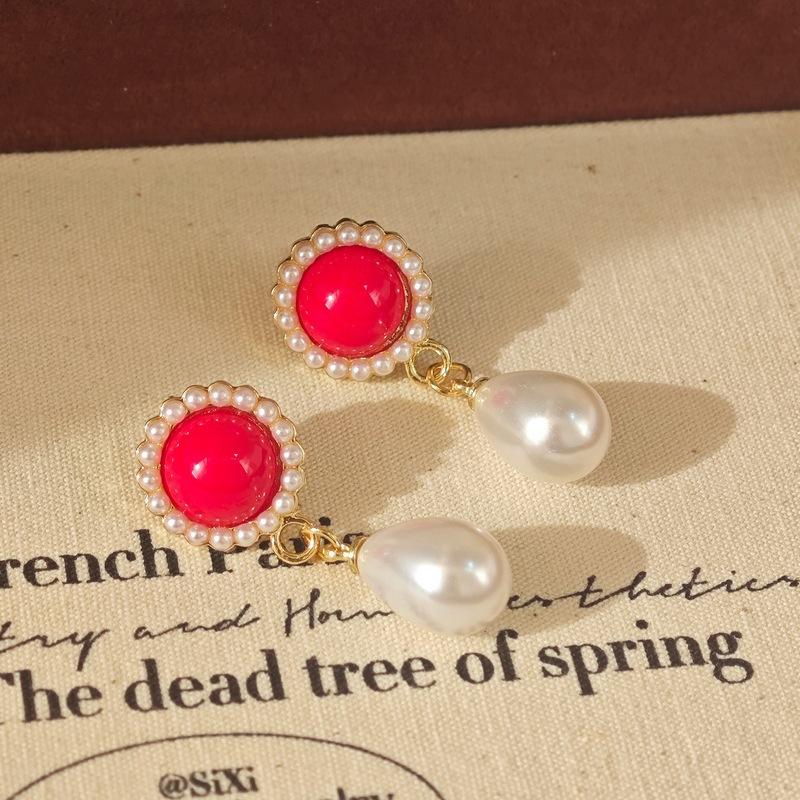 Pendientes de diamantes barrocos franceses, sencillos y elegantes, con círculos rojos de perlas, pendientes de perlas retro.