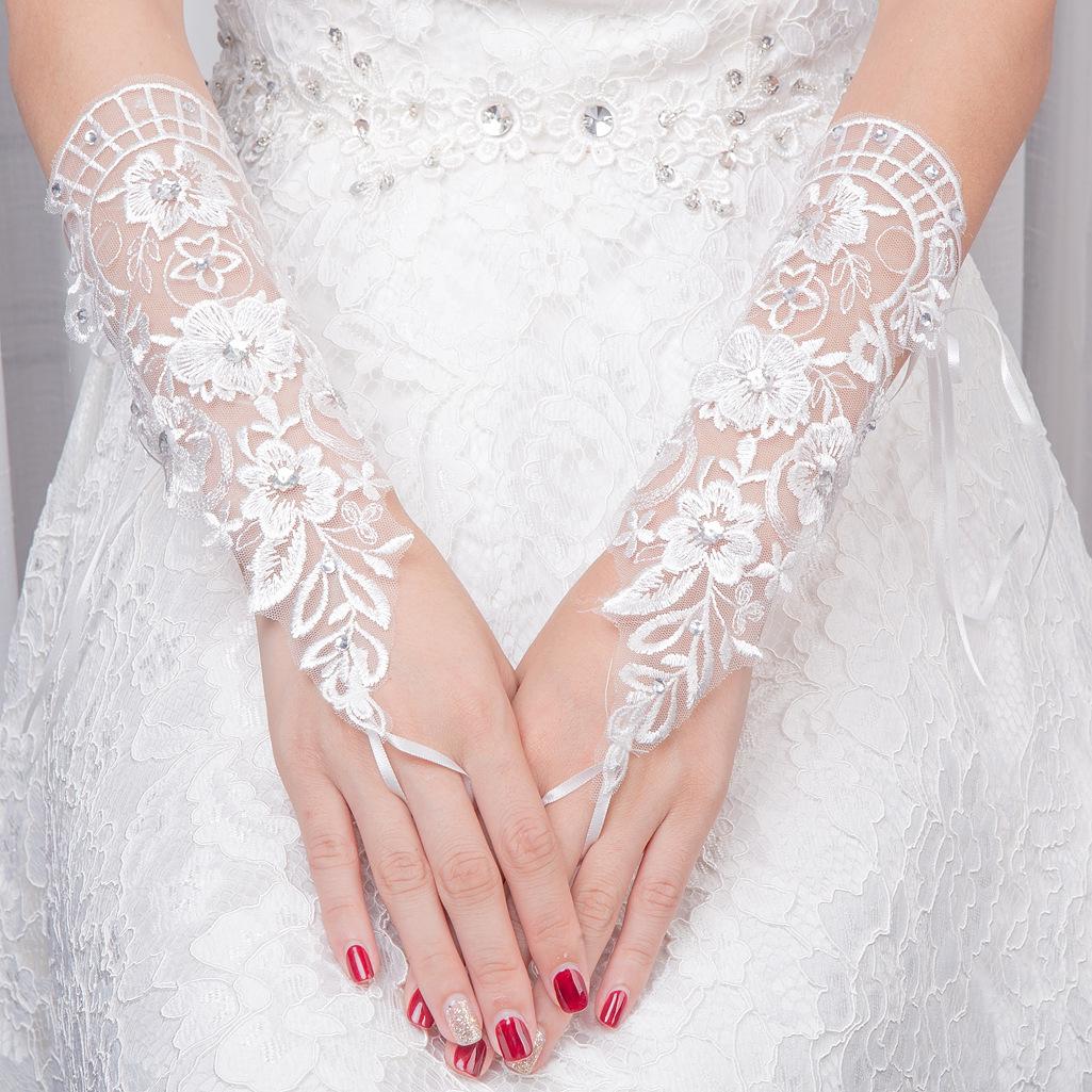 Guantes de boda nupciales directos de fábrica en stock flor blanca bordado de diamantes forma de abanico sin dedos accesorios guantes al por mayor