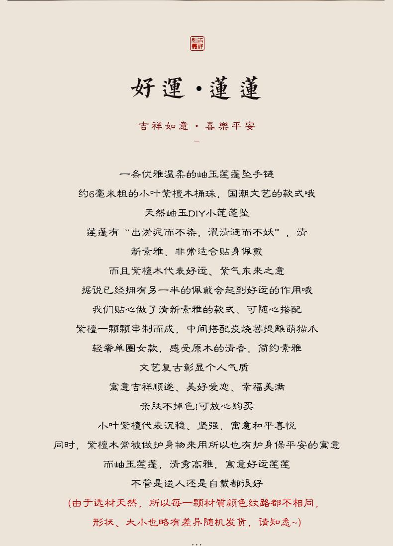 Los materiales, texturas y colores naturales varían. Algunos cristales naturales presentan relleno de algodón natural, grietas por hielo, defectos minerales y defectos artificiales causados durante el pulido. Algunas cuentas individuales de pulseras presentan ligeras diferencias de tamaño. Esto es lo que llamamos belleza imperfecta. Al igual que cuando te gusta una persona, si te gusta, debes aceptar sus defectos. Nadie es perfecto, y mucho menos una gema de hace cientos de millones de años. Por favor, comprende y cuida los cristales naturales. Espero que cada cristal que tengas te traiga buena suerte.