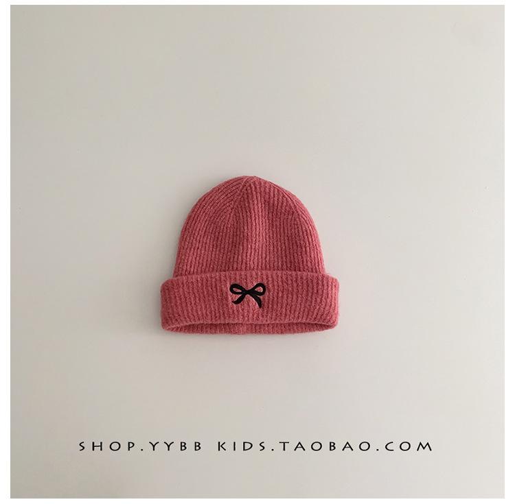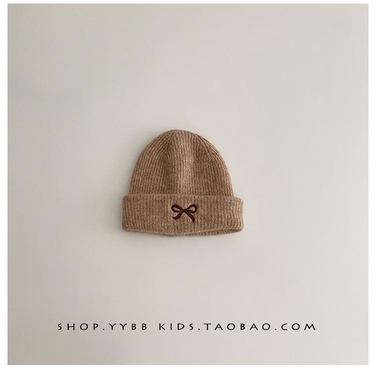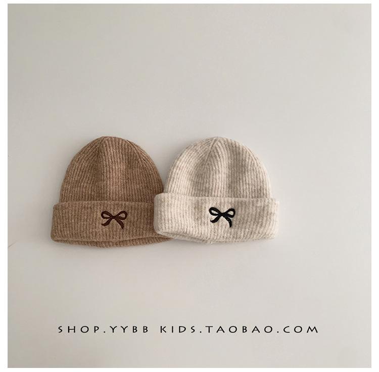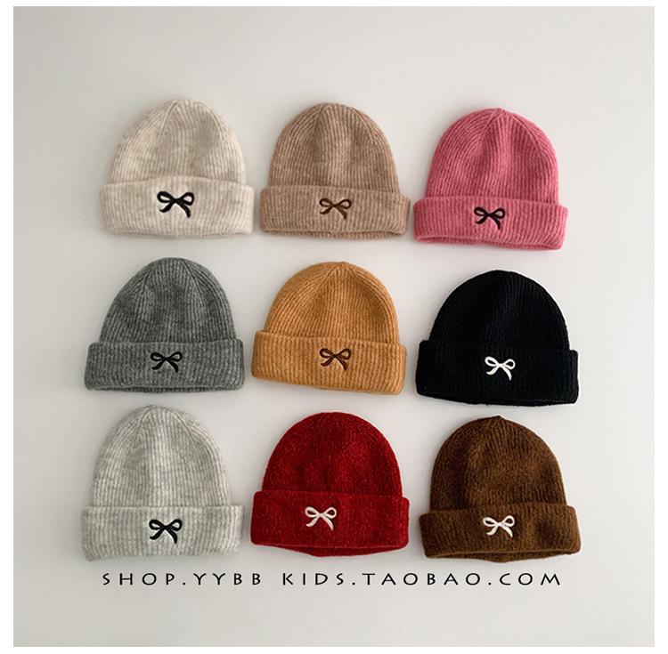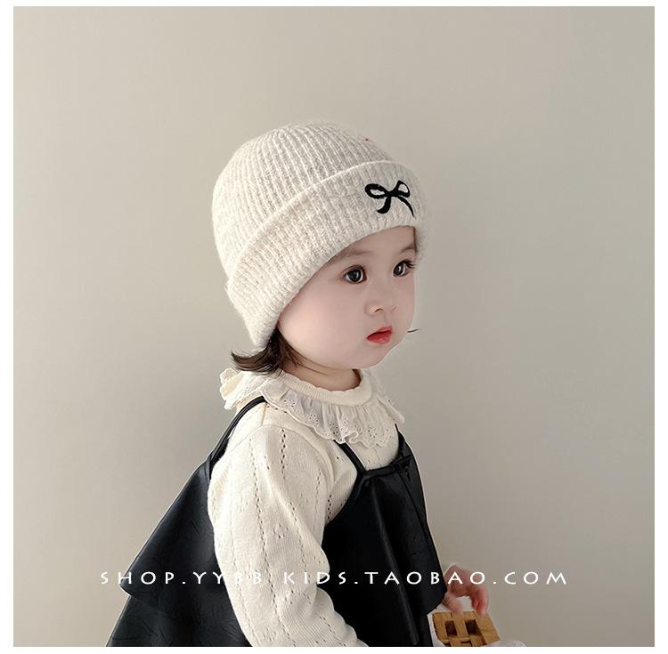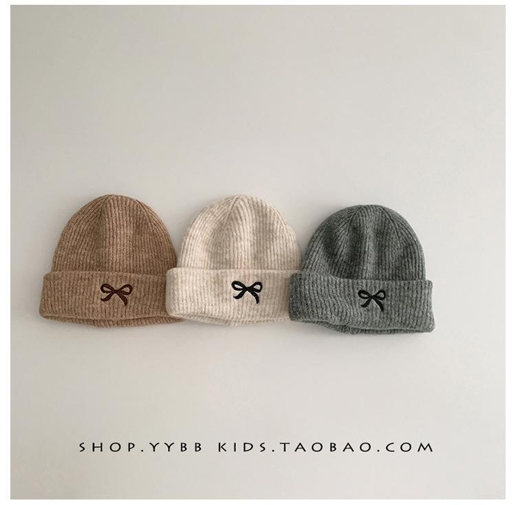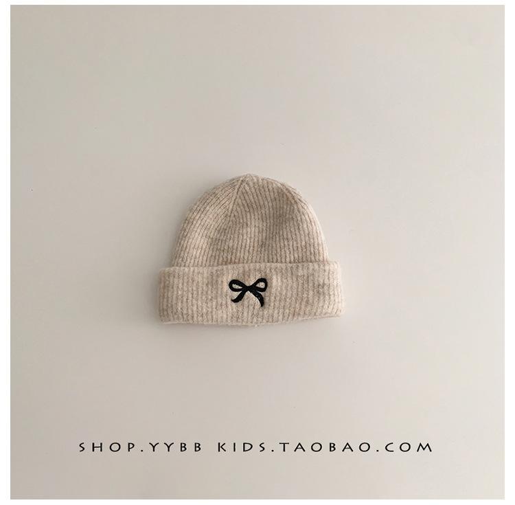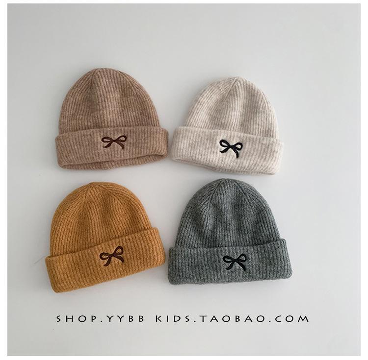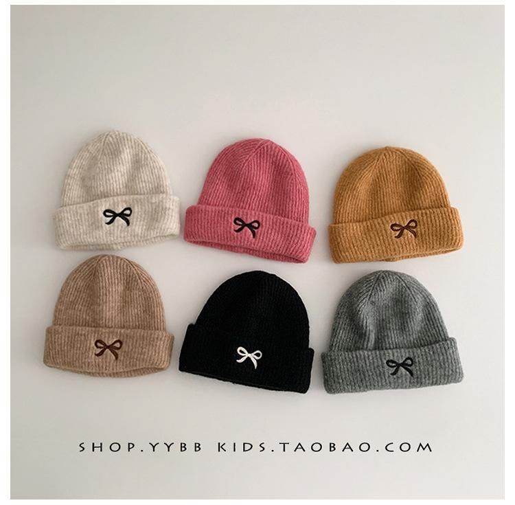 Gorro de punto con lazo bordado coreano para niña, gorro grueso y cálido de otoño e invierno, gorro de lana para niña pequeña a la moda