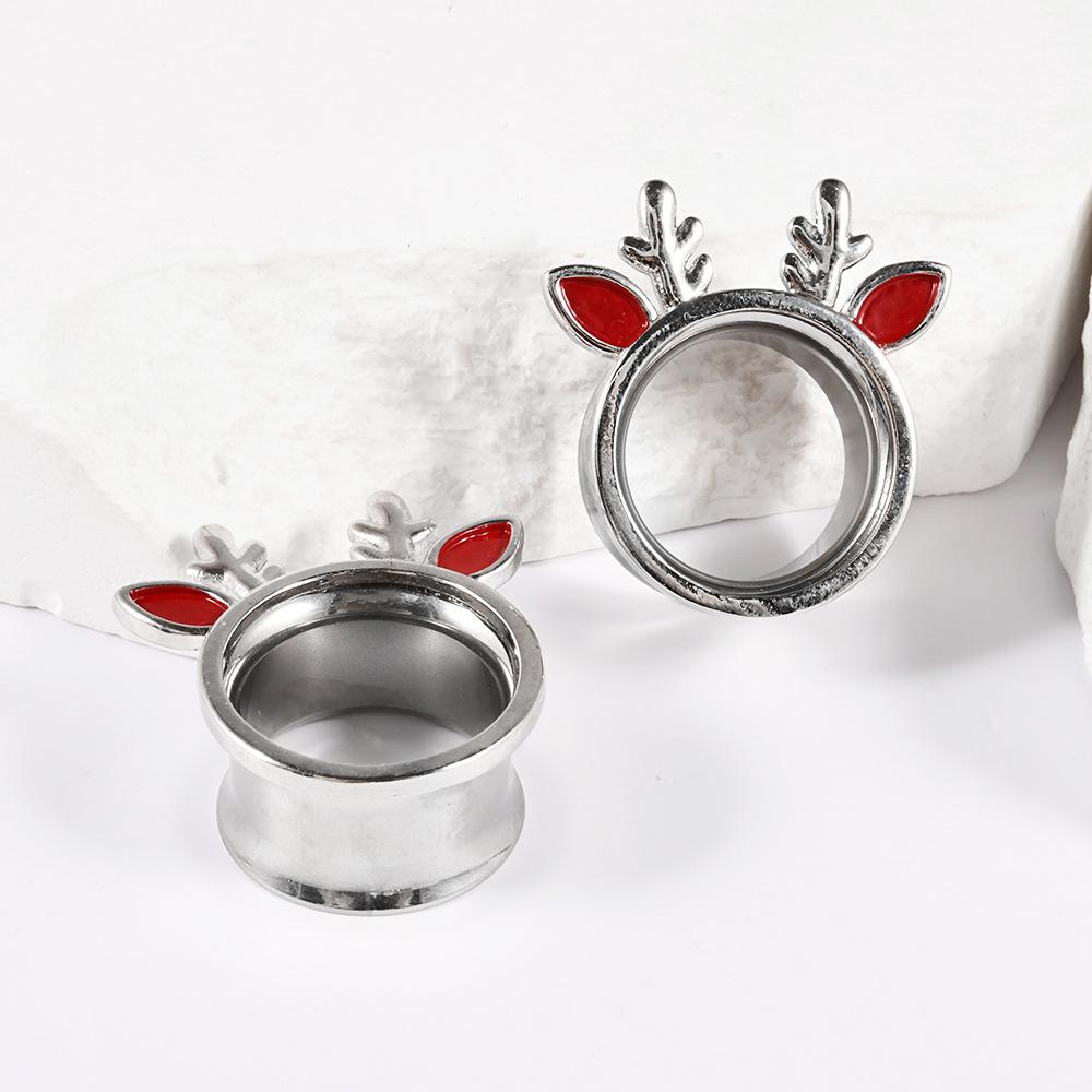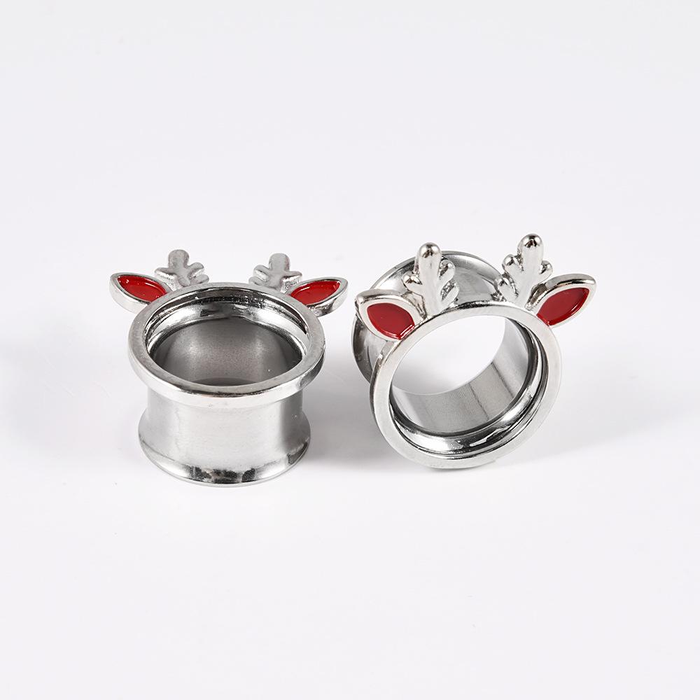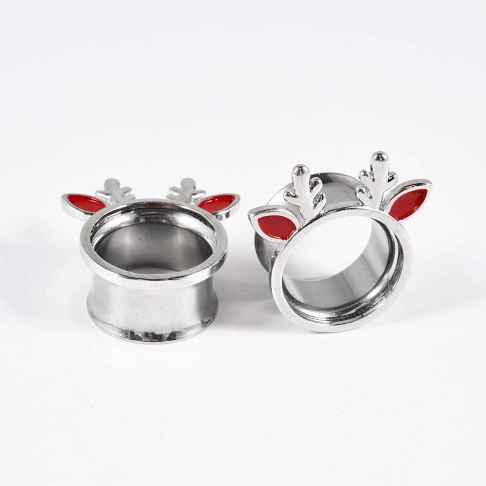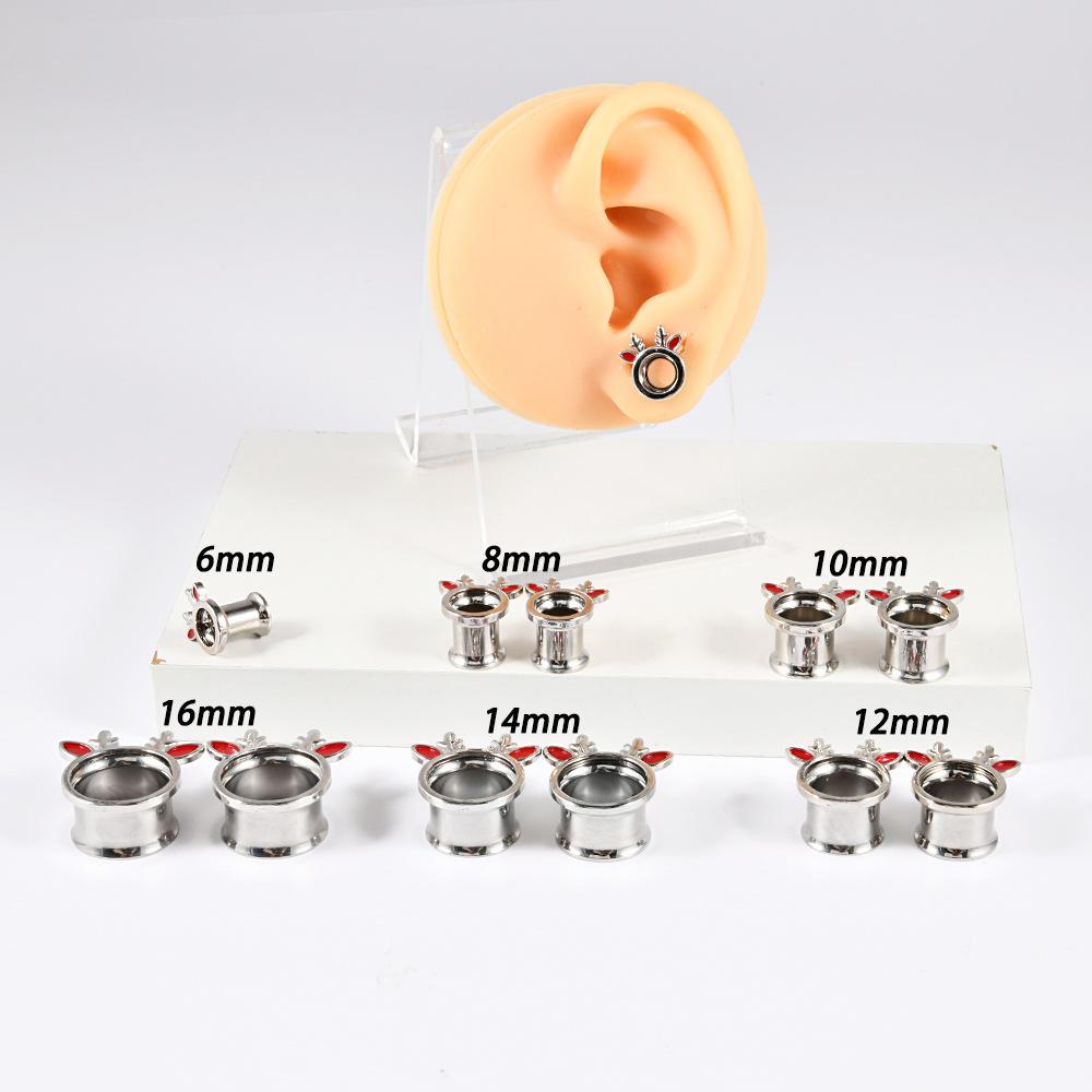 .Nombre: Pendientes de acero inoxidable transfronterizo con forma de asta de ciervo de doble trompeta con goteo de aceite rojo, pendientes color acero para expansión de oreja, joyería para expansión de oreja