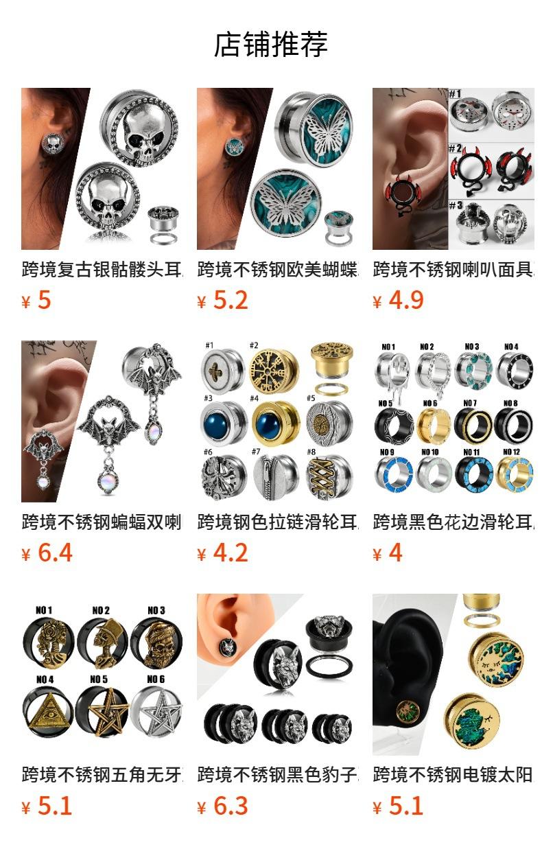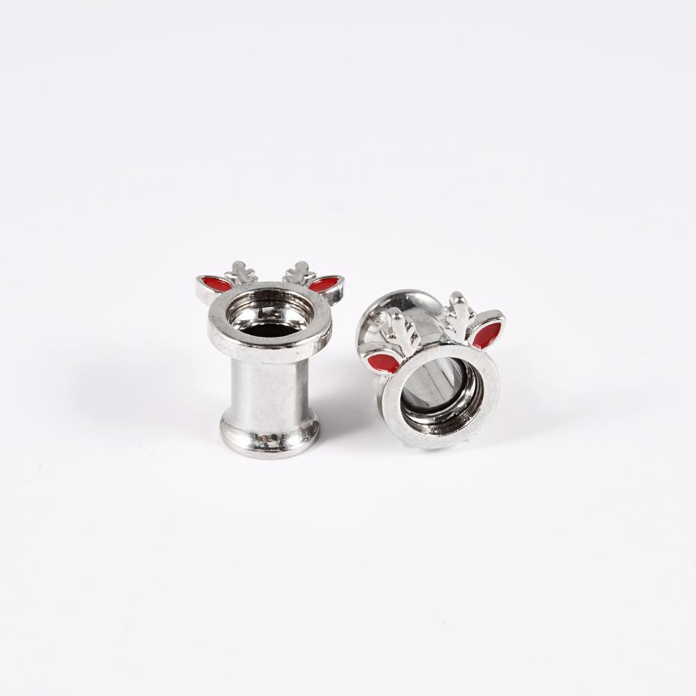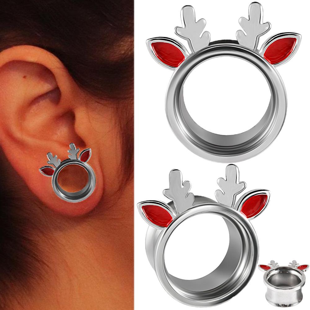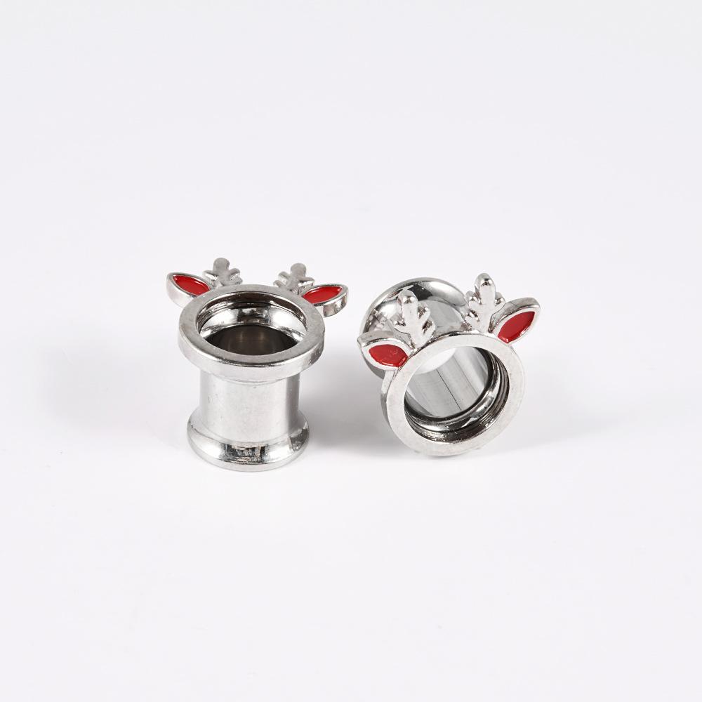 .Nombre: Pendientes de acero inoxidable transfronterizo con forma de asta de ciervo de doble trompeta con goteo de aceite rojo, pendientes color acero para expansión de oreja, joyería para expansión de oreja