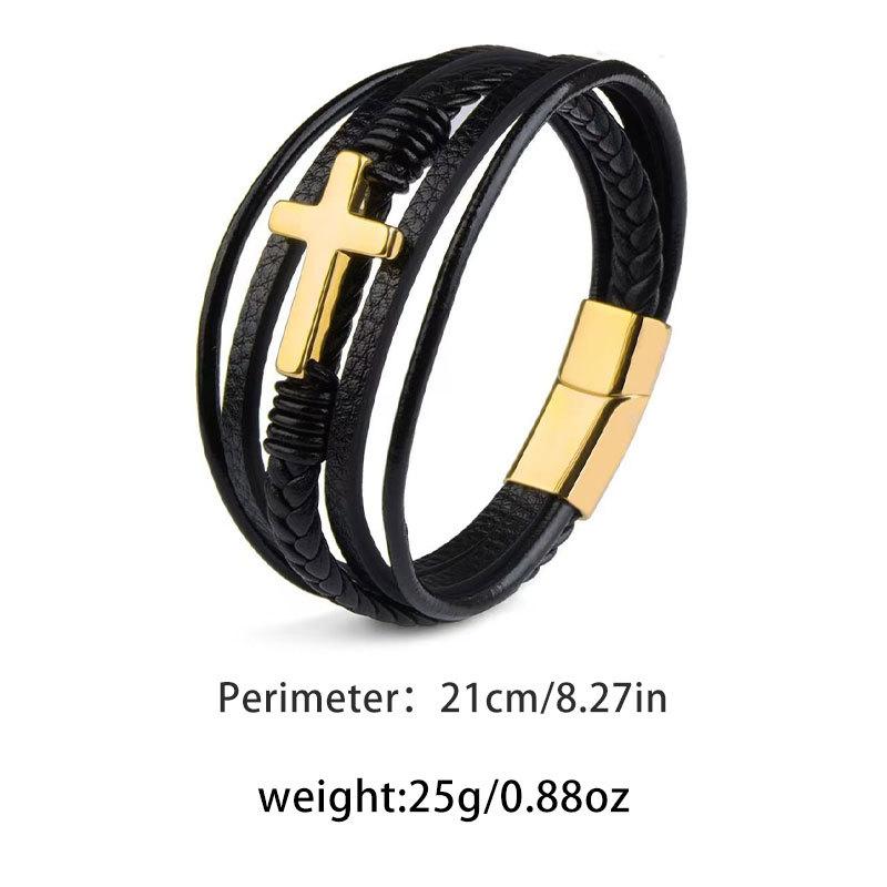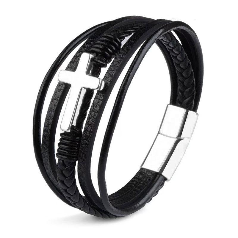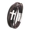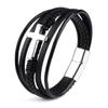 Pulsera de cuero punk de cruz de venta caliente transfronteriza para hombre, pulsera multicapa tejida a mano con cuerda y hebilla magnética, suministro al por mayor de joyería