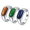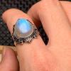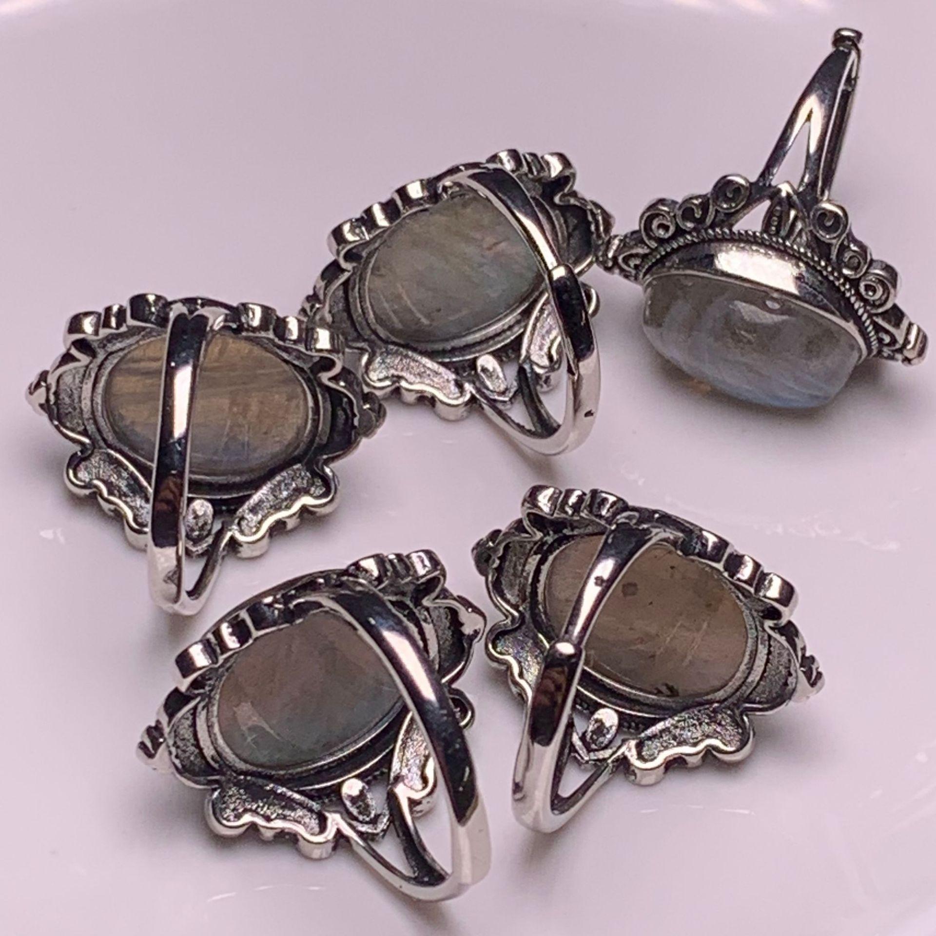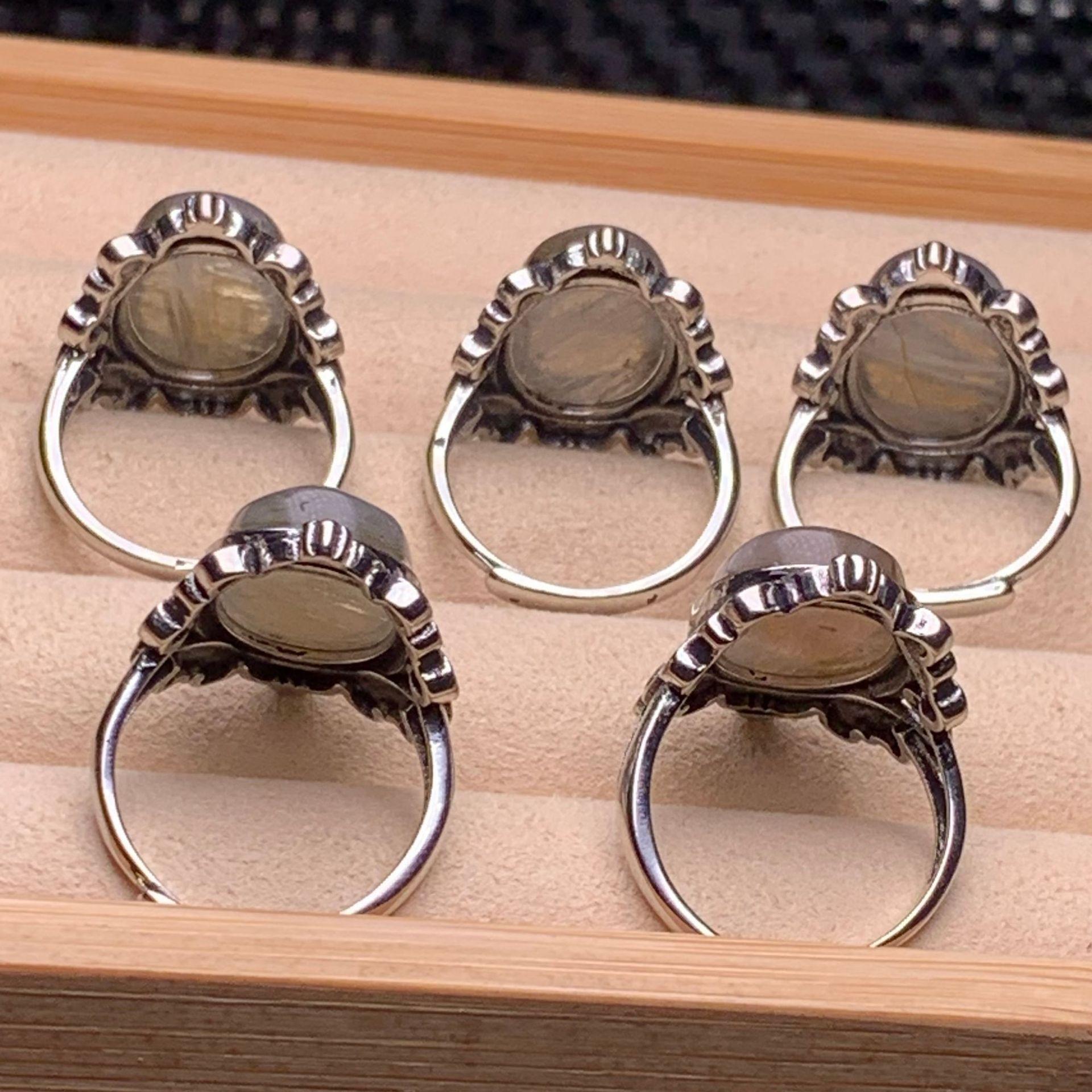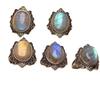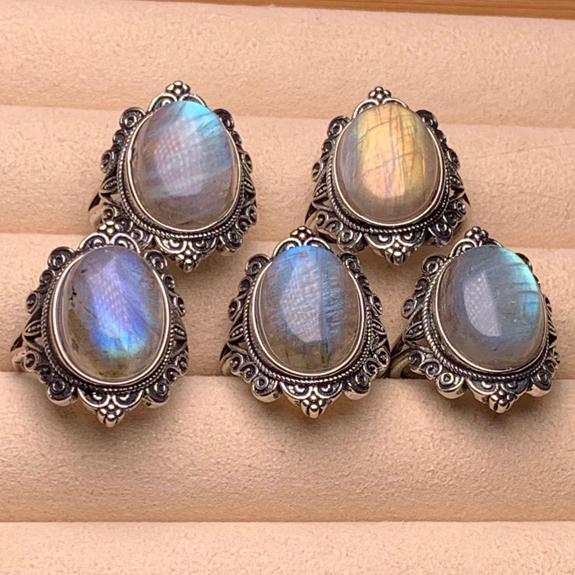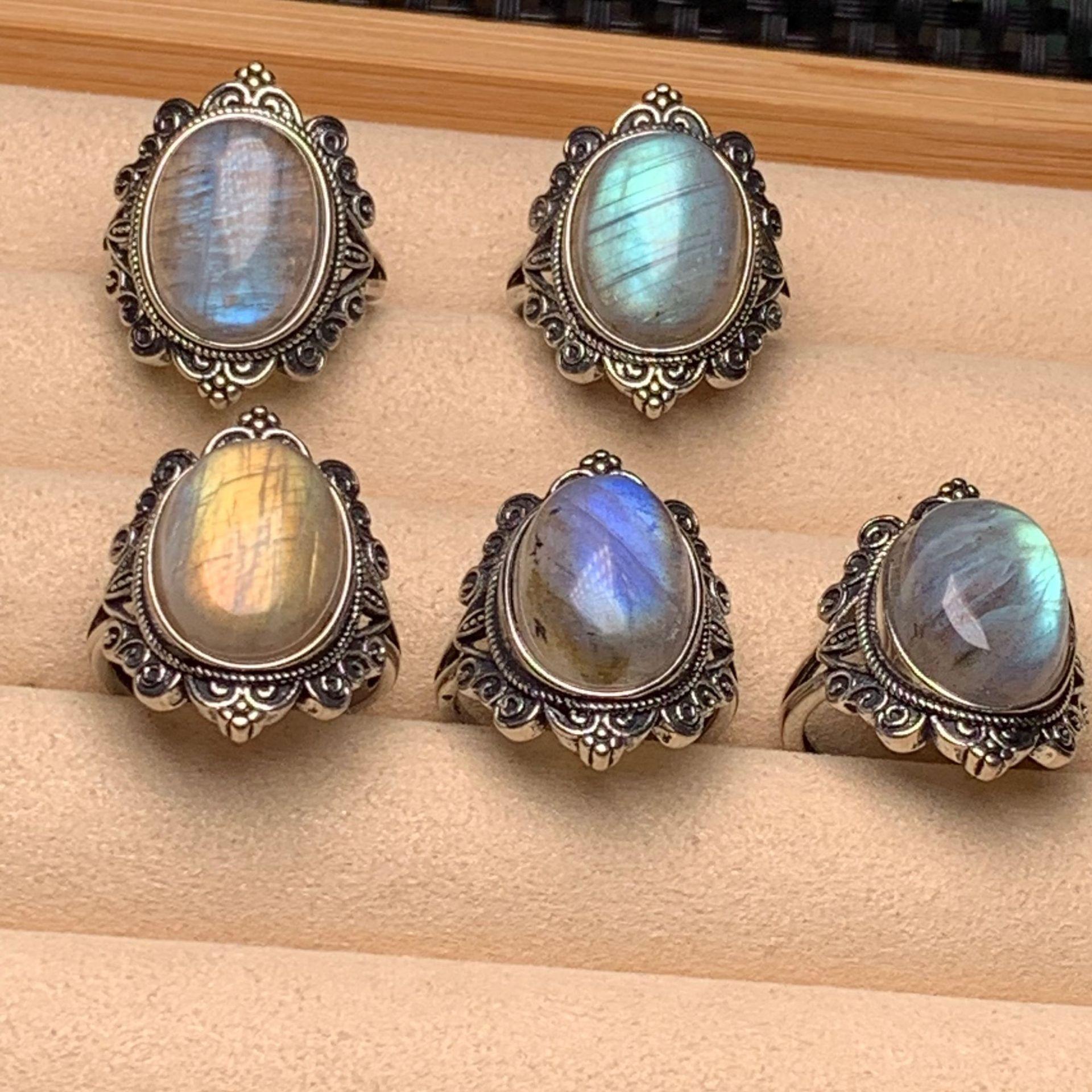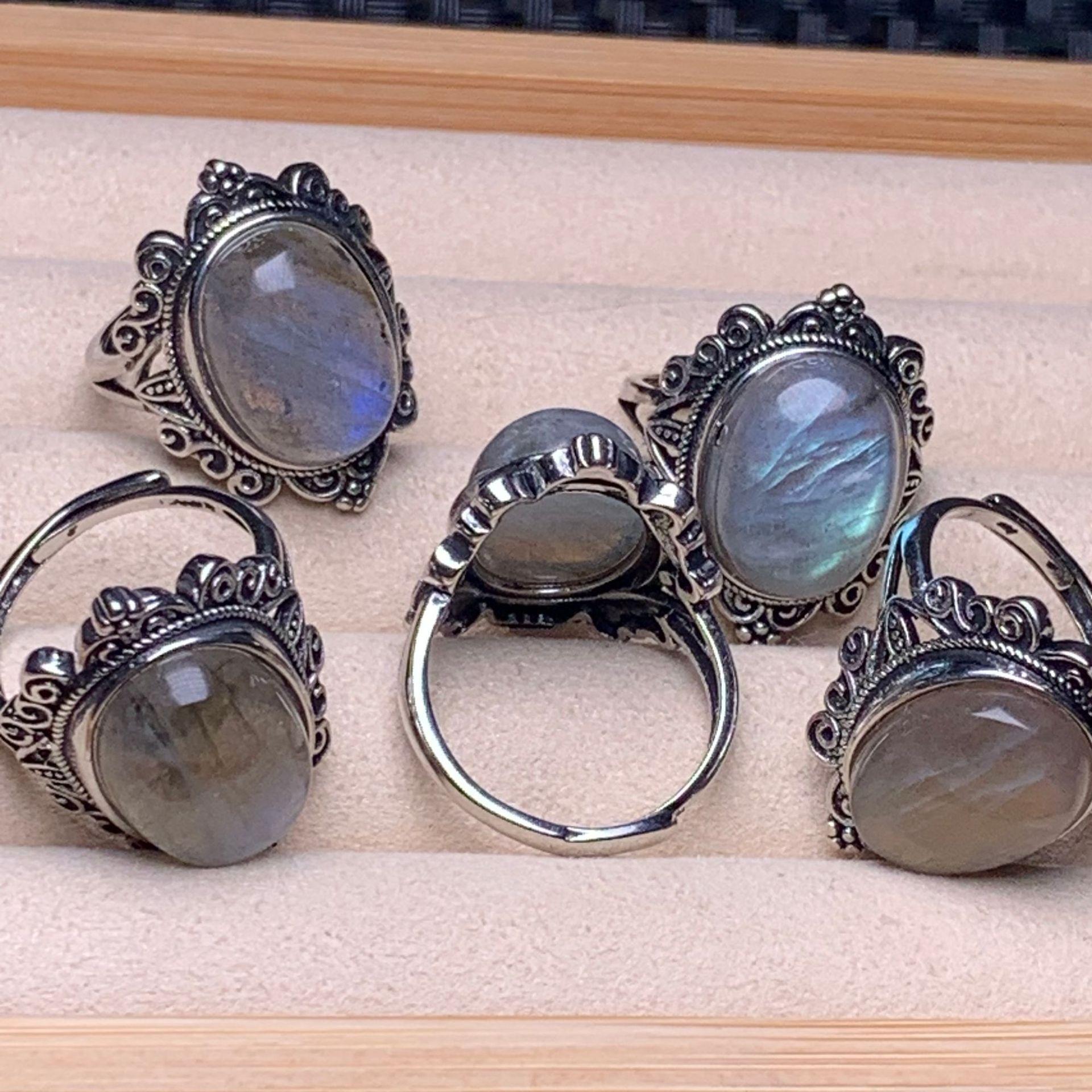 Anillo retro plateado al por mayor de fábrica con incrustaciones de feldespato natural de extracción viva unisex personalidad moda exquisito luz azul