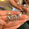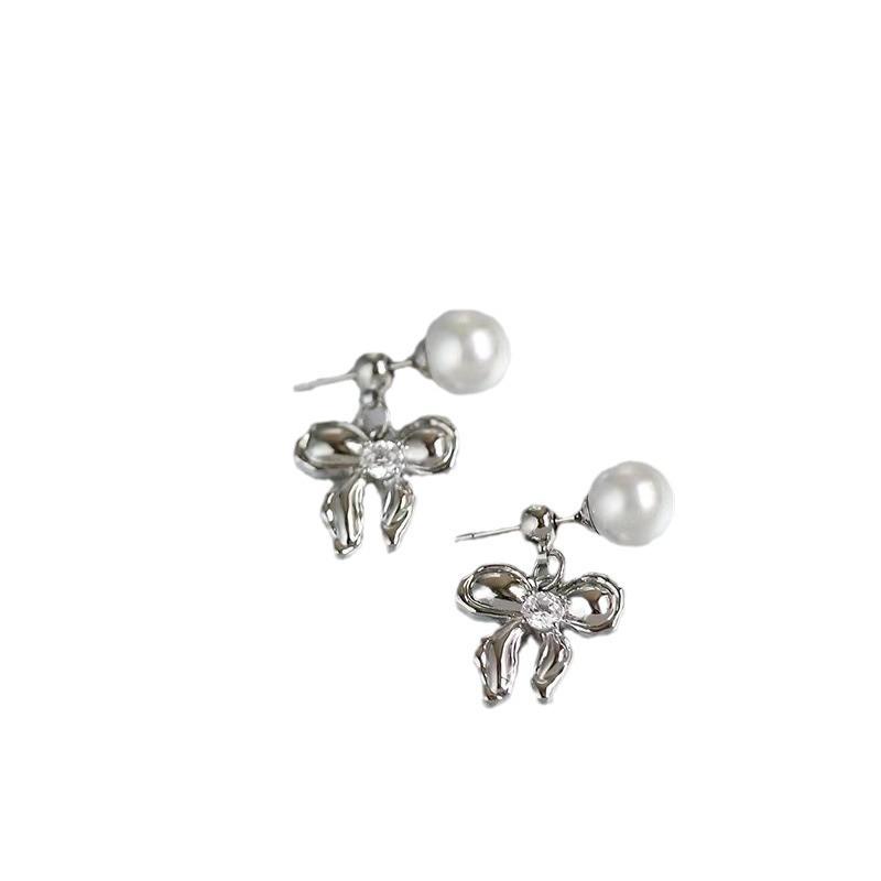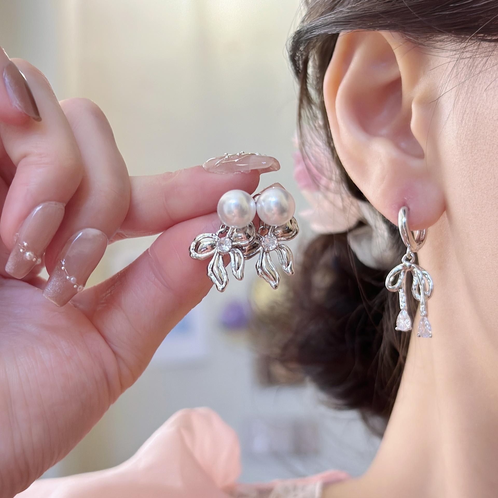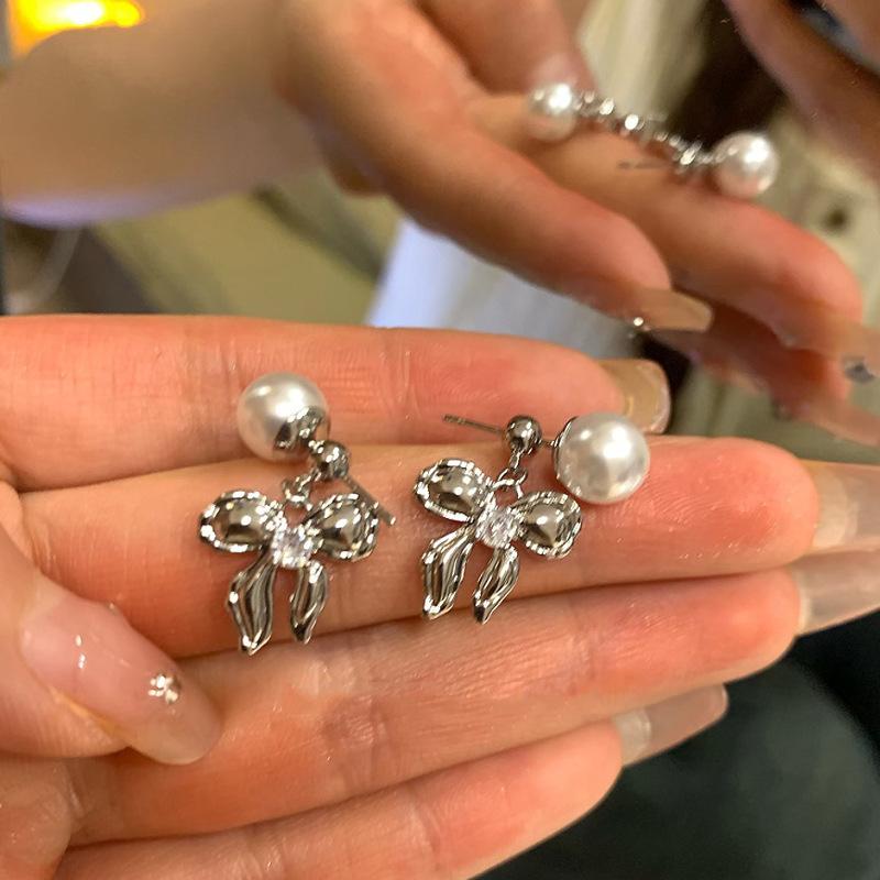Pendientes de perlas con lazo de lujo con aguja plateada, ligeros y combinables, para mujer, estilo frío, con un toque de sentido avanzado, al por mayor