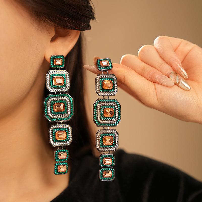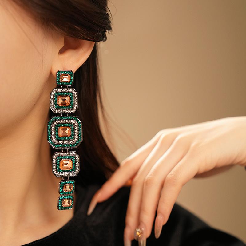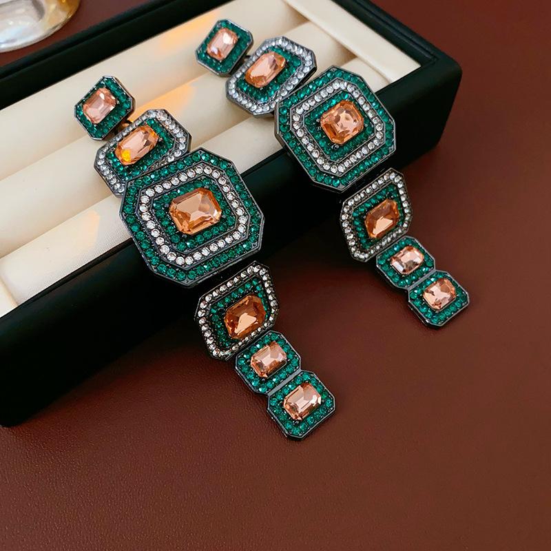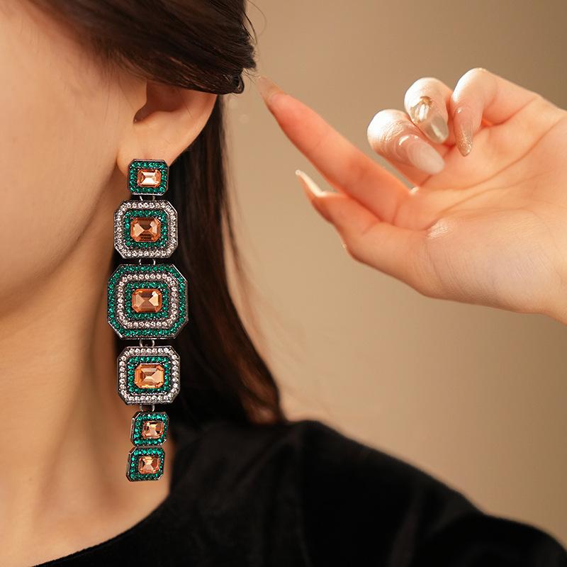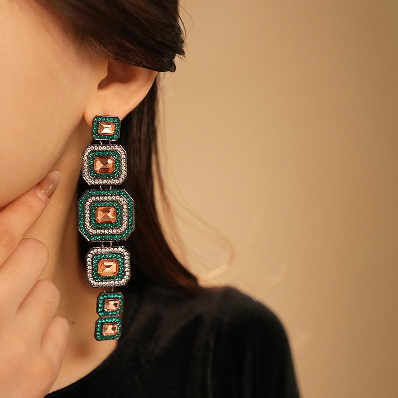 Aretes Medievales Vintage Aguja de Plata Diamante Verde Geométricos Aretes de Alta Gama Aretes de Diseño de Moda Europeo y Americano