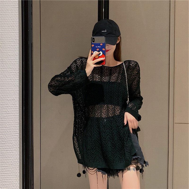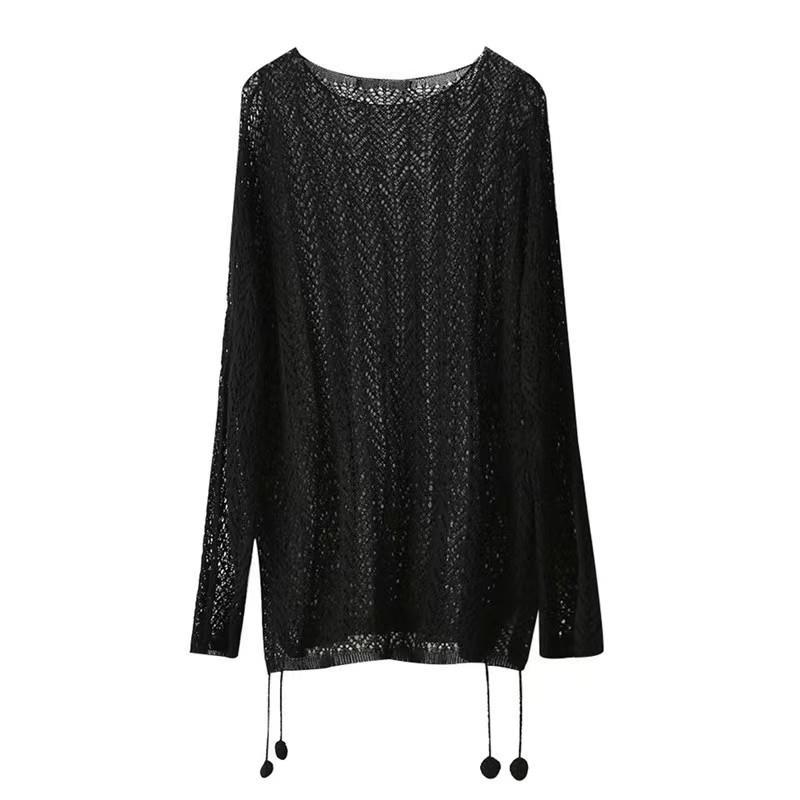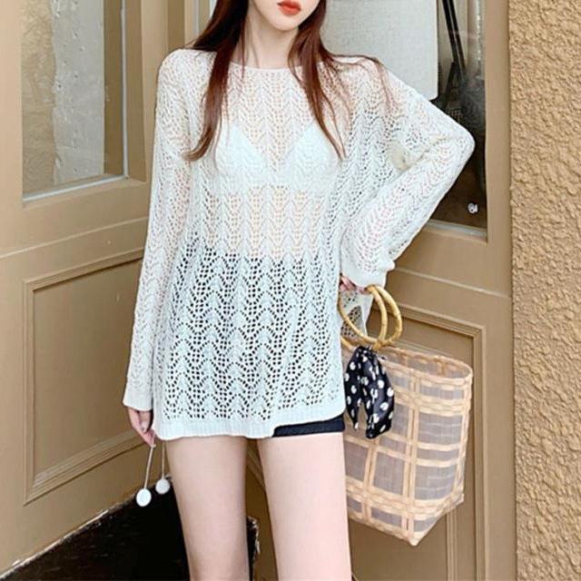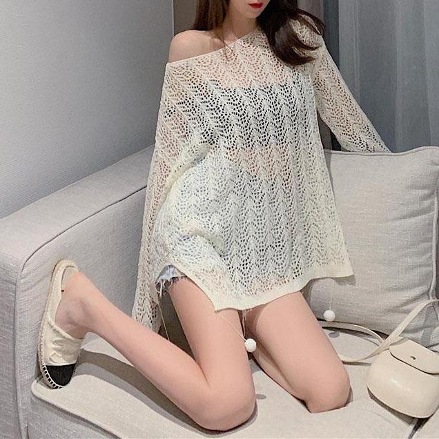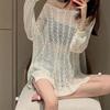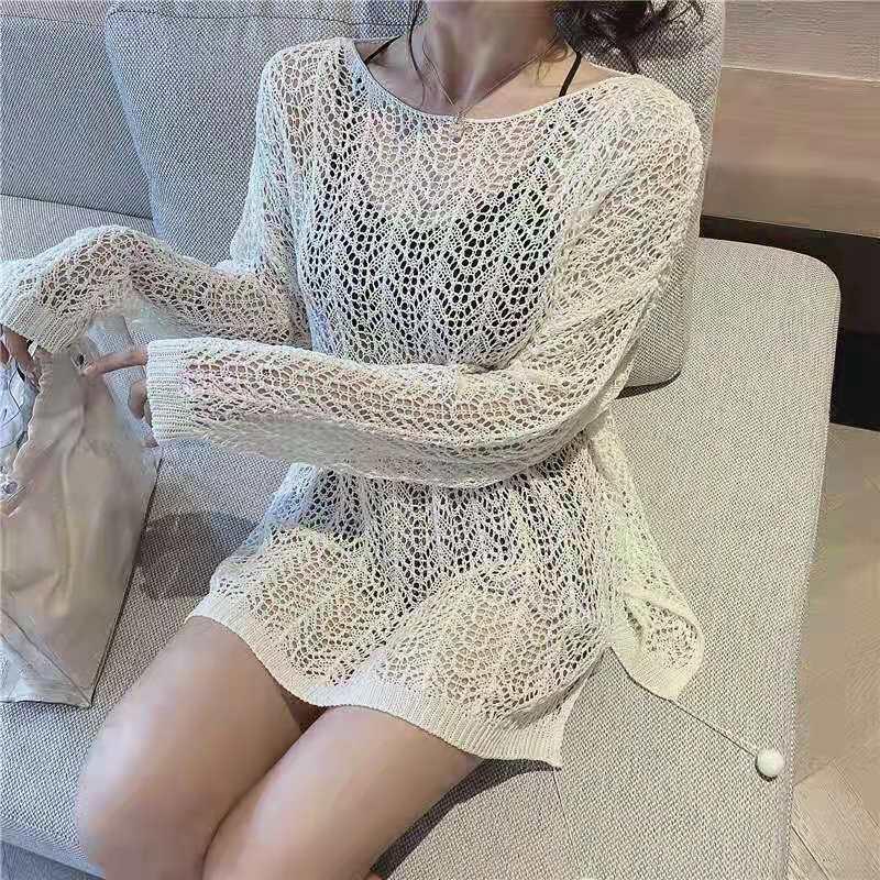 Suéter de Punto Calado con Hombros Descubiertos Blanco para Mujer Verano Verano Delgado Manga Larga Exterior Blusa para Aire Acondicionado Top Corto con Protección Solar