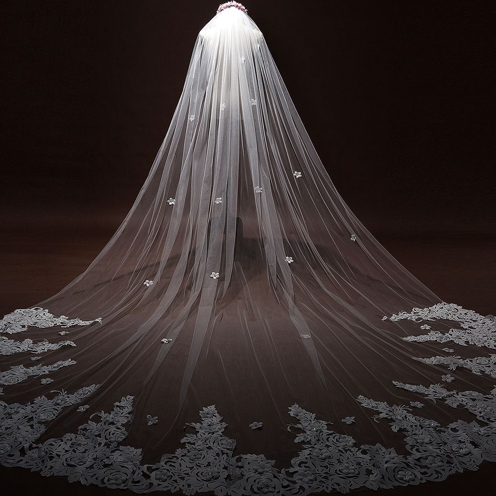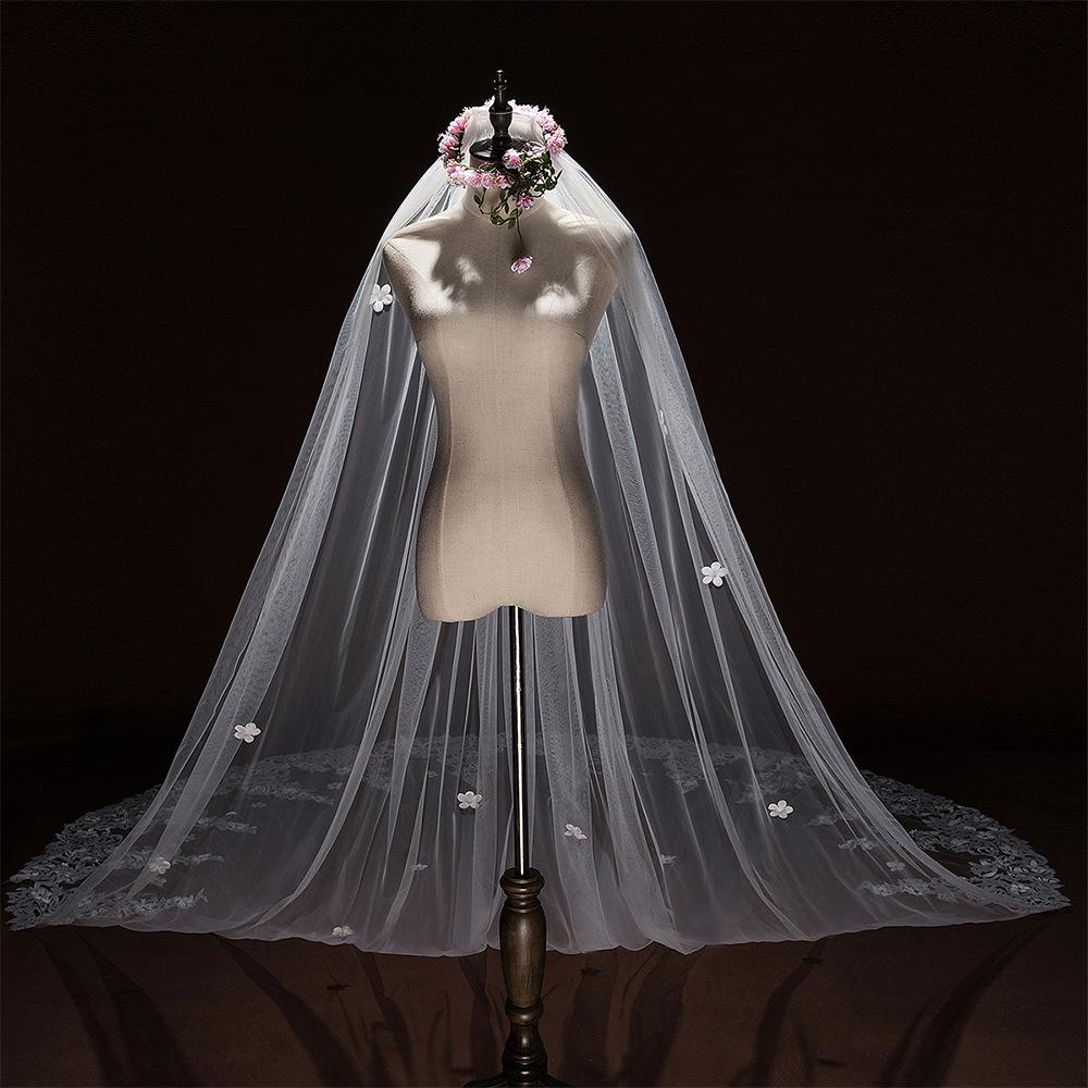Velo Transfronterizo Tocado Compromiso Vestido de Novia Foto Retrato Senior Encaje Francés Boda Súper Largo Cola Velo Suave Flor